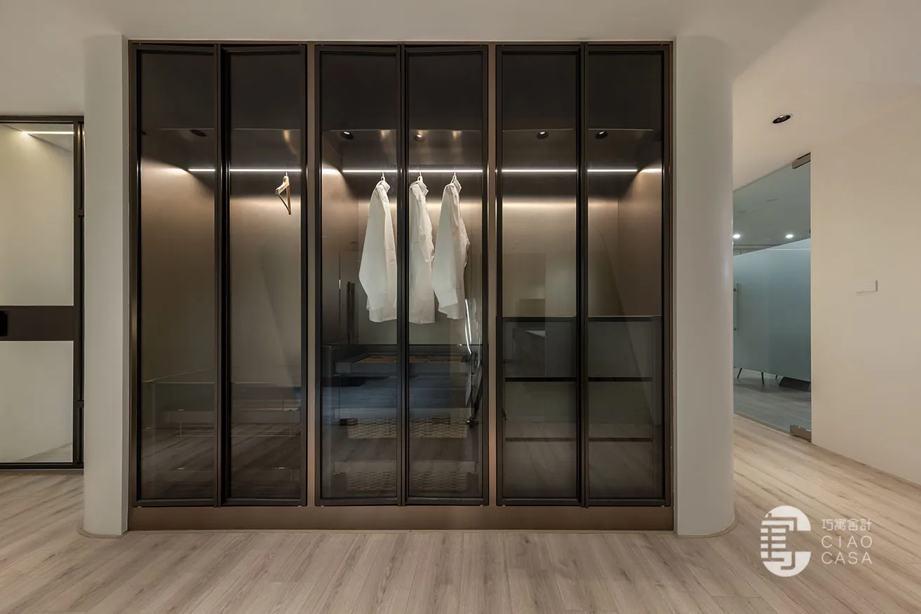 位於過渡地帶的鍍鈦衣櫥設計,作為展售木作櫃體的一環,藉由燈影暈染出的高級感,讓客戶感受到不只是商品本身,而是品牌精工細作的鐵藝質感與細節之美。