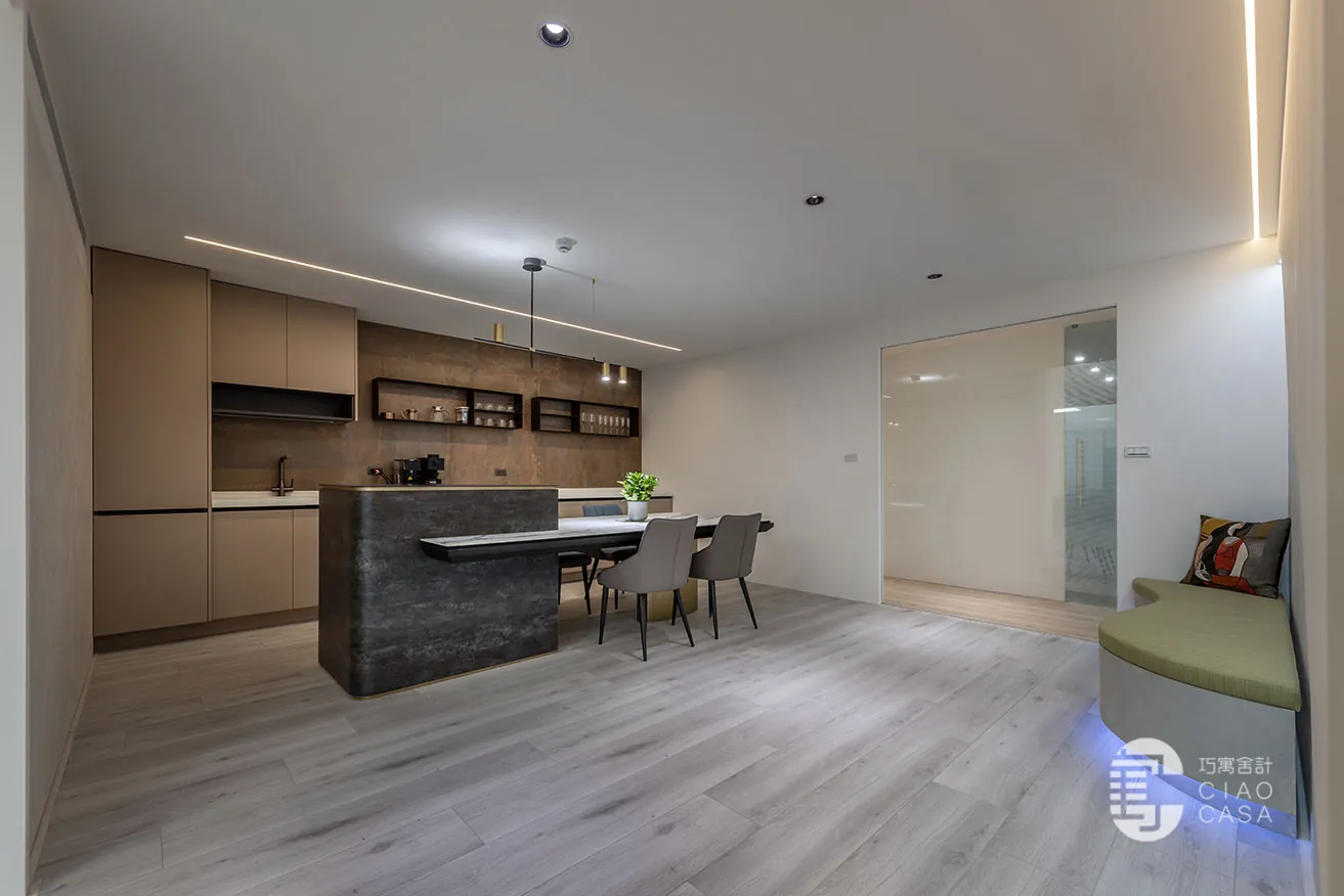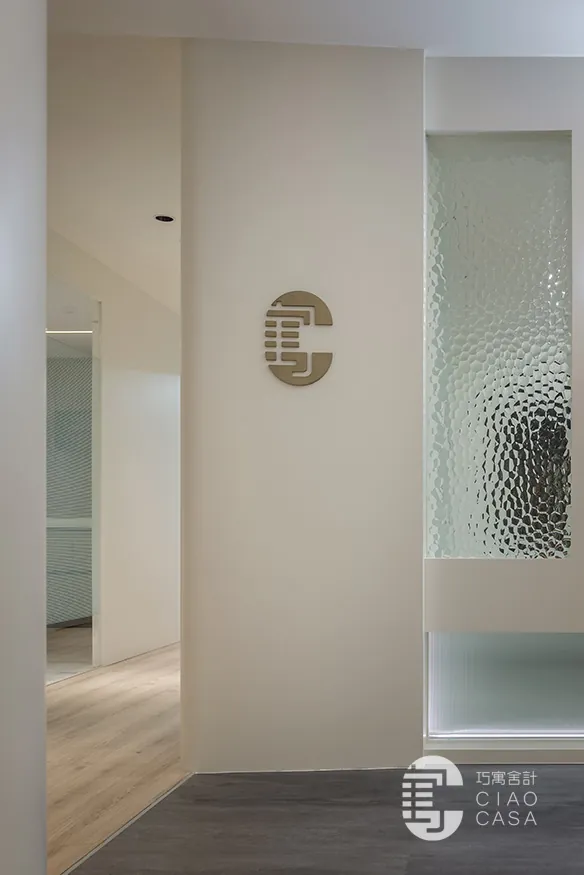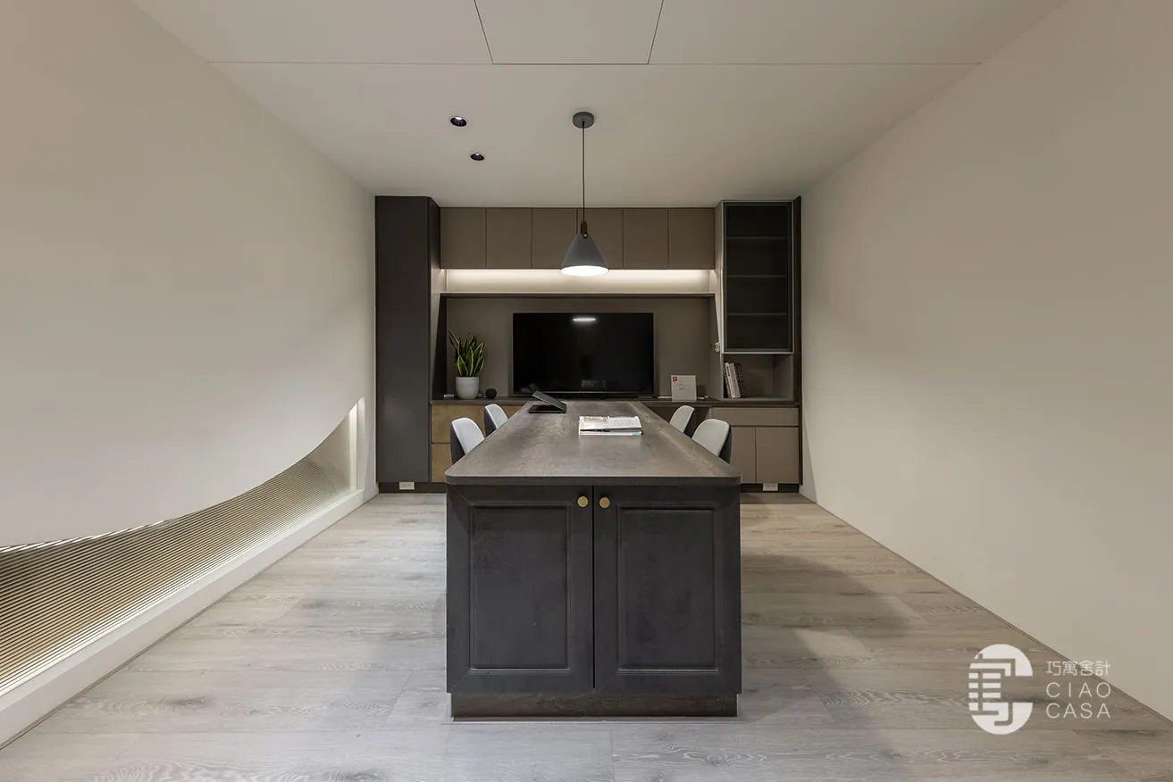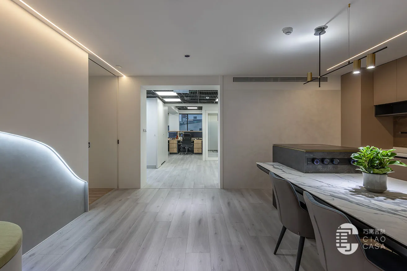 跳脫傳統肅穆的辦公室設計,巧寓舍計規劃了供員工休憩的多功能起居室,並利用電控調光玻璃,砌築與接待區明亮光感截然不同的「暗房」。