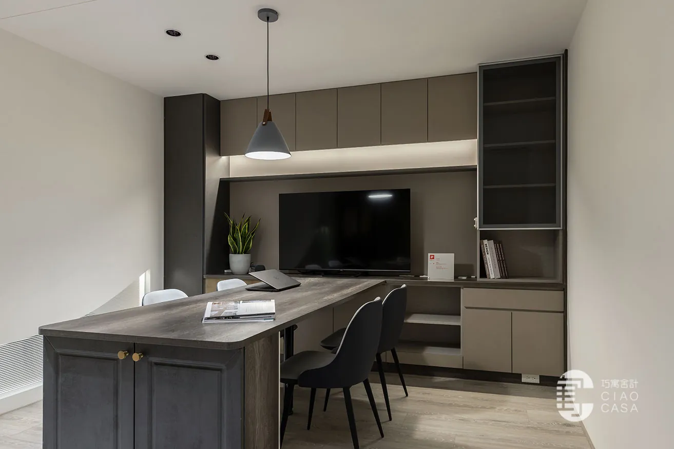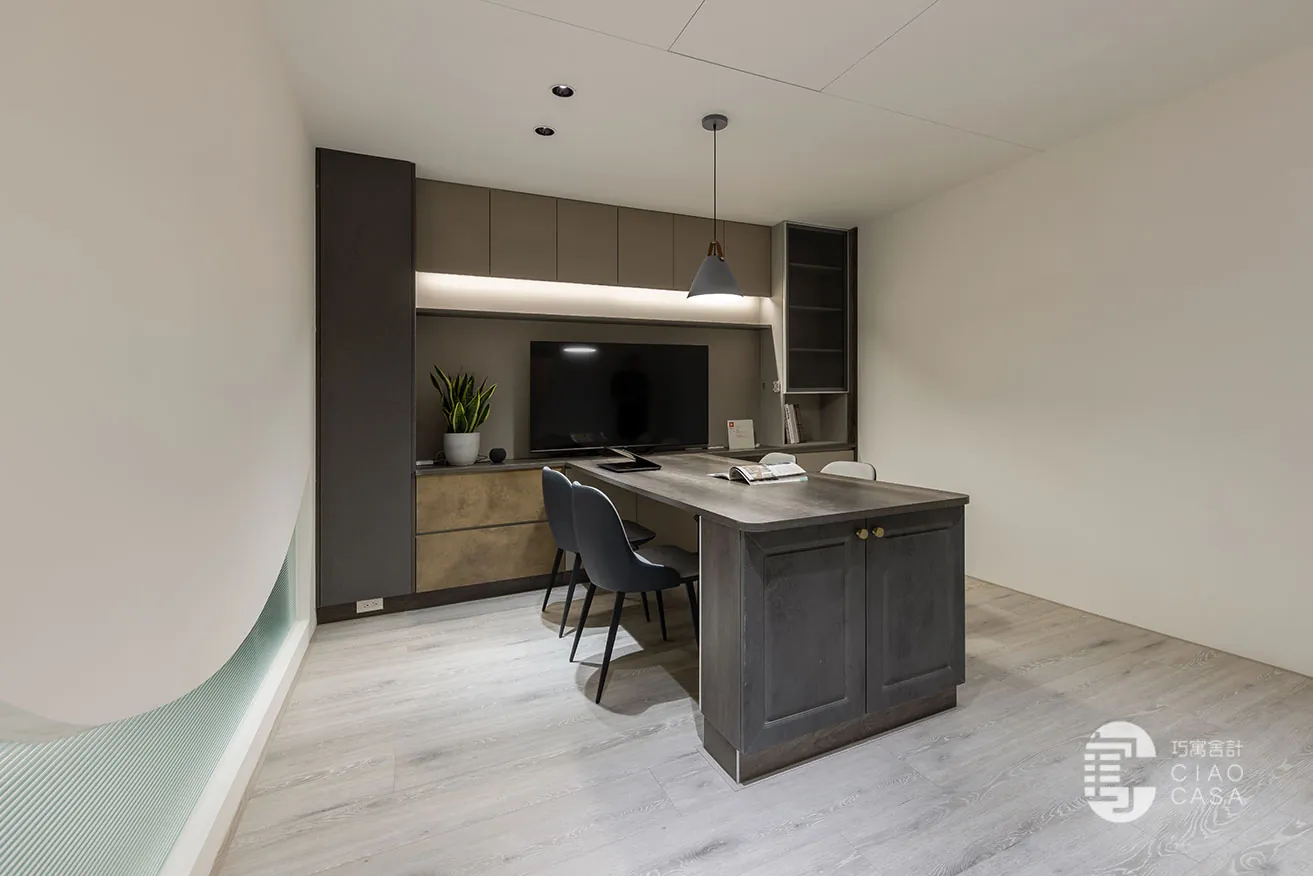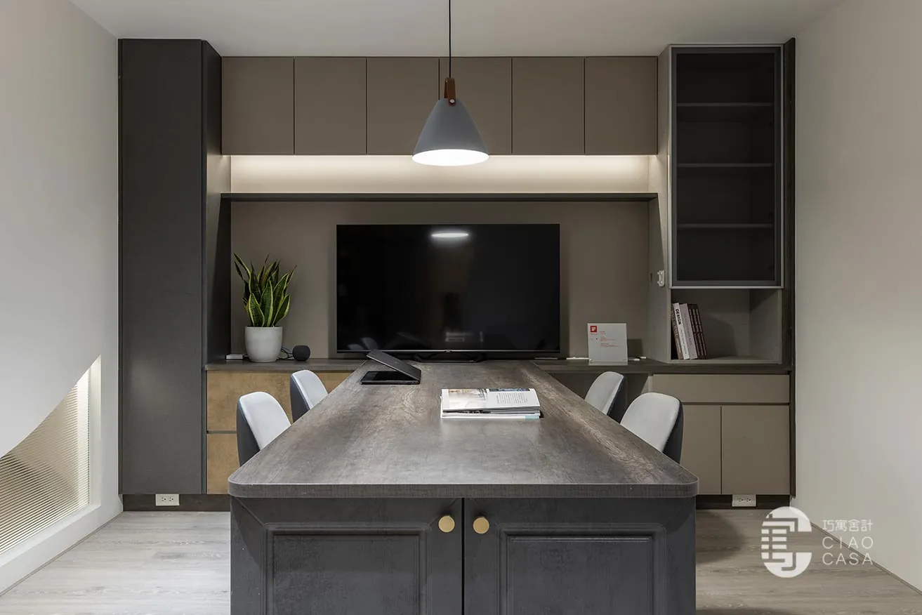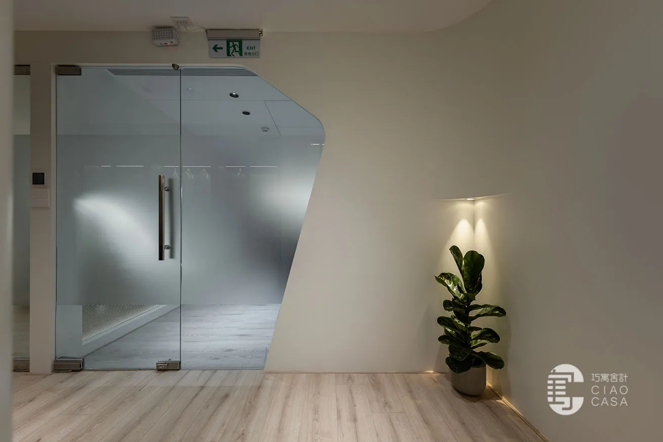 跳脫傳統肅穆的辦公室設計,巧寓舍計規劃了供員工休憩的多功能起居室,並利用電控調光玻璃,砌築與接待區明亮光感截然不同的「暗房」。