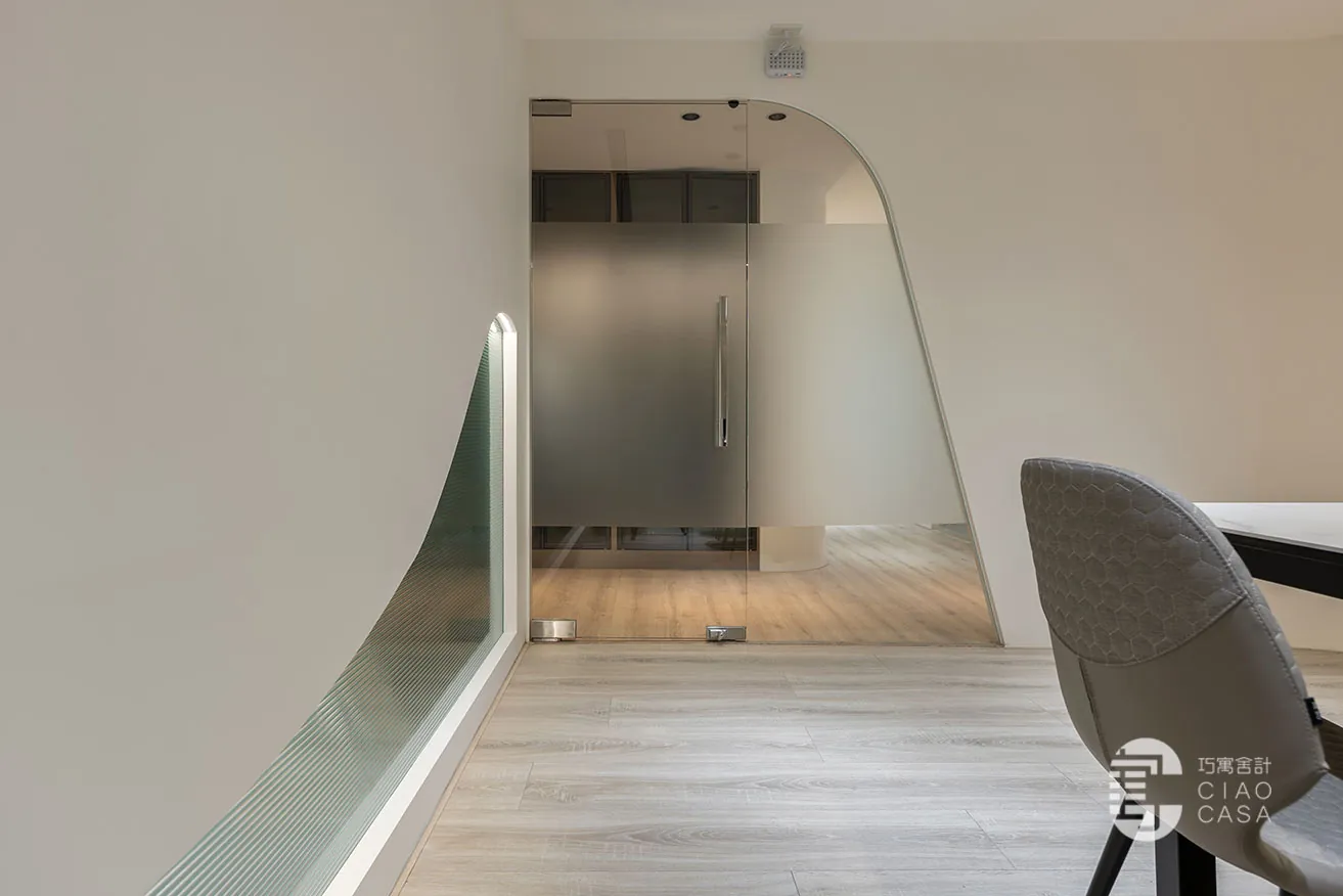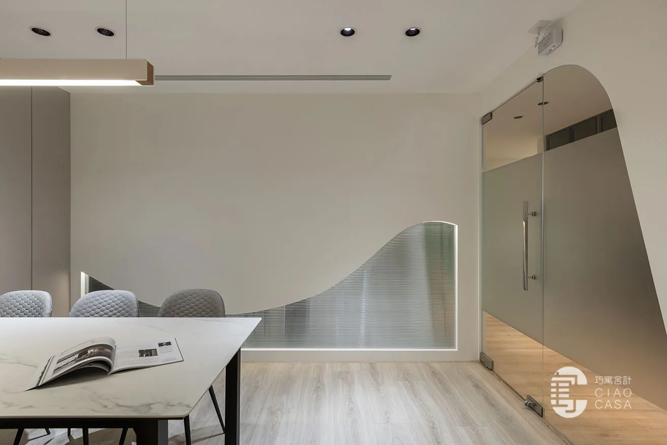 各會議室的立面與門口造型以獨特的流線弧面、幾何折線,展現出年輕設計團隊的創造力及工程團隊的精湛技術。同時,運用水立方玻璃、小冰柱玻璃和小波紋玻璃等媒材,與遊走其間的光影,奏響流動之美。