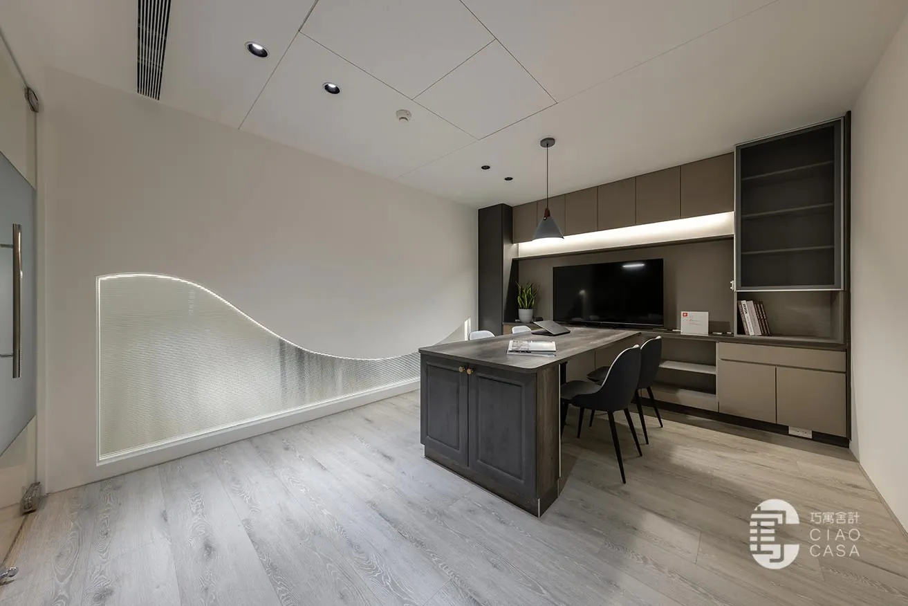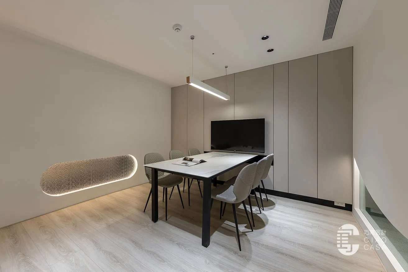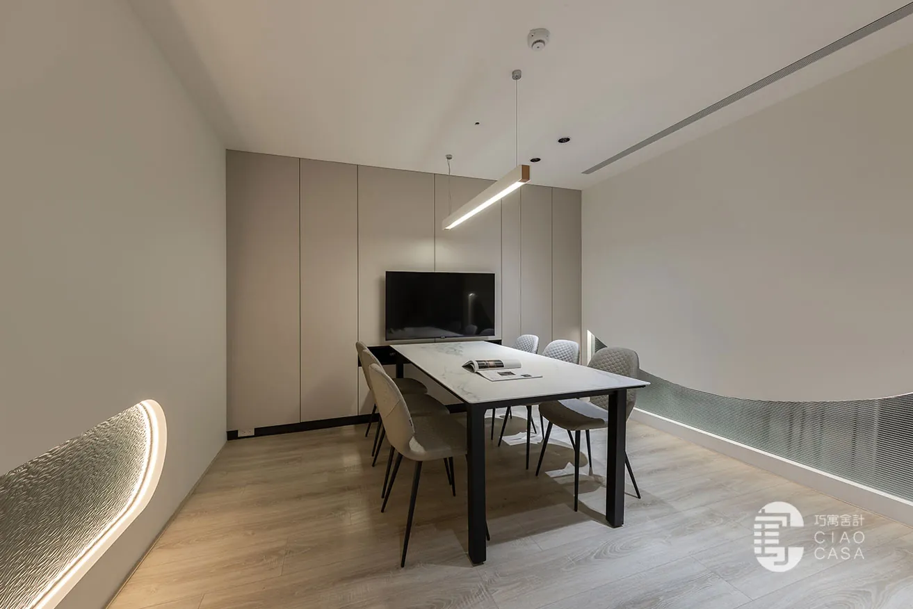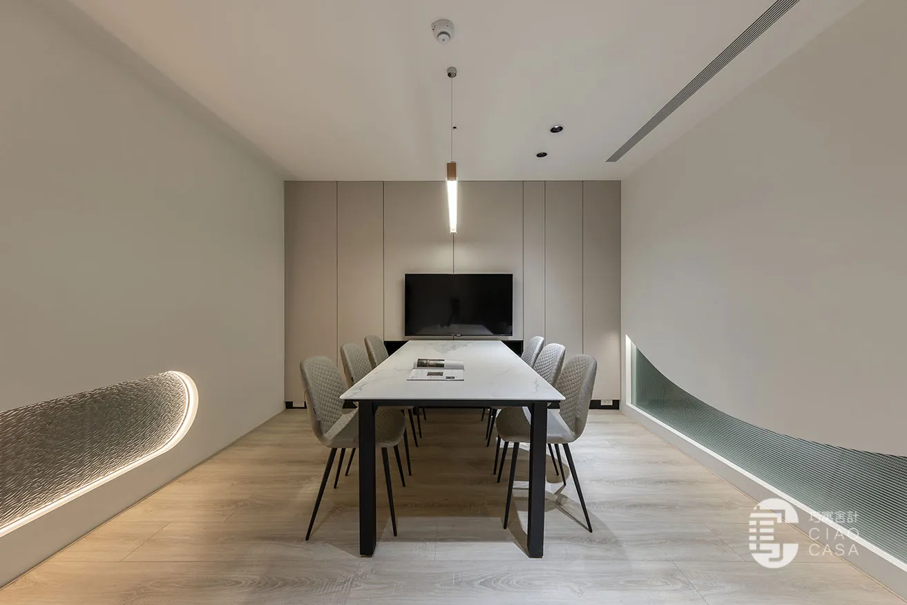 「光與影的變化」賦予整體場域層次豐富的質感,現代化氛圍和精妙的光影效果交織出通透、立體的視覺感受。各會議區域精心運用了透光不透影的設計,水立方玻璃、小冰柱玻璃和小波紋玻璃交相輝映,使自然光在空間內自由穿梭,增添了開放感與流動性,也豐富了視覺的層次。此外,智能家居系統整合燈光、冷氣等裝置,不僅便捷且提升了舒適度,讓每一位使用者都能在此感受優雅與高質感的場域氛圍。