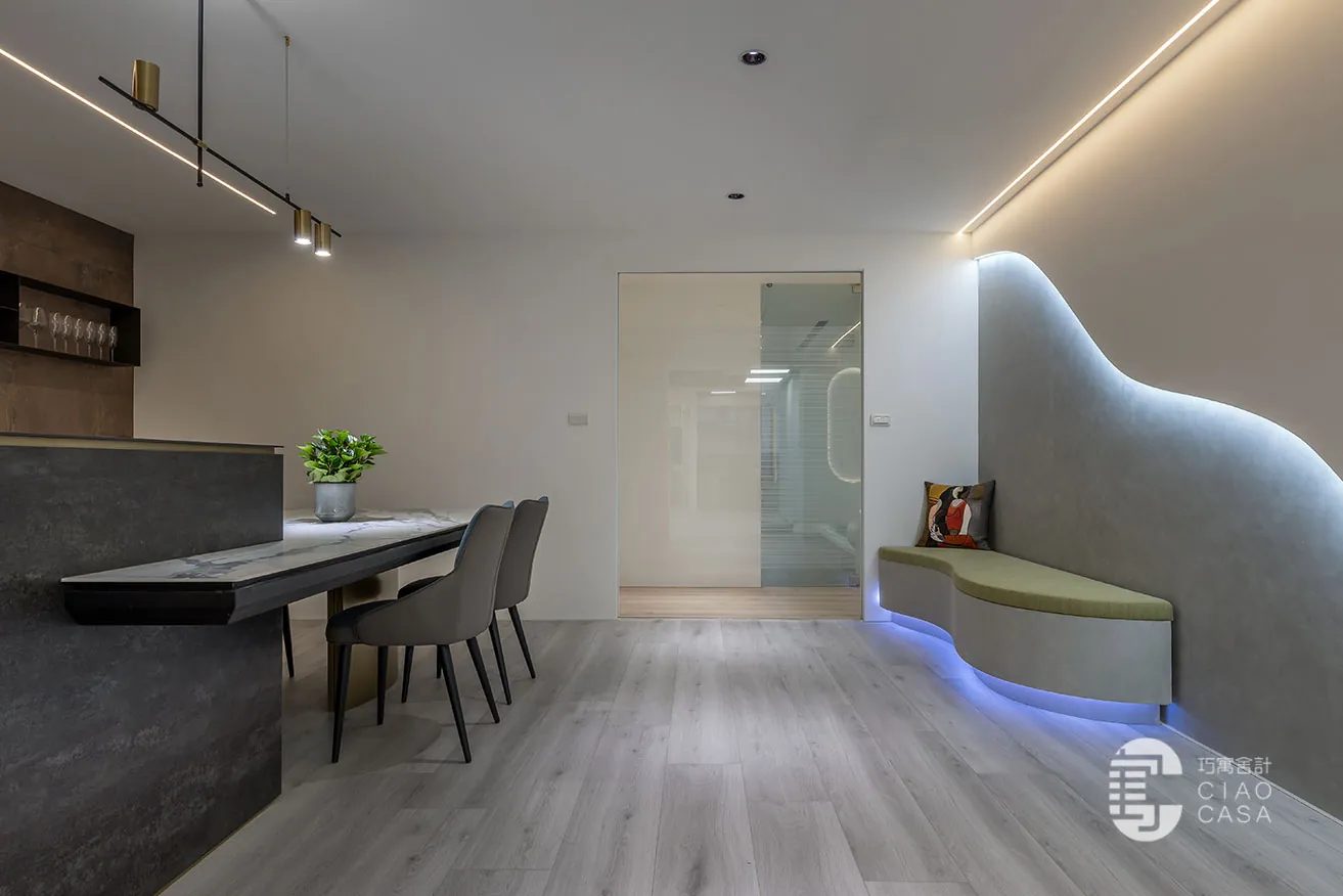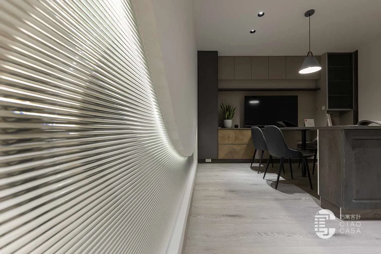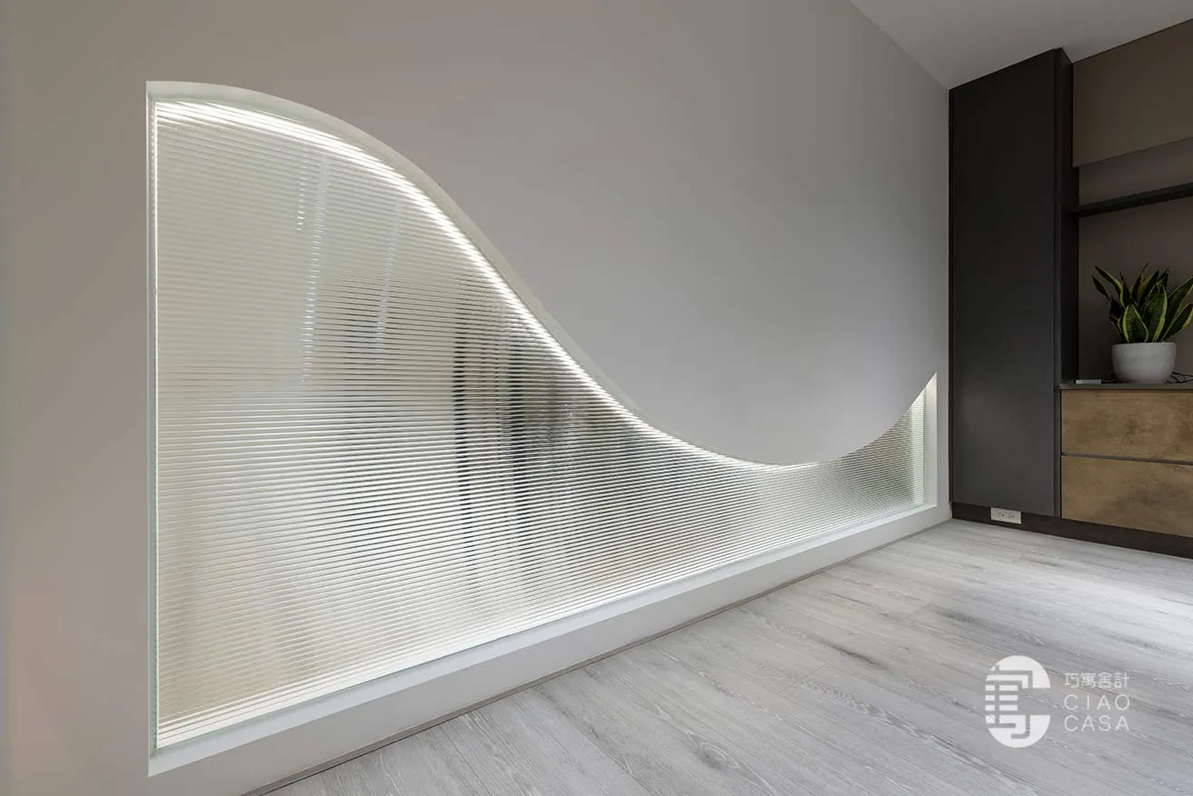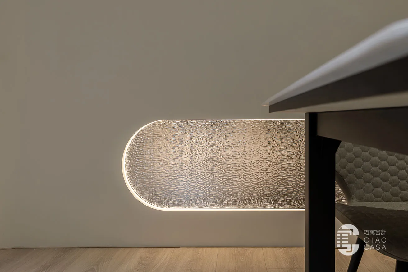 「光與影的變化」賦予整體場域層次豐富的質感,現代化氛圍和精妙的光影效果交織出通透、立體的視覺感受。各會議區域精心運用了透光不透影的設計,水立方玻璃、小冰柱玻璃和小波紋玻璃交相輝映,使自然光在空間內自由穿梭,增添了開放感與流動性,也豐富了視覺的層次。此外,智能家居系統整合燈光、冷氣等裝置,不僅便捷且提升了舒適度,讓每一位使用者都能在此感受優雅與高質感的場域氛圍。