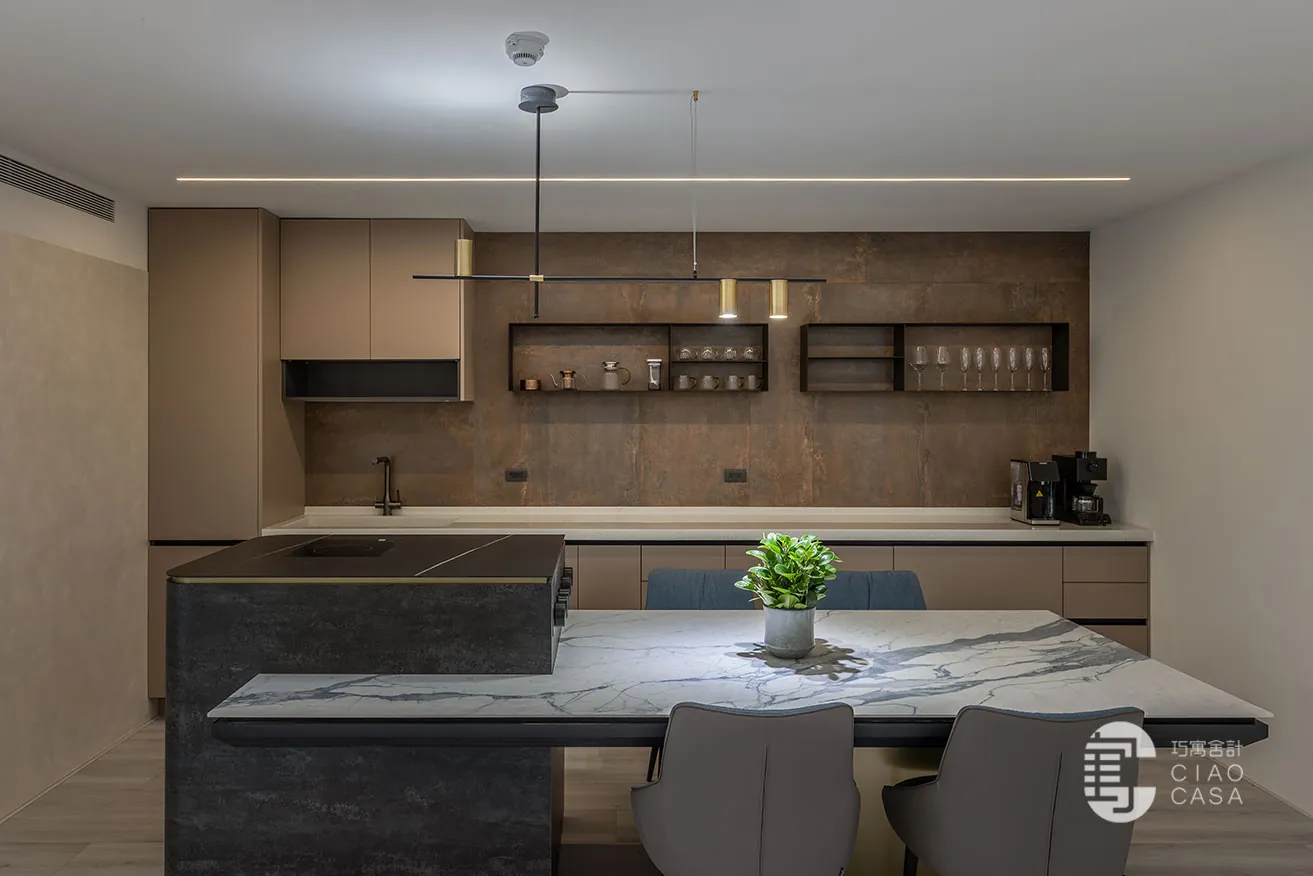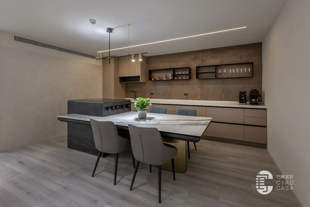 壁面以仿鏽磚及礦物漆細膩演繹,柔和光影鐫刻著斑駁紋理,織染出時光沉澱下的人文厚度;與鐵件結構層次之間的輕重比例,則在在尋求一種具表現力的畫面形式。高低嵌合的中島餐桌融入了電磁爐,表面以深淺對比的大板磚鋪敘,滿足社交、輕食等功能需求之餘,亦涵容藝術審美價值。