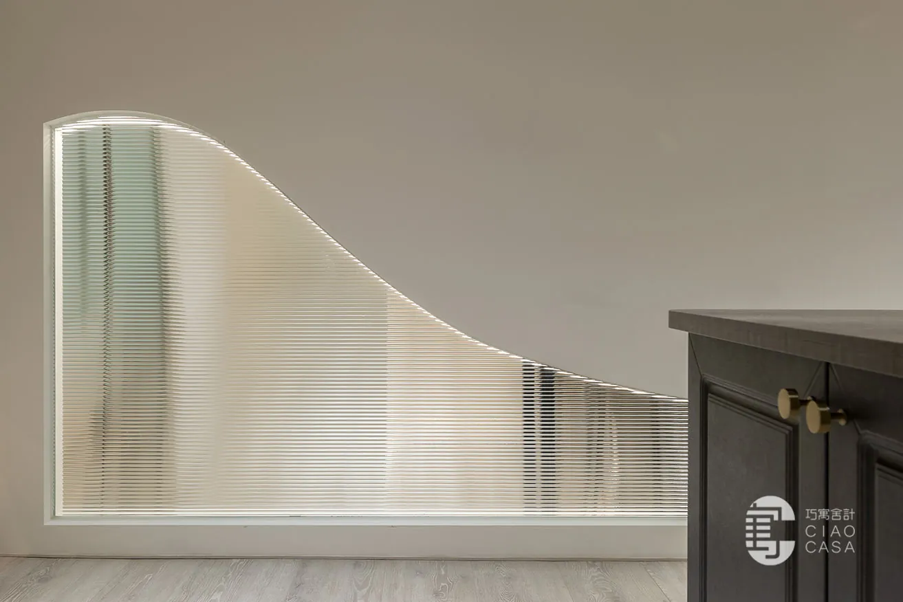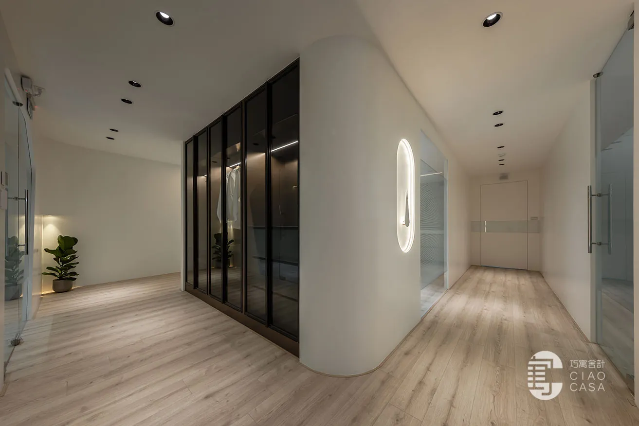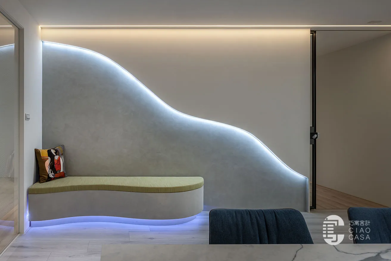 空間大幅度地伸展窗面比例,引援戶外的樹影與流光,牽繫起空間與自然的緊密關係,借助環保漆覆塗的簡潔構面,減少不必要的裝飾材,落實環保永續的美意。基於球體、弧面等幾何形體受光時,潛藏於明暗交界線下的紋影,會使畫面更加生動與立體,設計師遂在純白的背景中,揉入球形與自由曲線,捕捉隨時序變換的流光碎影,將生硬的量體化為極具生命力的有機型態,書寫下純粹雋永的韻律之美。
