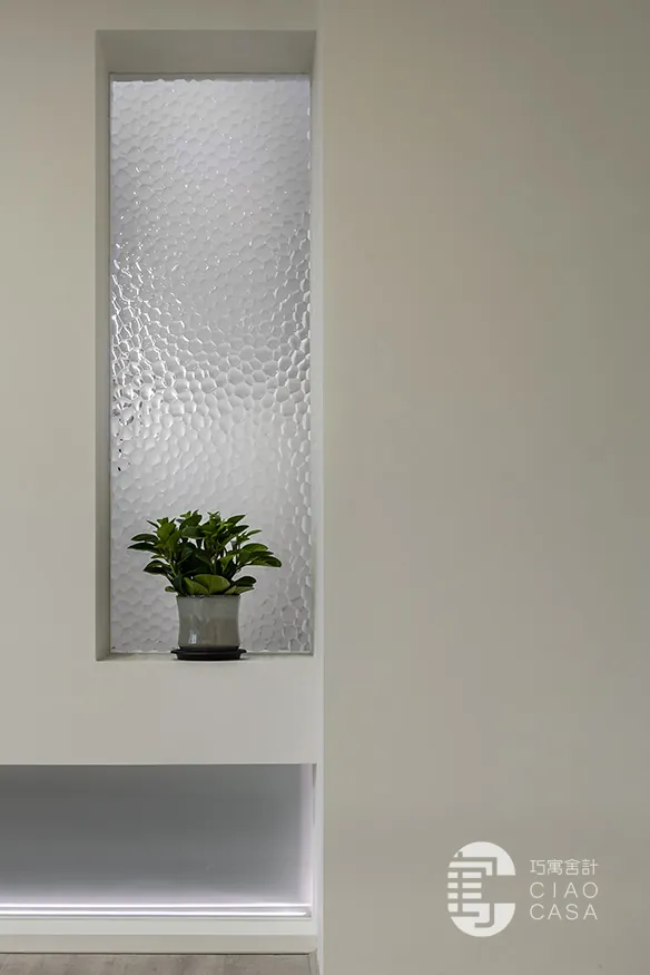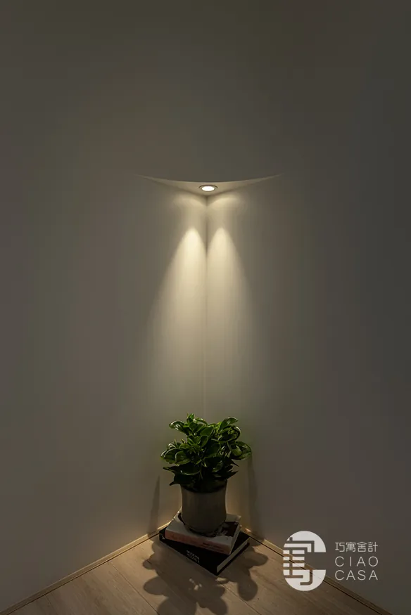 廊道底端一隅,採用反投射燈塑造角落端景,導引動線走向,綠意與柔光的結合,悄然勾勒一抹療癒內心的存在。