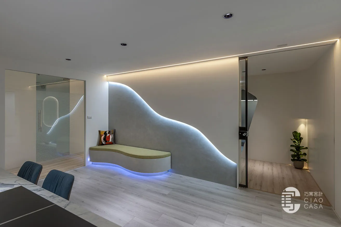 跳脫一般Showroom Office偏重於表面材和造型的表現,巧寓舍計總部以「光」為主要敘事語言,結合當代幾何建構手法,透過光影與通透媒材交互演繹的層次變化,創造出深刻且多維度的感官體驗,既滿足新一代消費者對「智能家居」與「情境變換」的精緻生活追求,更以新穎有趣的空間形象,為品牌挹注年輕活力,進一步傳遞出創意與嶄新的價值主張。