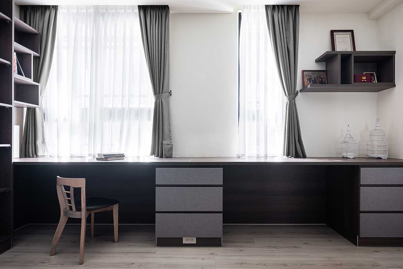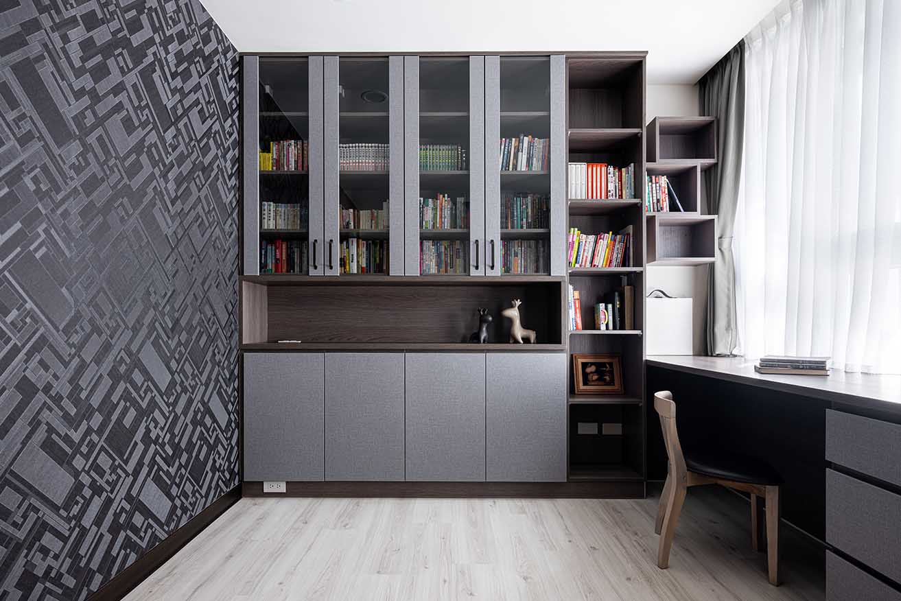 別於簡淨質調,書房轉換成深灰幾何壁紙烘托截然不同情境,切牆書桌以深棕與織布紋層板擴展寬敞尺度,雙人配置同時滿足夫妻倆得心應手的辦公閱讀專區,立面則用層板框構錯落不規則的格狀展架,為空間注入豐富立體變化。