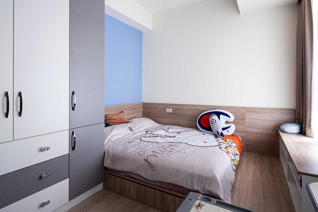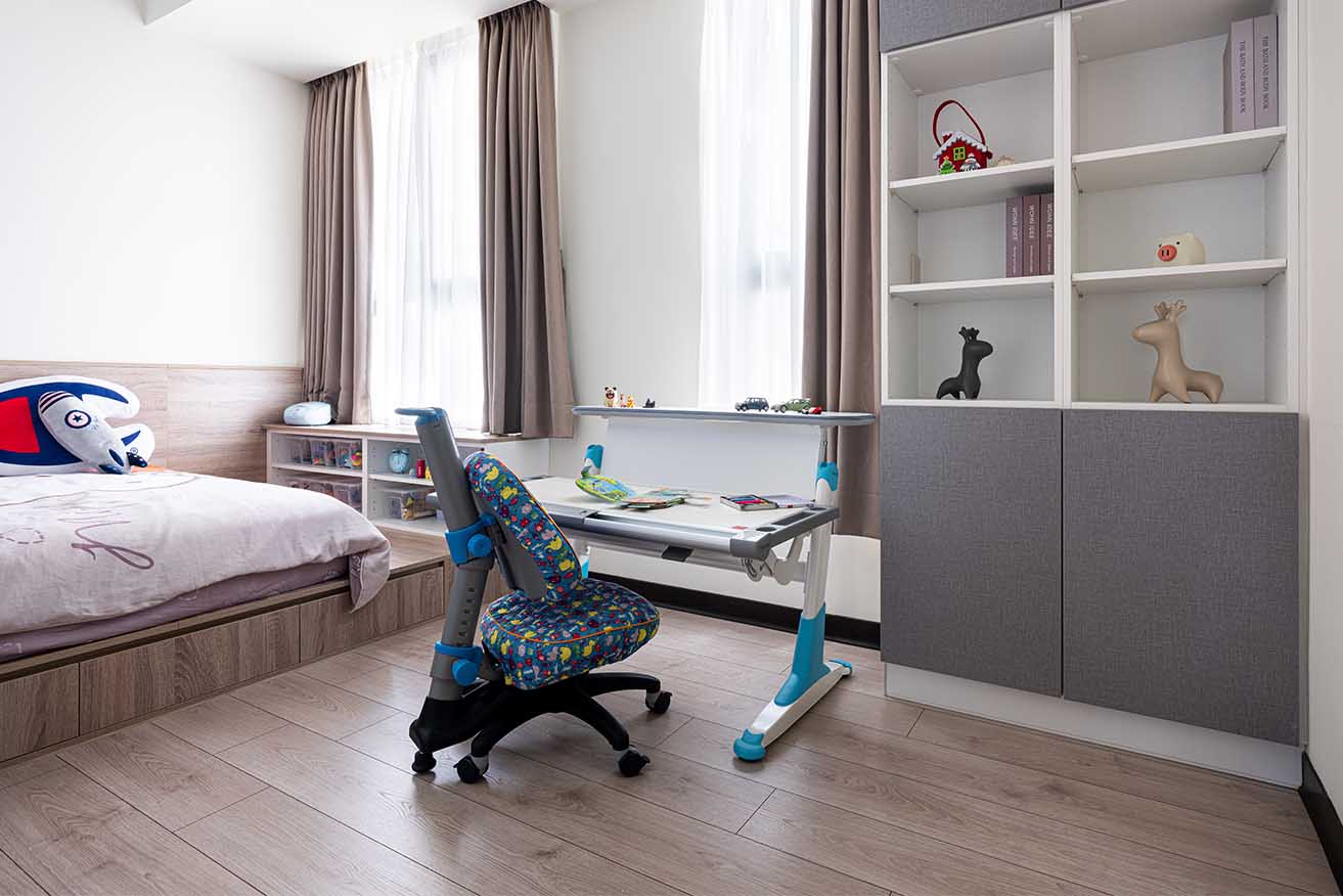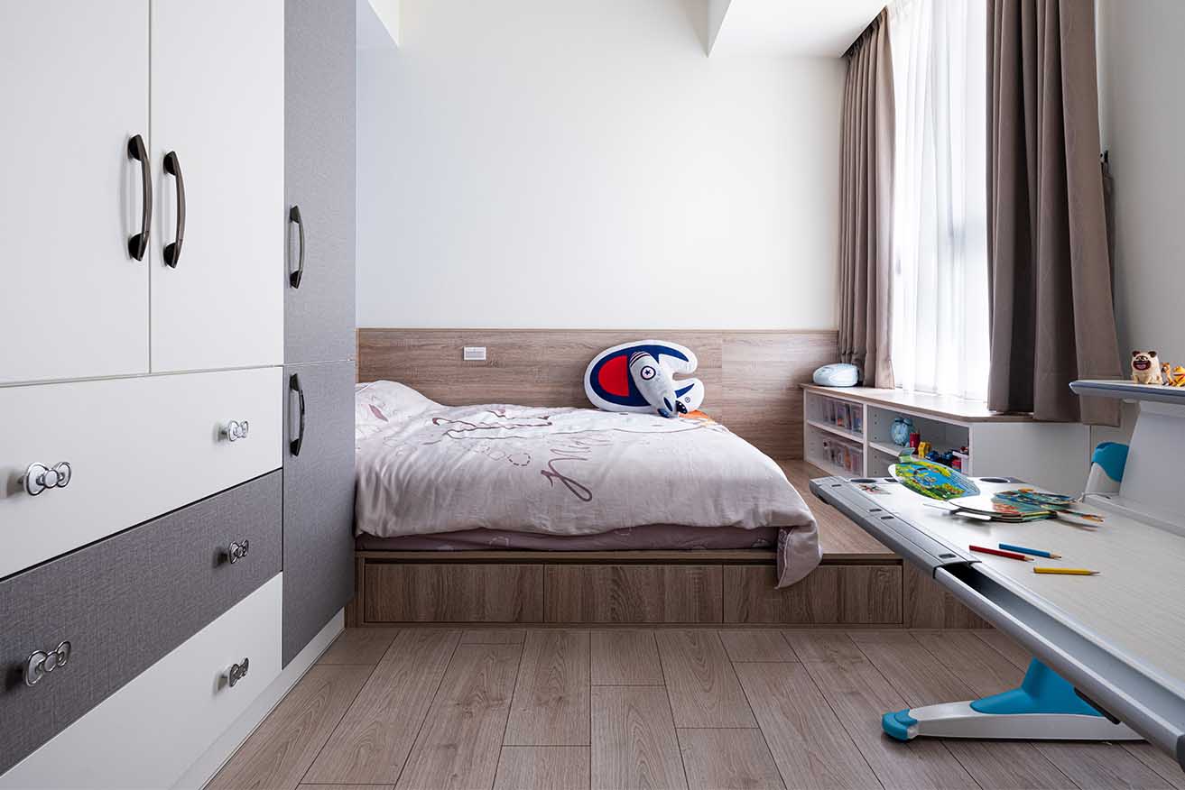 因應孩子成長快速,一側選配兒童調整式書桌以便彈性運用,臥眠區則特意抬升整體高度,選用咖棕木紋系統板材從地坪延伸至床側壁面。