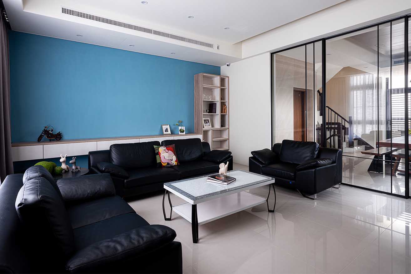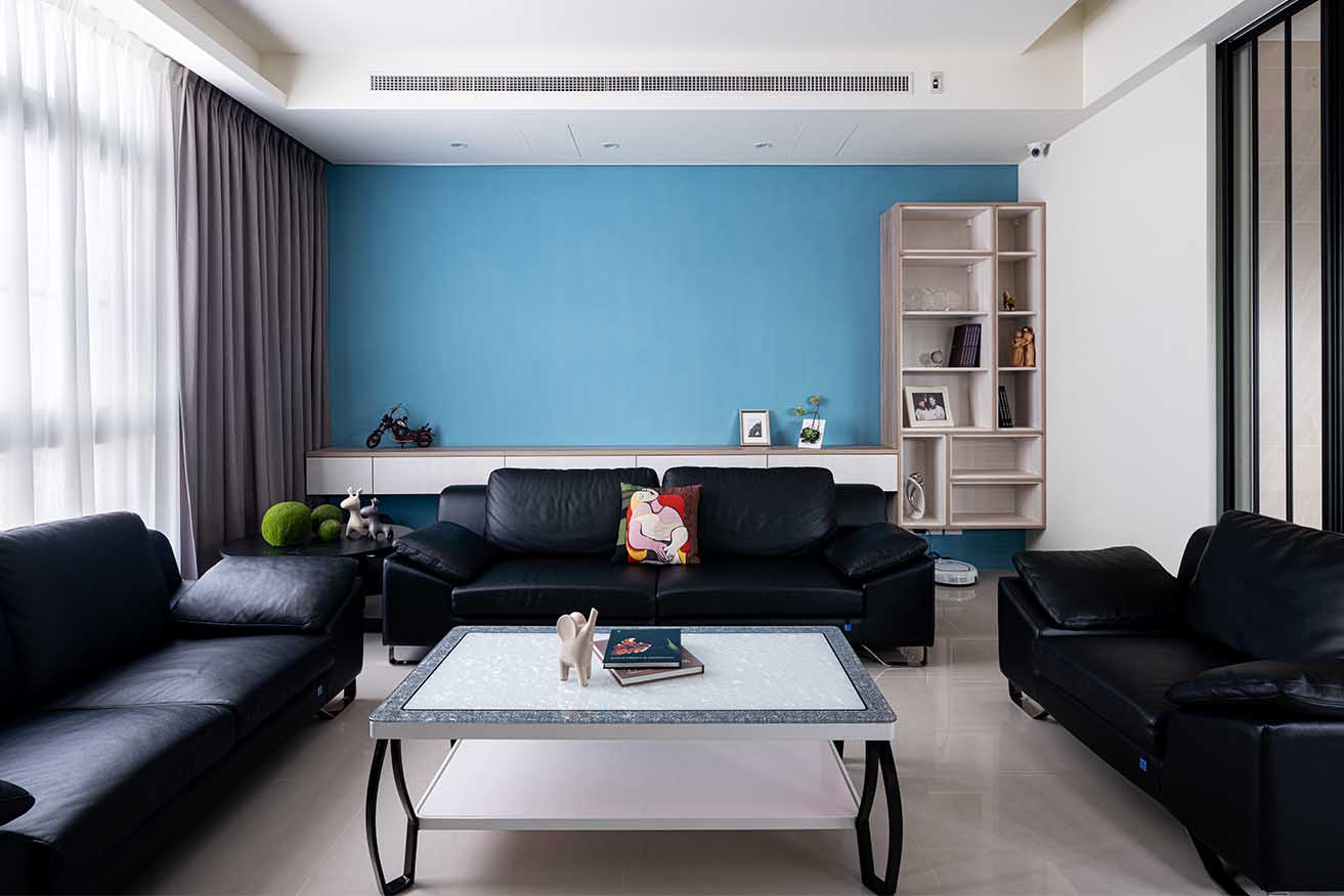沙發背牆漆繪天空藍活潑沈靜基底,並於腰牆處植入淺木紋抽屜懸吊櫃,側邊特意交錯雅白門片,捏塑為一道輕盈的展示平台。