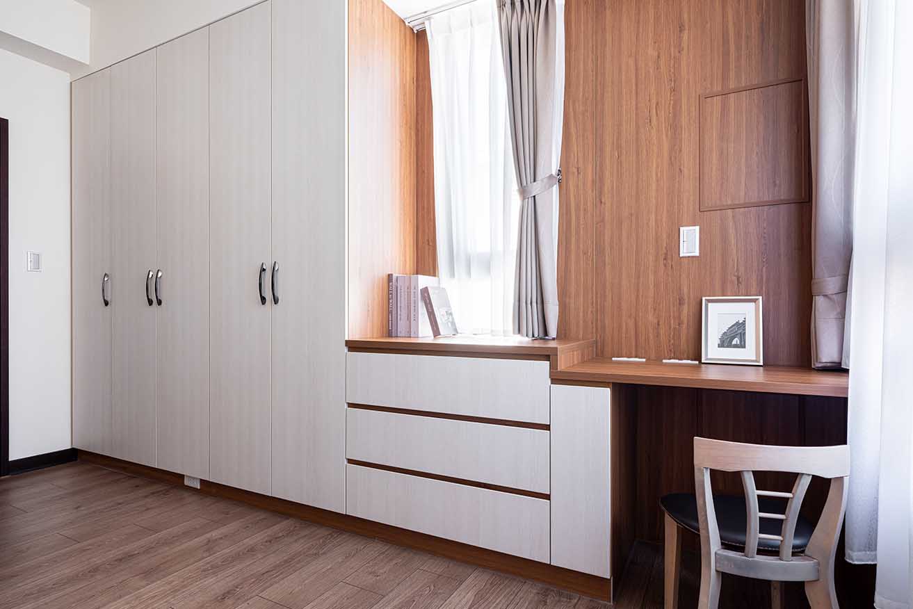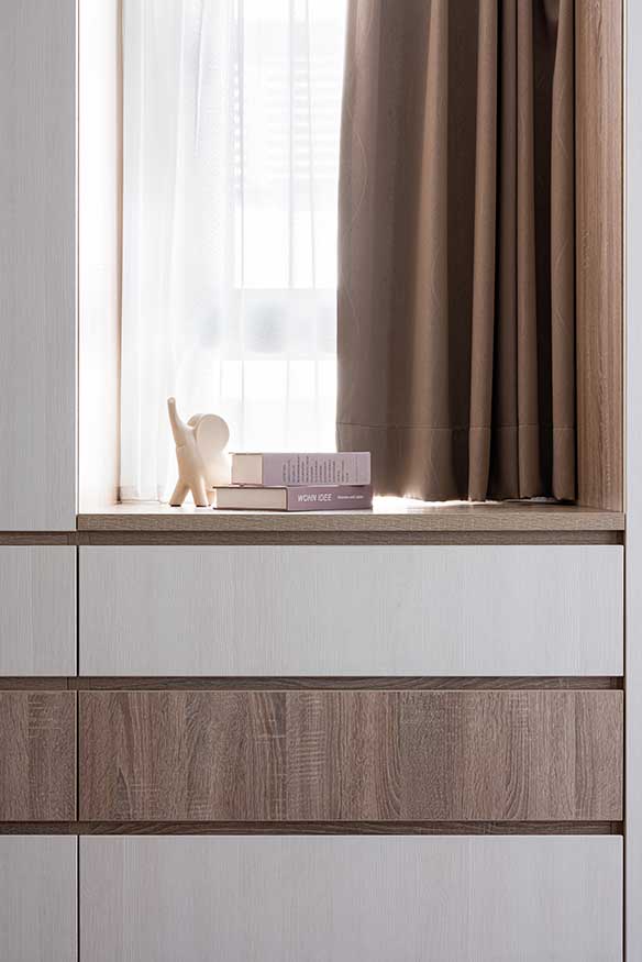 隔牆增添一道滑門敞開既開放且獨立的起居空間,以貼合牆面白色木紋衣櫃展開無遮蔽視野,採用柚木紋板從窗框、牆面接續包覆至桌檯,藉以完美掩飾電箱蓋,任由自然紋理挹注溫潤氣息,梳妝桌下左配挑選側拉式收納櫃,內層輔搭五金妥善置放瓶罐日用品。