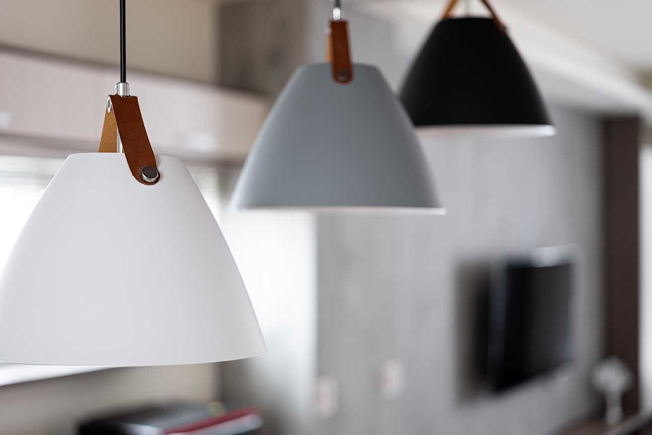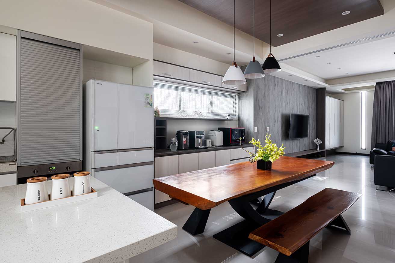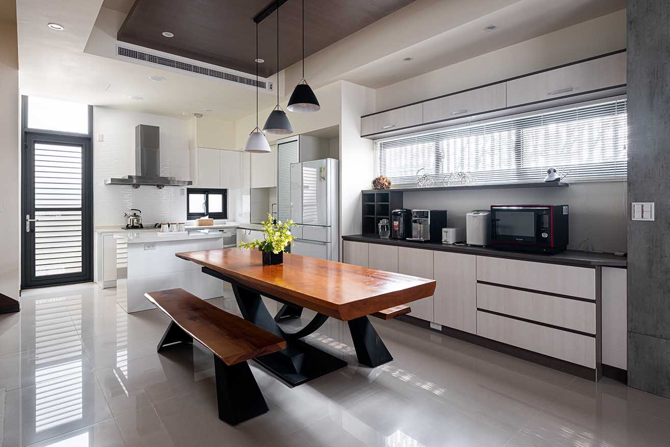 言談中得知屋主喜愛天然原木質感,天花板中段悉心貼覆深棕木皮綴飾,不僅為純白調空間堆疊立體層次,亦與極具張力的沈穩原色黑腳餐桌椅相互呼應,妝點漸進垂掛三盞簡約餐吊燈,烘托溫潤愜意的用餐場景。