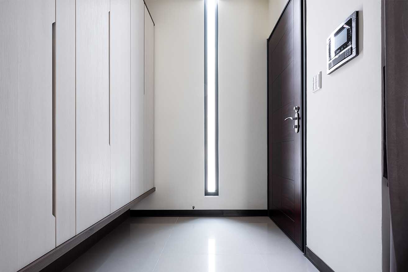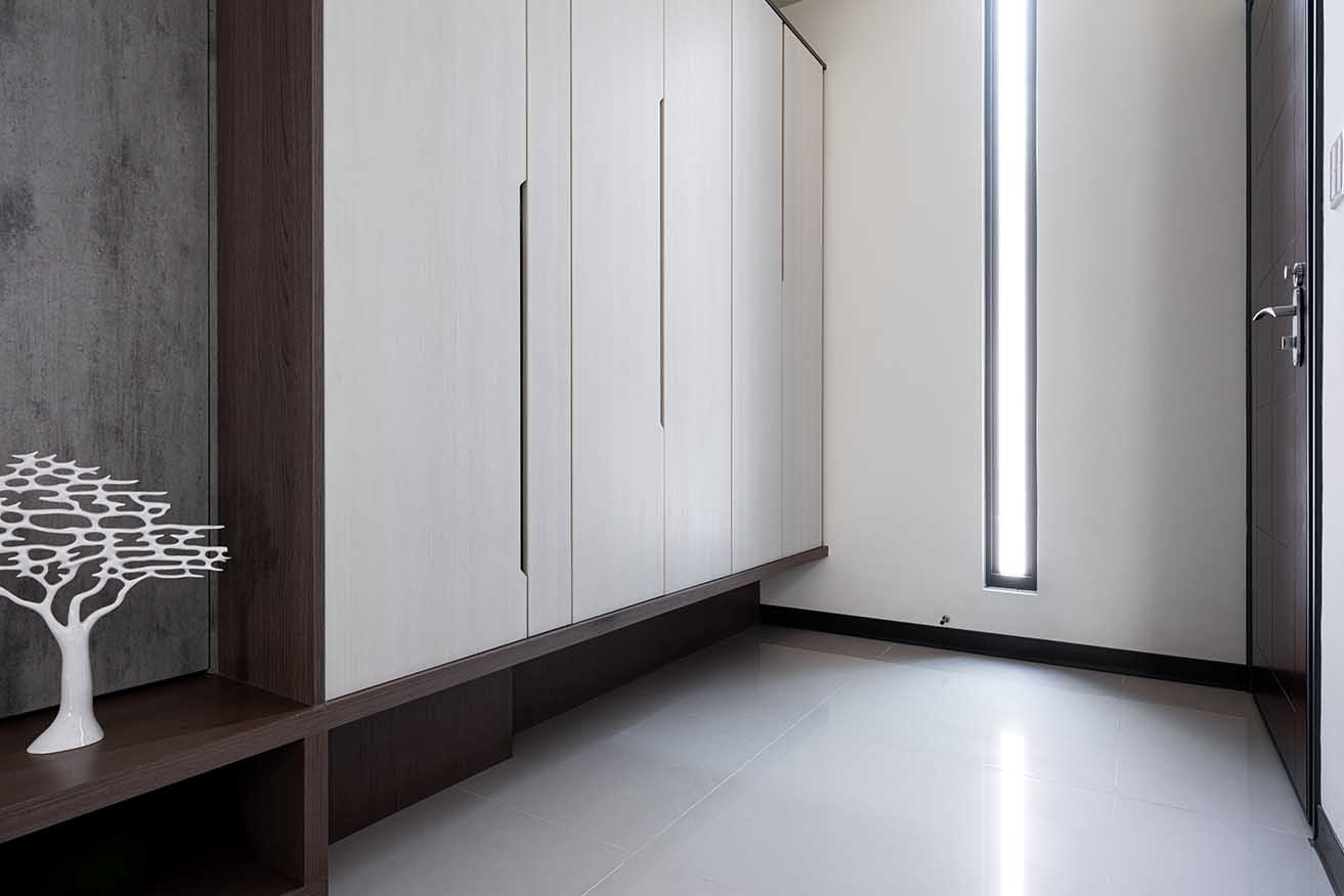 甫踏入中庭門道,以大尺度亮滑地磚鋪展透亮基調,落塵區依循牆面以系統板材築起一面收納鞋櫃,底層特意懸空消弭負重視感。
