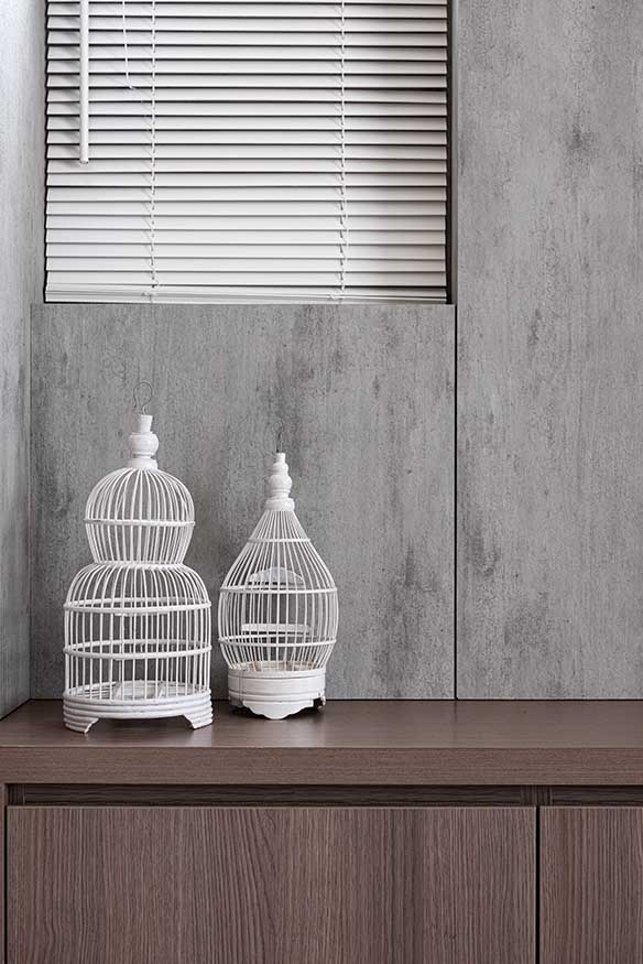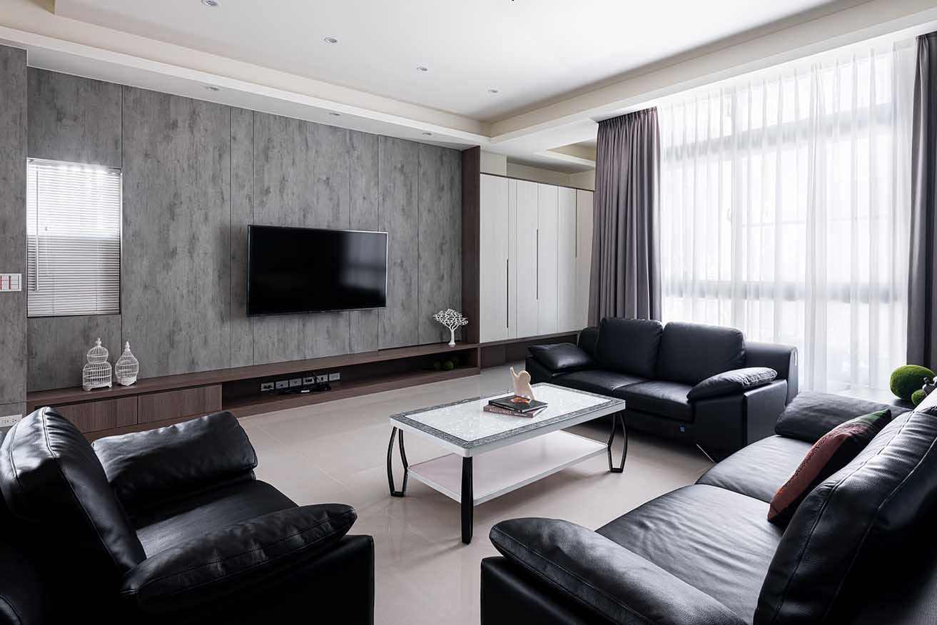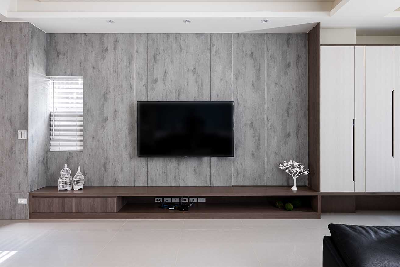 為了回應屋主喜好,客廳主牆鋪排素雅清水模紋理造型板,側邊依循原有結構保留開窗設計,經由濃淡不一的手感肌理堆疊柔和層次,並接續包覆至餐廚壁柱,延展水平空間感,下層串連沈穩棕木紋開放式視聽矮櫃,切齊鄰側懸空鞋櫃維持視覺連貫性,同時將影廳設備妥善收整。