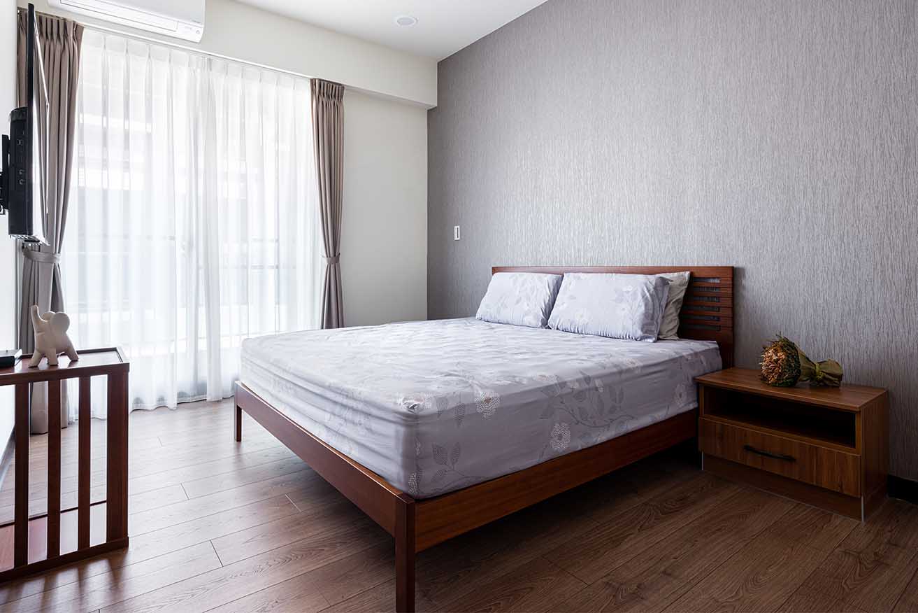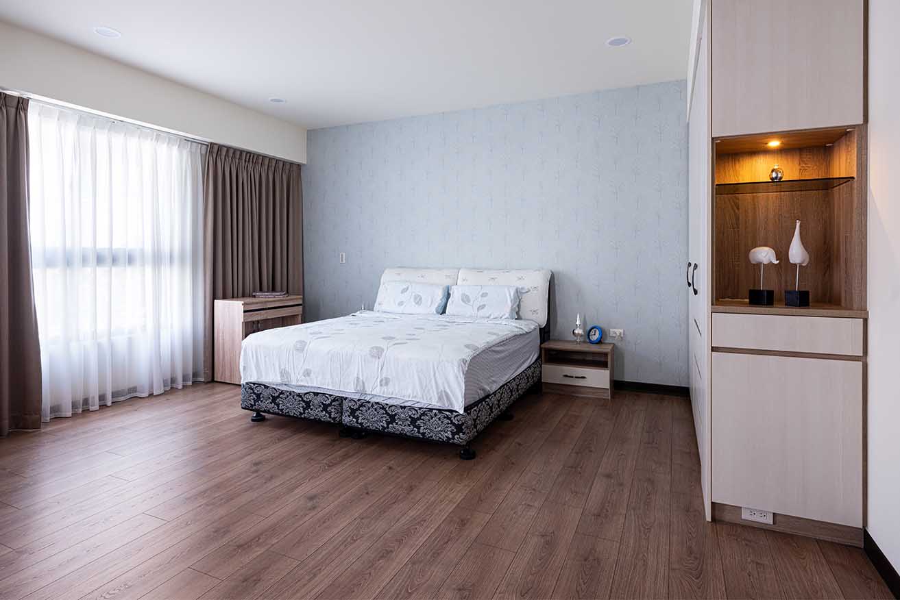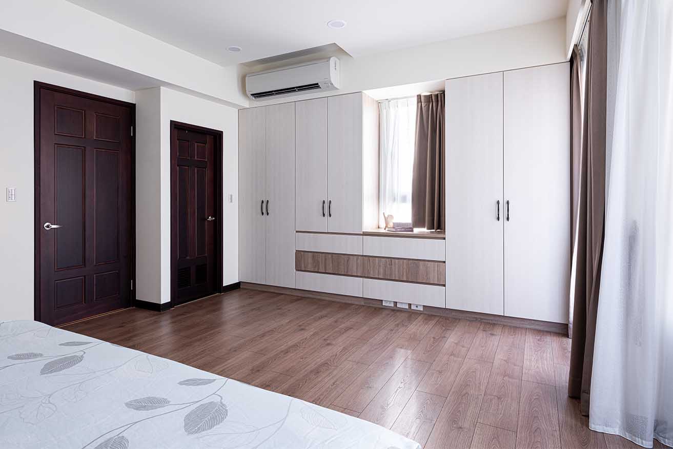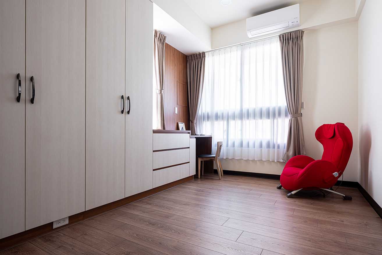 有別公共空間地磚呈現,臥房均改以深棕超耐磨木地板鋪展舒心基底,為貼近屋主企盼的開闊視野、流暢動線,幾經思量決定揮別獨立更衣間作法,主臥不採繁雜贅飾,聚焦於無壓且機能十足的好眠環境。
