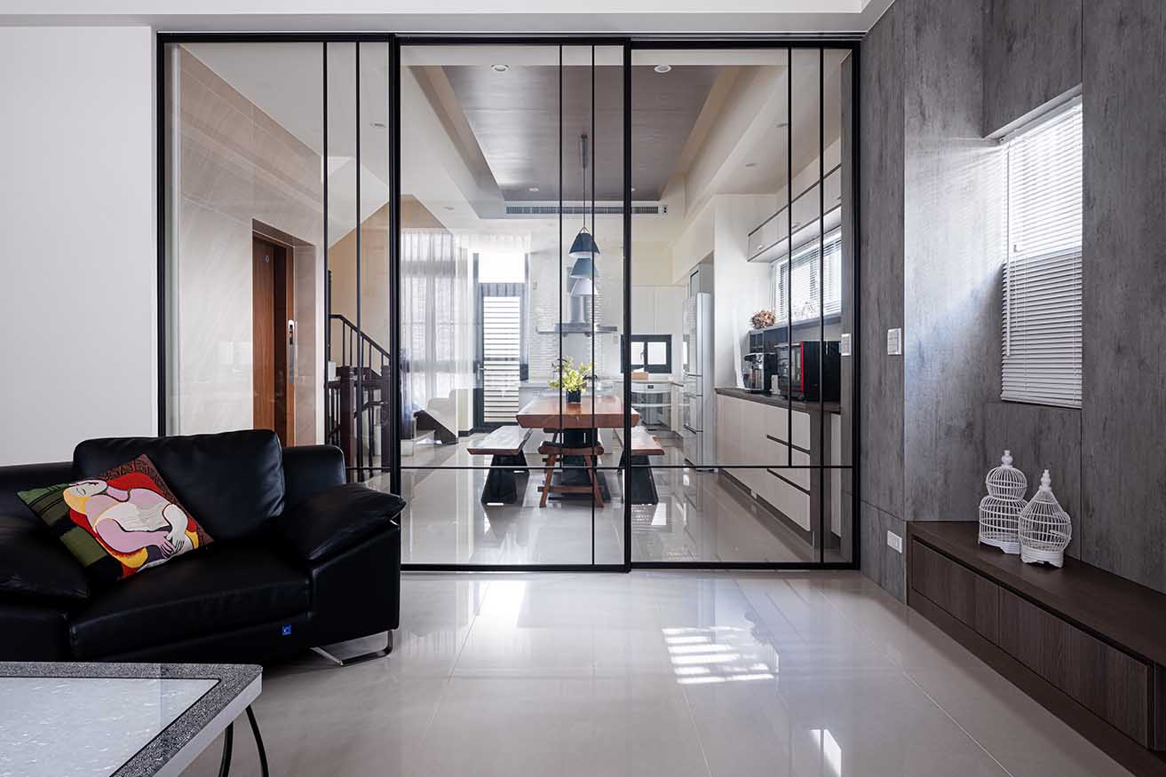 考量開放公共空間冷氣溢散問題,客廳與餐廚之間添裝黑框通透拉門,築起靈活無拘束的區域分野,並藉其輕透特性穿引前後端採光,明亮水平樓層。