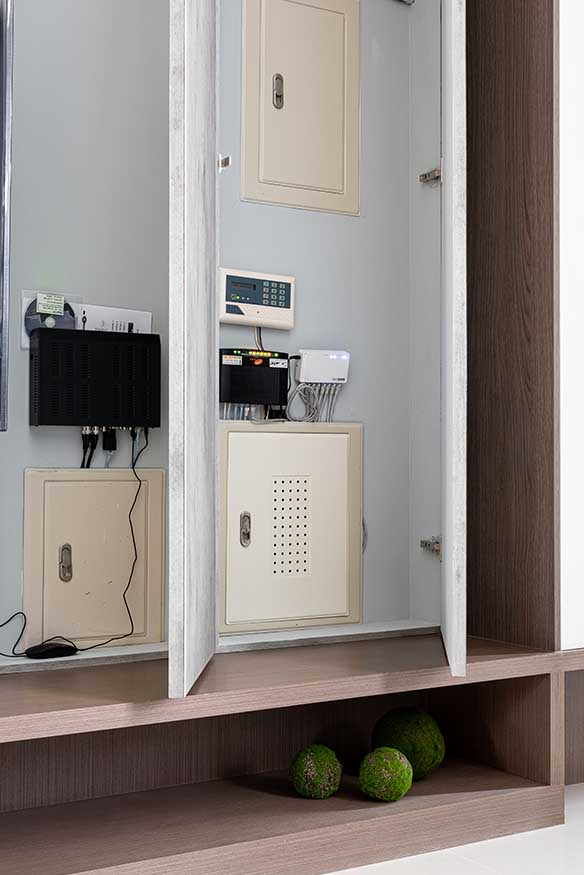 串接電視牆一側,為維繫簡約氣息,悉心延展清水模質感電視牆尺度,選用兩道拍拍門片將電箱設備隱於無形,藉以擴展簡潔且無阻斷的電視牆設計,延續和諧一致基調。