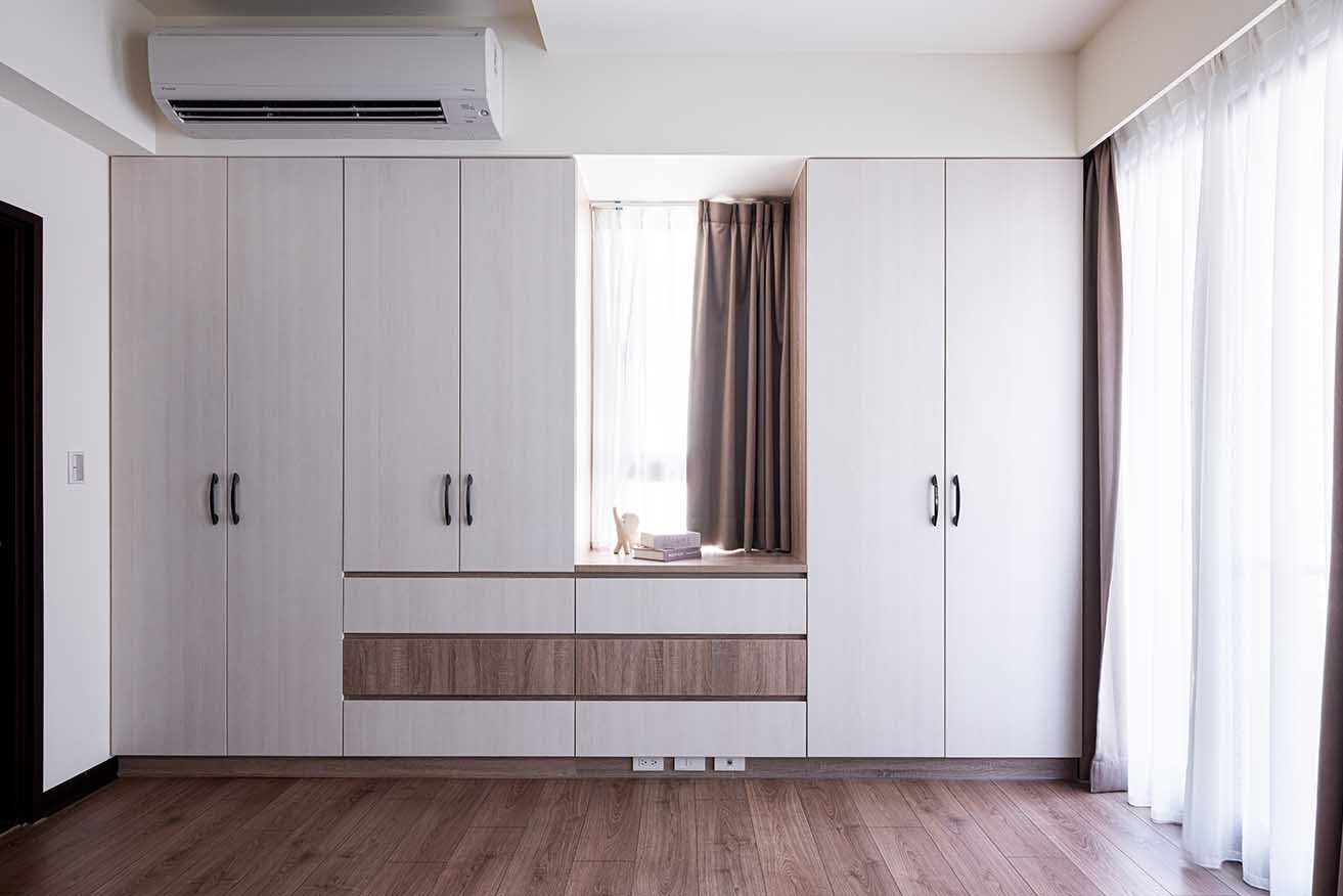 基於此透天具備敞朗面寬與樓高條件,設計師以不遮掩採光為配置軸心,揮別壓迫的櫃體設計,緊依動線且貼近屋主實際需求,量身定製輕量型與錯格造型櫃體,運用吊櫃、低櫃與淺木紋衣櫃滿足儲放功能,造就簡約且蘊含細膩變化的空間感。