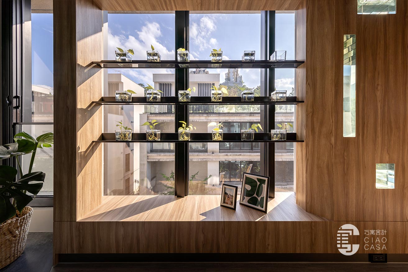緊鄰窗戶的一側安排了兩道主題牆:植栽牆與回憶牆。一方面利用植物和室外自然景觀相呼應,另一方面能將每年出遊的相本和家人照片展示出來,同時又延伸出臥榻座椅功能。
