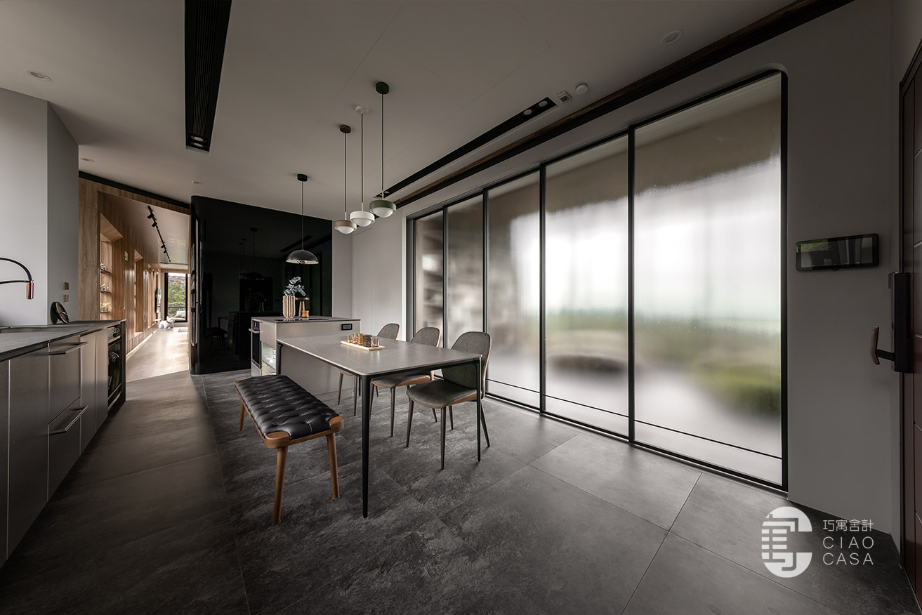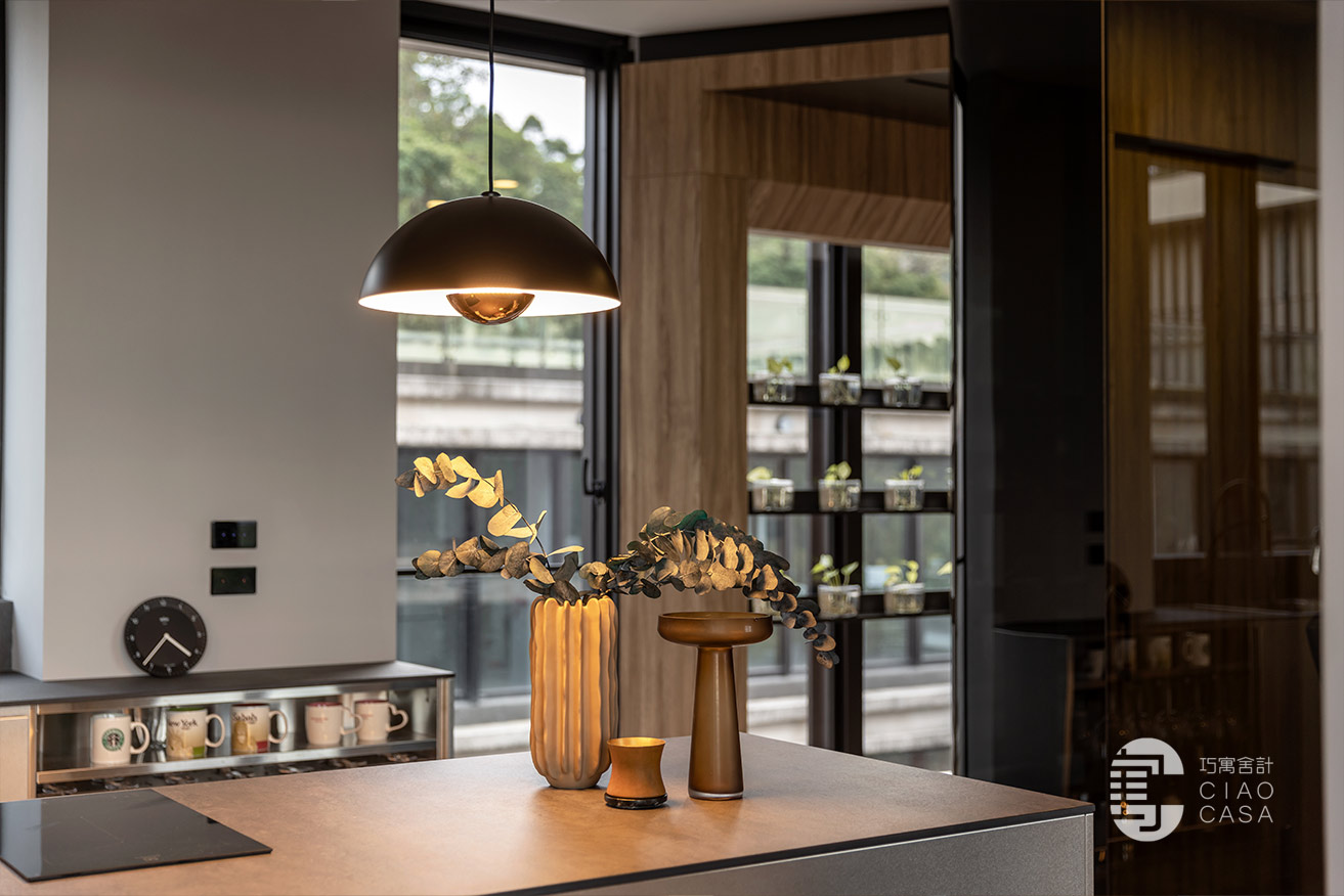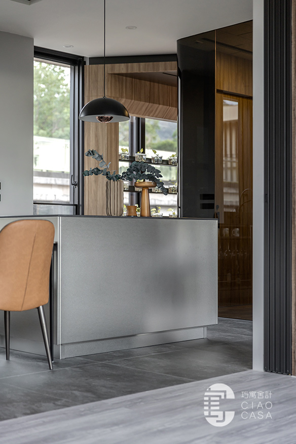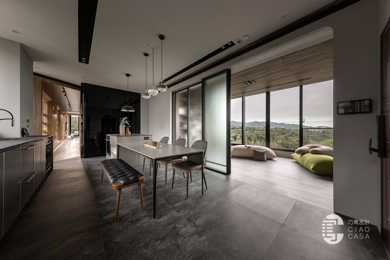 設計師以陽光走廊做為分界,將公私領域明確區分開來,以廚房與多功能室做為住宅重心,將大面落地窗外的蓊鬱綠景帶進屋中,增強室內與外在環境的連結,將廣闊無邊的城市景觀盡收眼底,每個角落都有故事,每一束光線都有溫度,一步步建構處處是景的森林系休閒宅。