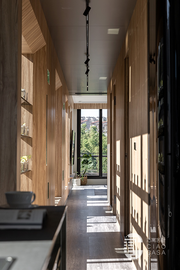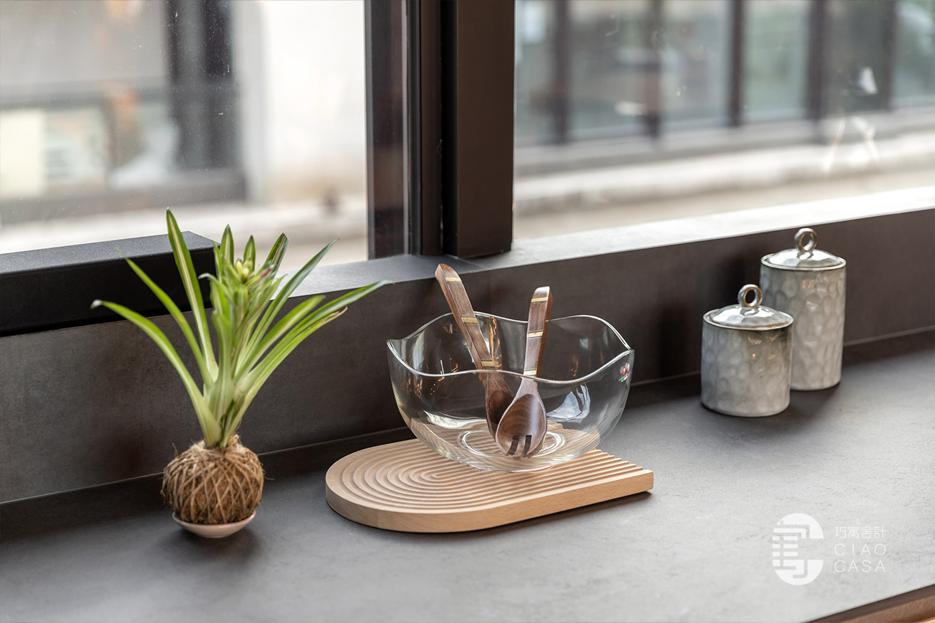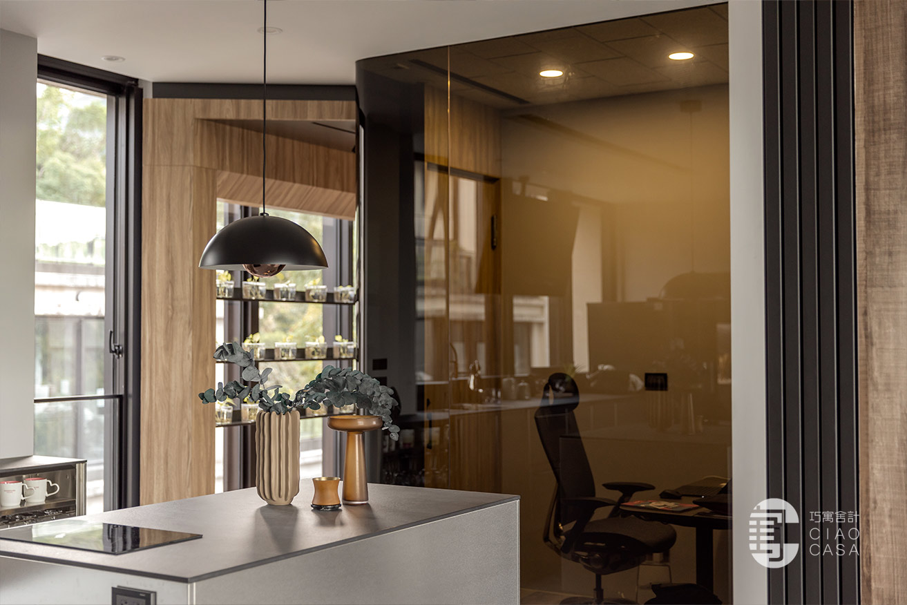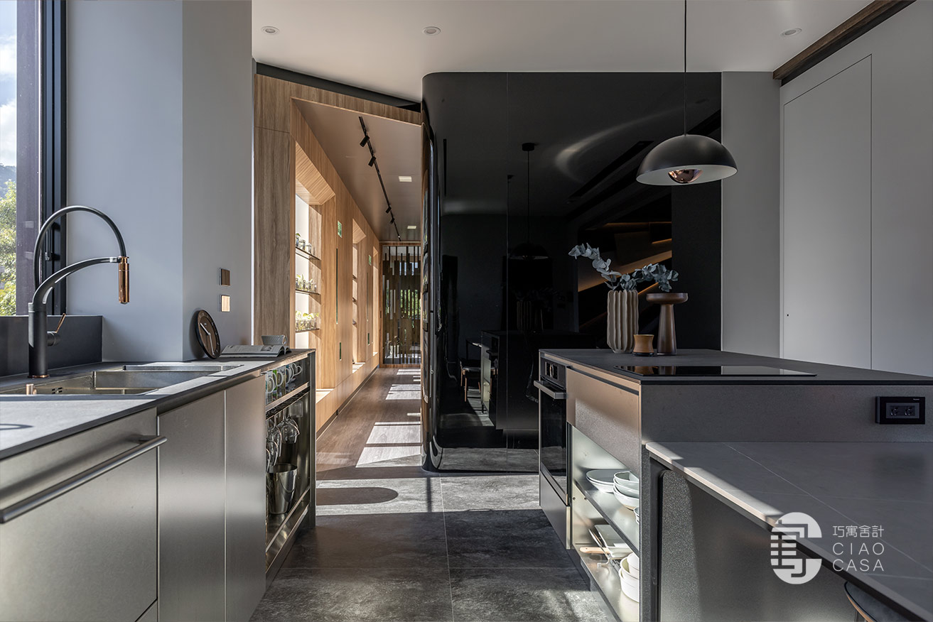 設計師以陽光走廊做為分界,將公私領域明確區分開來,以廚房與多功能室做為住宅重心,將大面落地窗外的蓊鬱綠景帶進屋中,增強室內與外在環境的連結,將廣闊無邊的城市景觀盡收眼底,每個角落都有故事,每一束光線都有溫度,一步步建構處處是景的森林系休閒宅。