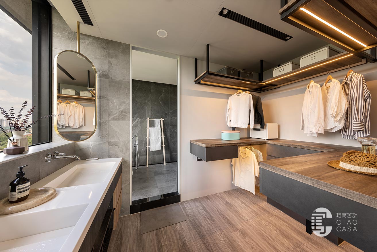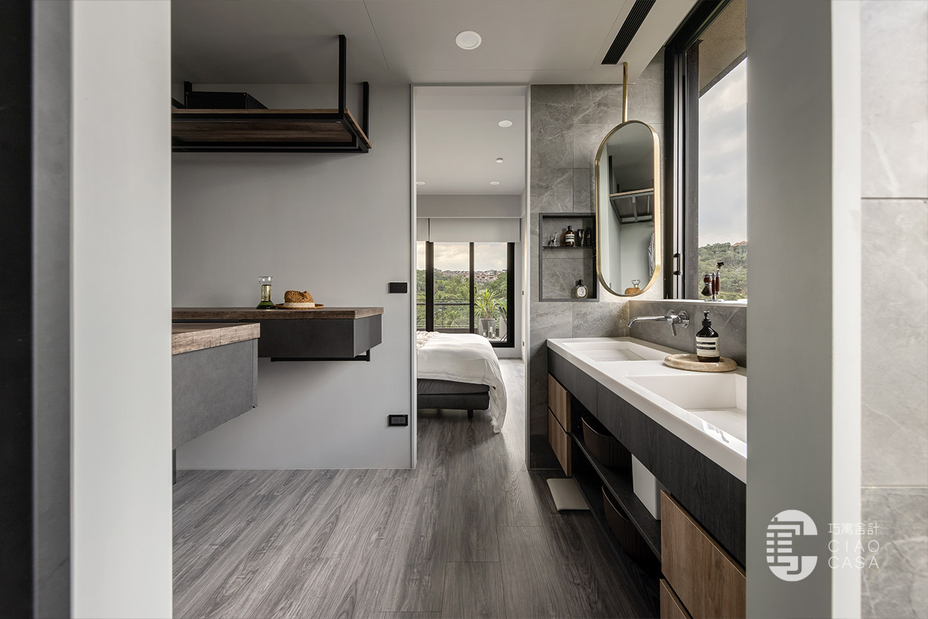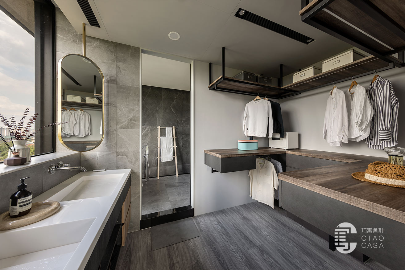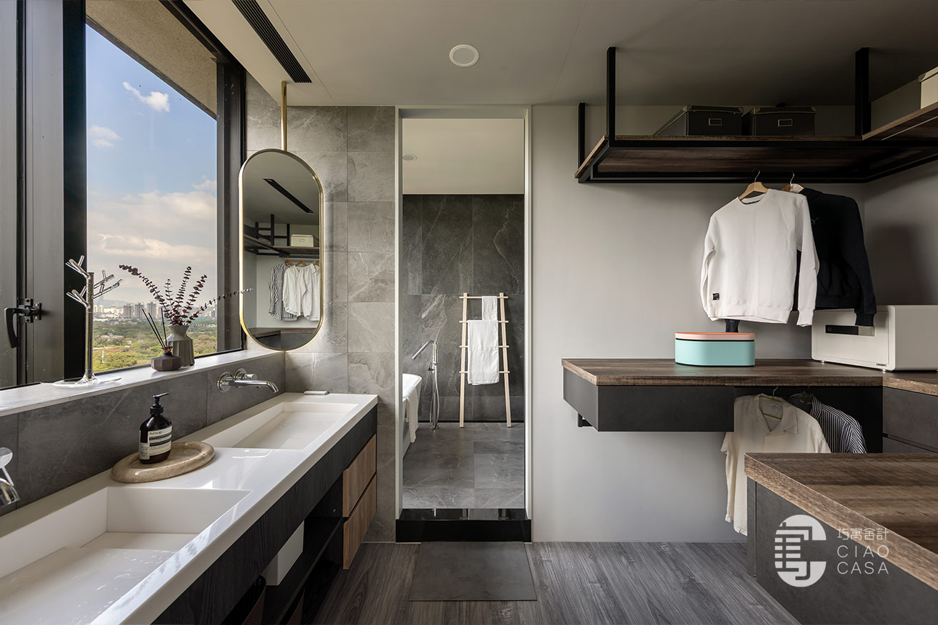 更衣室與主浴相連,主要以開放式收納為主,由於這裡是家中視野最美的地方,所以特別把雙洗手台外移到窗戶旁,讓每天起床後的洗漱都能有最愉快的心情,元氣滿滿地展開一天生活。