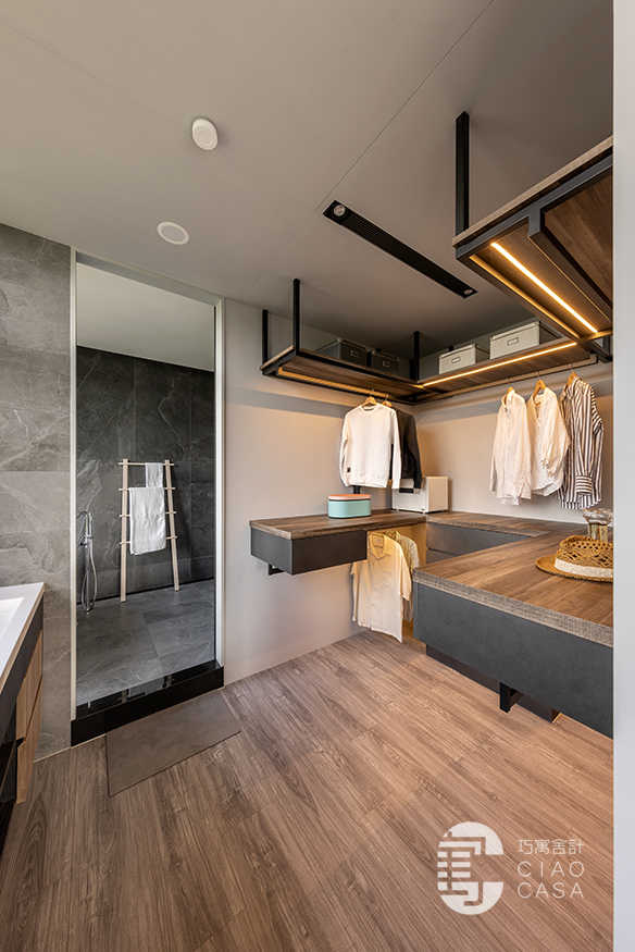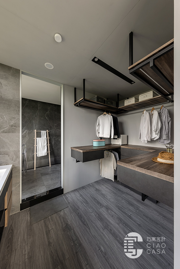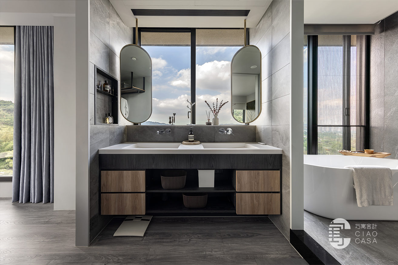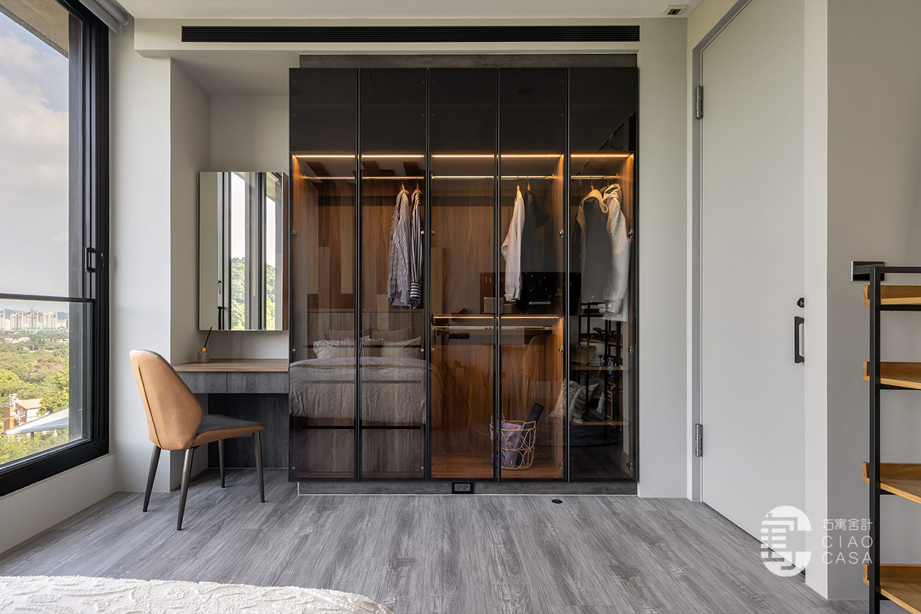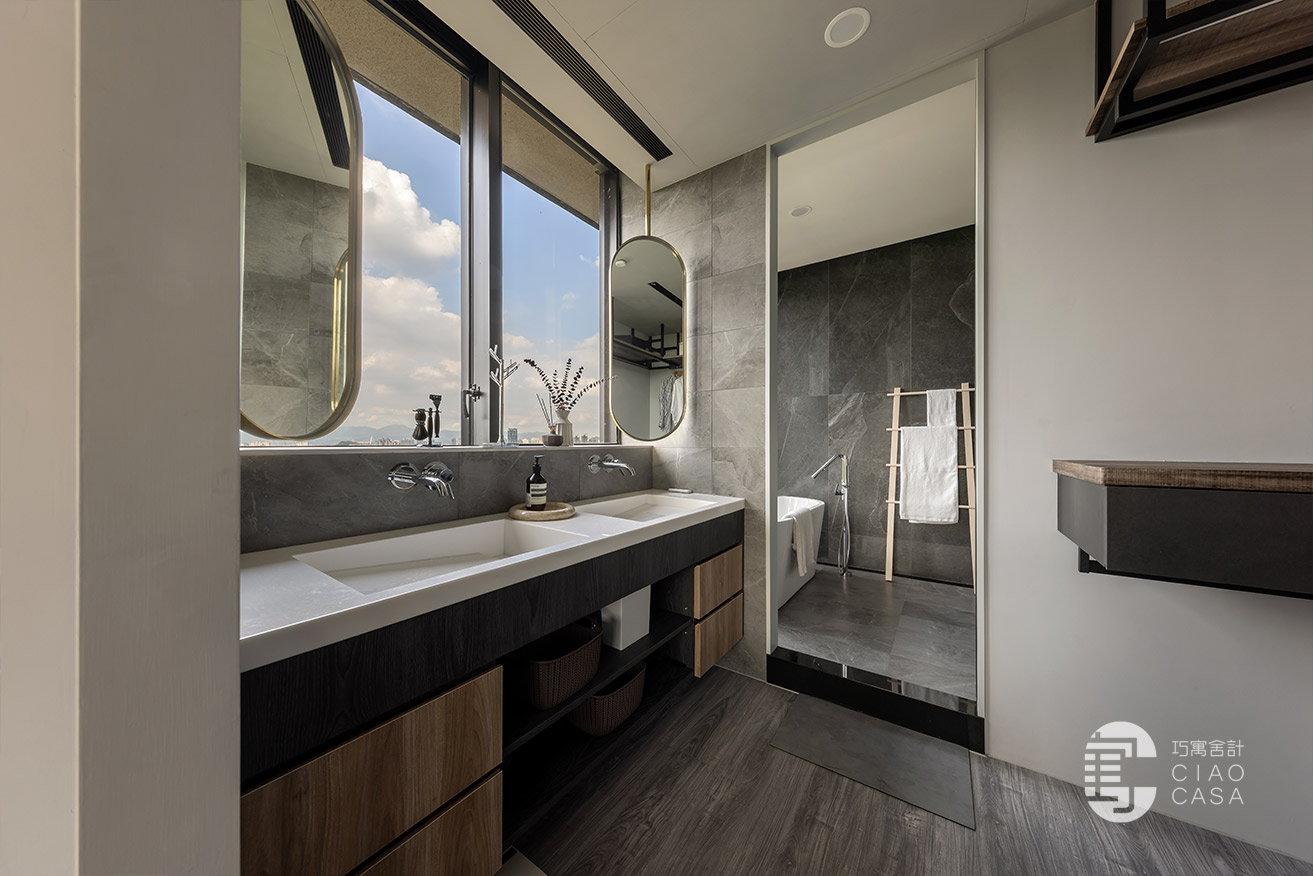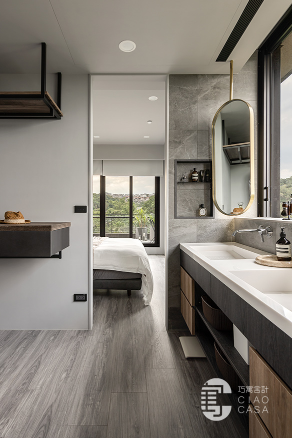 更衣室與主浴相連,主要以開放式收納為主,由於這裡是家中視野最美的地方,所以特別把雙洗手台外移到窗戶旁,讓每天起床後的洗漱都能有最愉快的心情,元氣滿滿地展開一天生活。