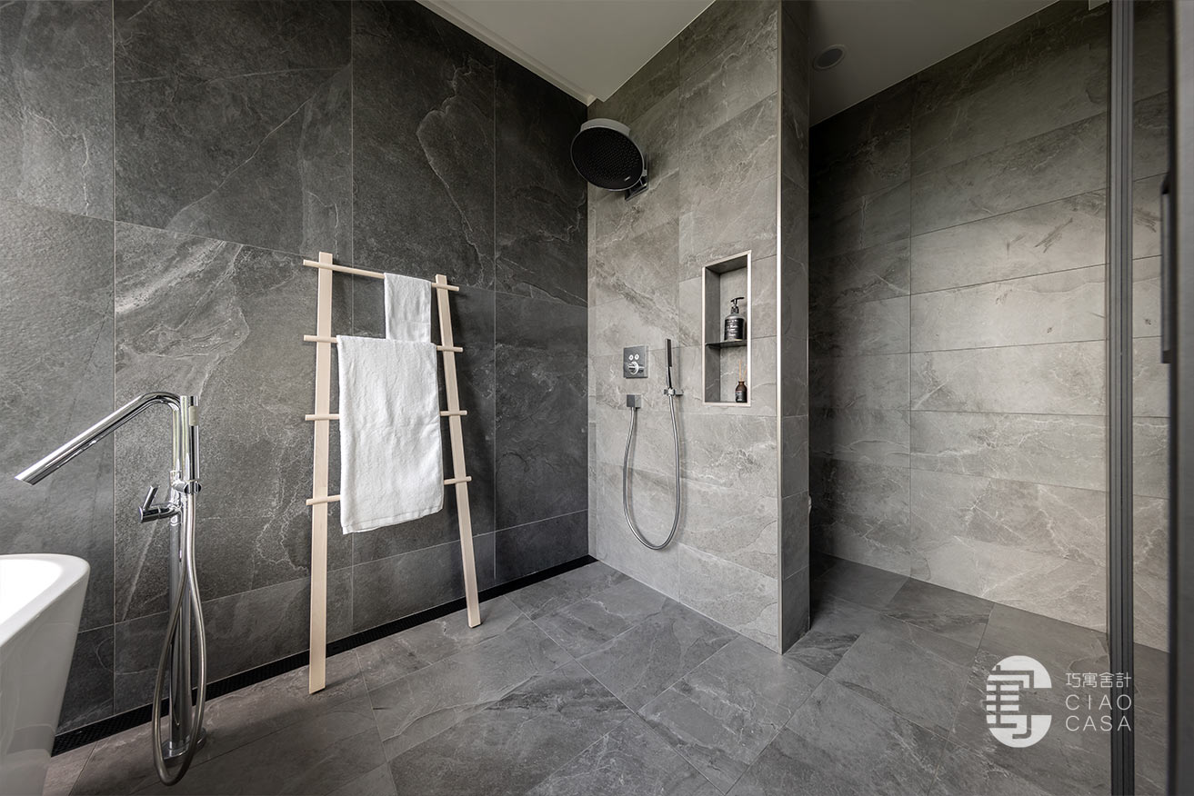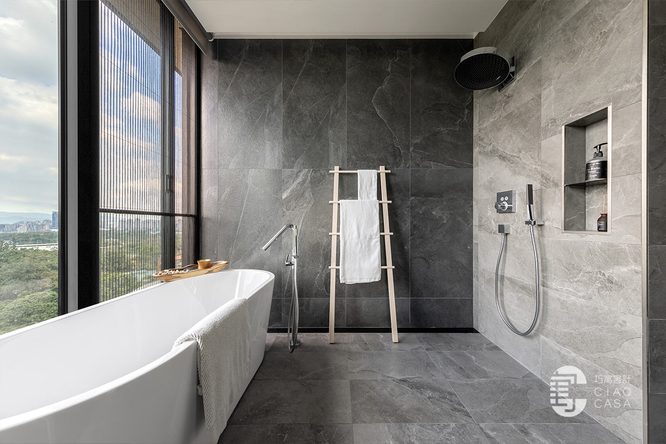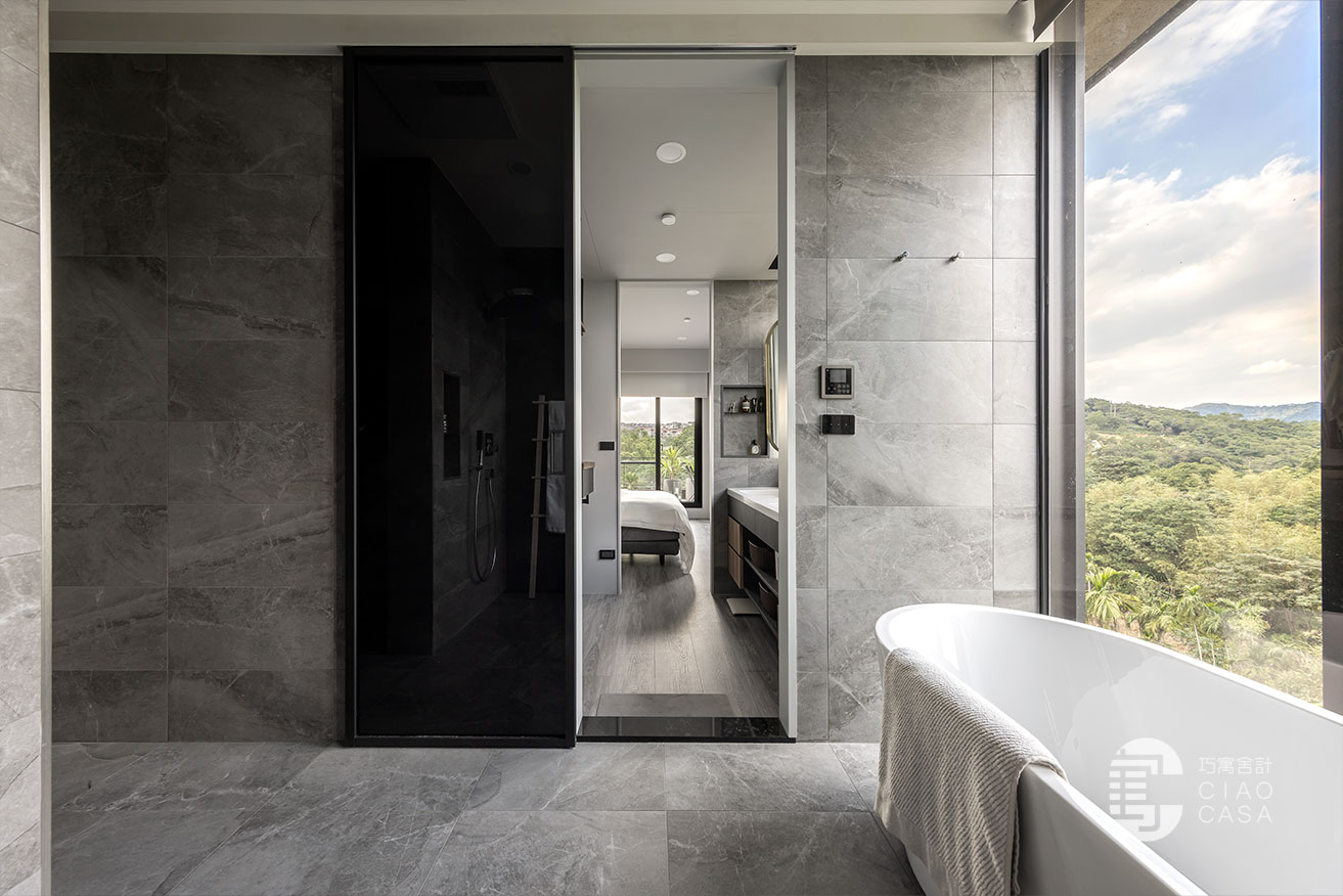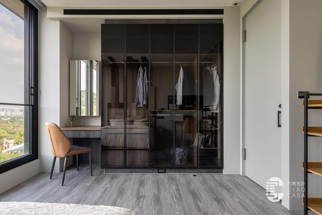 更衣室與主浴相連,主要以開放式收納為主,由於這裡是家中視野最美的地方,所以特別把雙洗手台外移到窗戶旁,讓每天起床後的洗漱都能有最愉快的心情,元氣滿滿地展開一天生活。