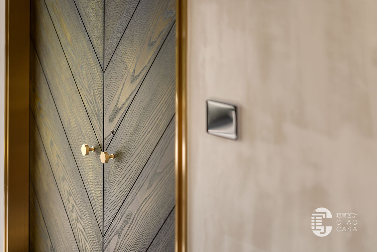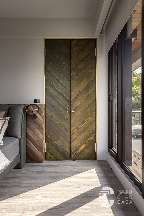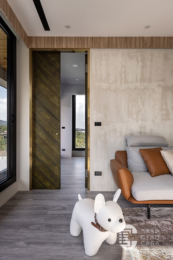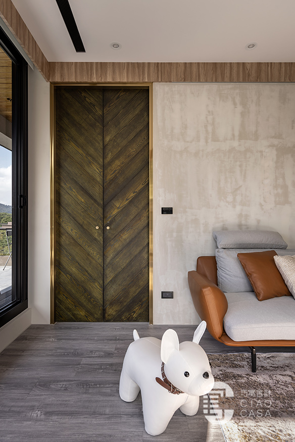 沙發後方以鍍鈦門框、實木染綠設計的雙開門,構成通往主臥的入口,大器地推開兩扇大門、別有一番儀式感的風格,一圓了老婆的夢想。