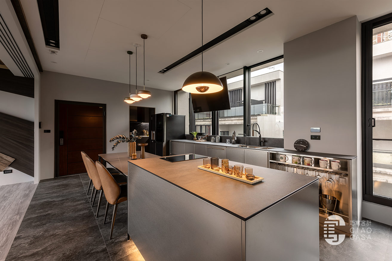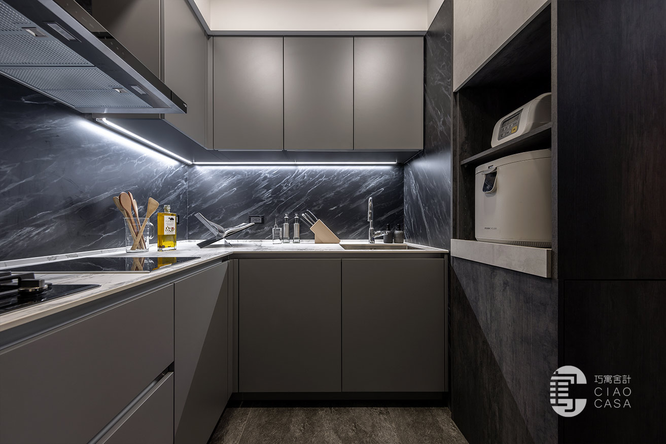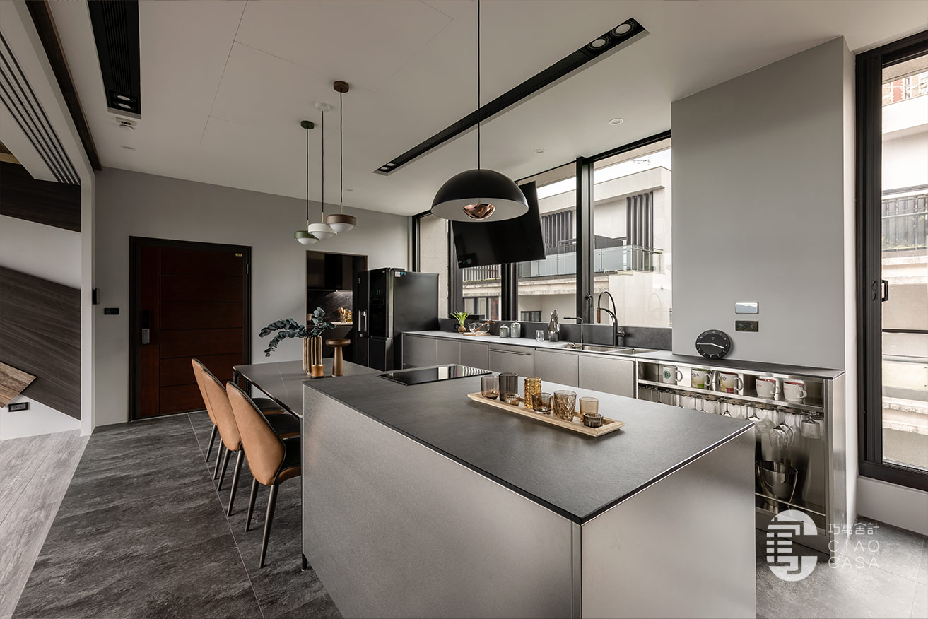 餐廳靠窗處規劃了一列輕食茶水區和備餐檯面,不鏽鋼中島也配置了IH爐,下方可置放烤箱等電器。至於建商原本規劃的封閉式廚房,主要是熱炒使用,沿用建商配置的廚具,另外規劃一座電器櫃,下方黑色門片內是掃拖機器人的家。