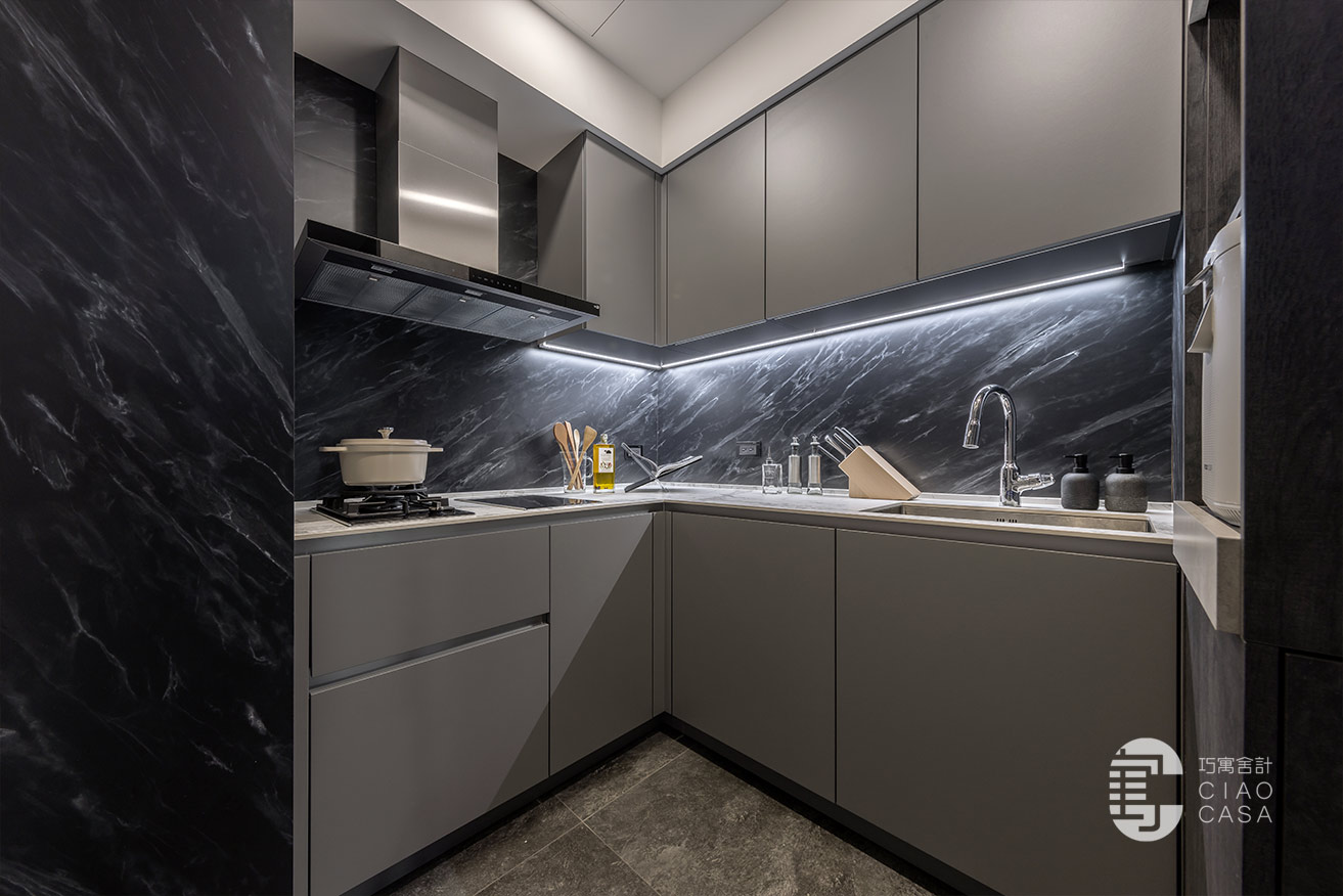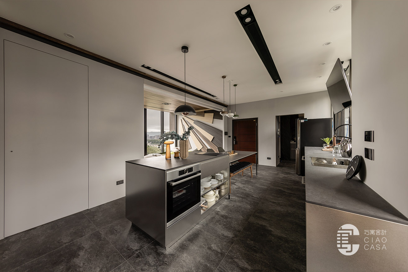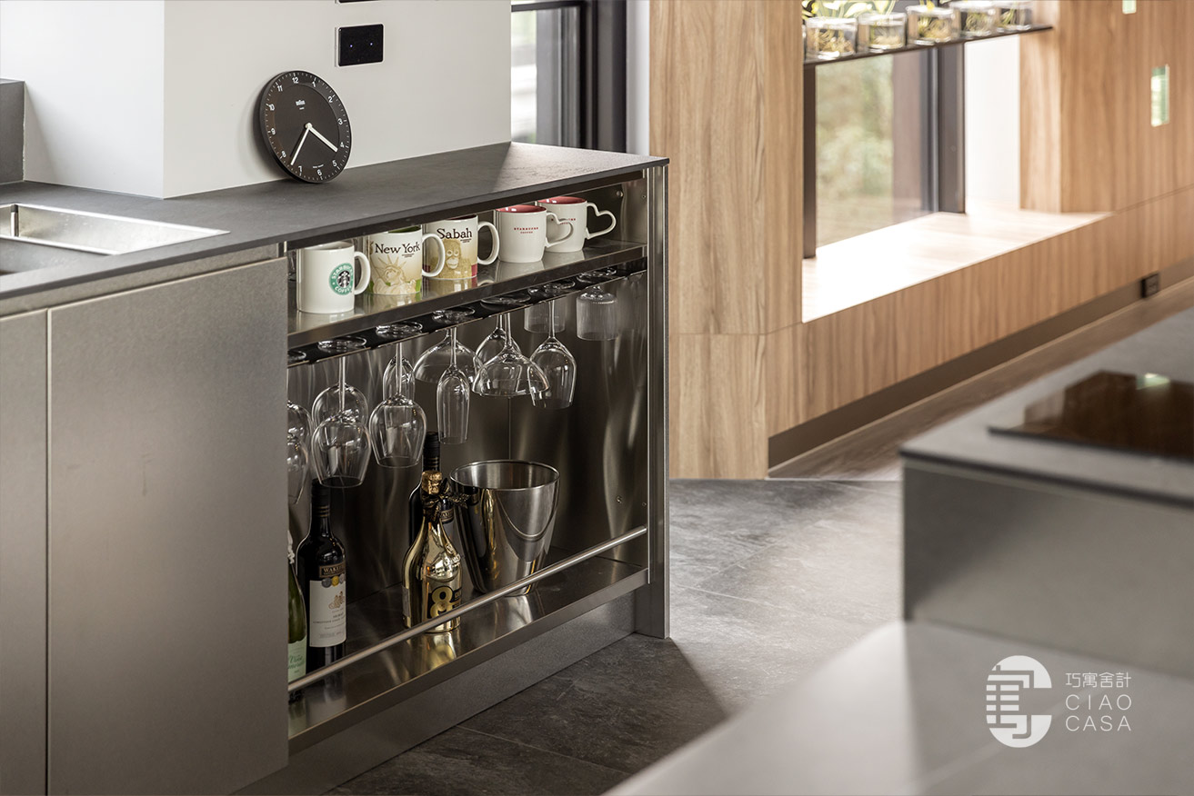 餐廳靠窗處規劃了一列輕食茶水區和備餐檯面,不鏽鋼中島也配置了IH爐,下方可置放烤箱等電器。至於建商原本規劃的封閉式廚房,主要是熱炒使用,沿用建商配置的廚具,另外規劃一座電器櫃,下方黑色門片內是掃拖機器人的家。