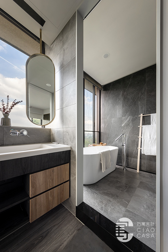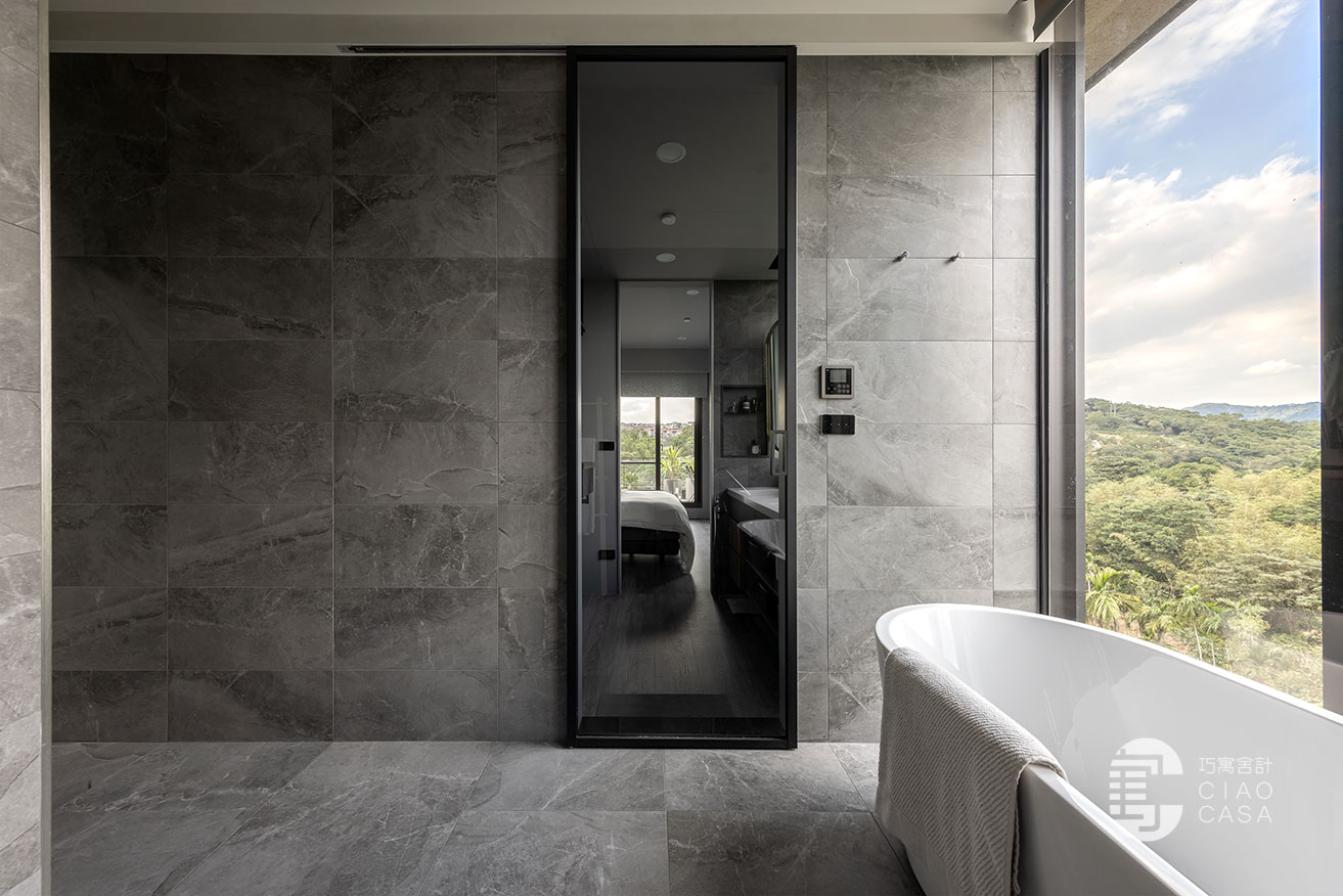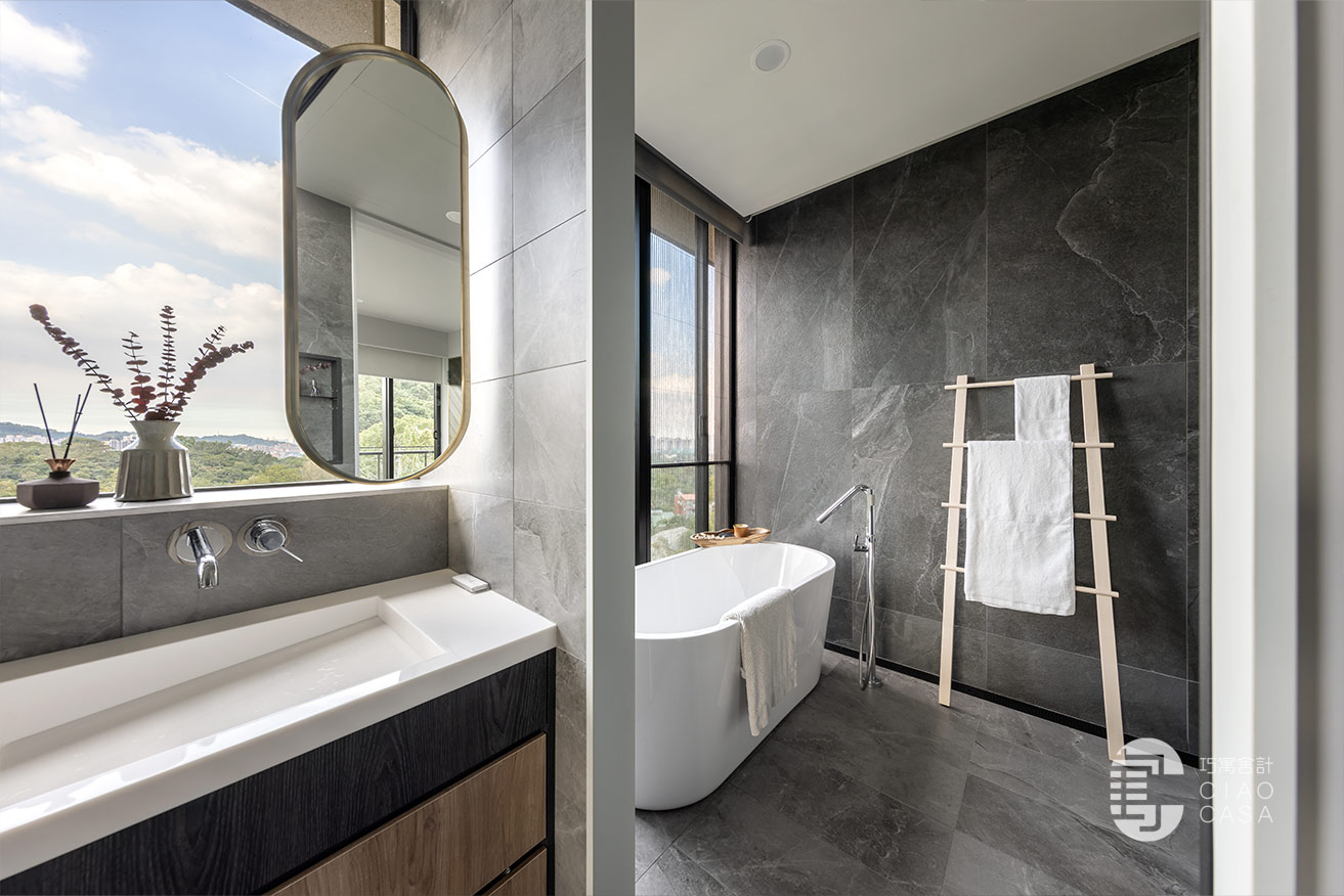 主臥浴室使用罕見的雙洗手台與雙鏡面設計,營造和諧均衡的對稱之美,男女主人起床盥洗時,抬頭可見窗外的藍天白雲,將煩惱暫時拋開,使心緒回復到平靜放鬆的原始狀態。由於家中成員的作息時間有所差異,在隔音方面下足功夫,使用陶粒牆替代輕隔間,讓大人、小孩各自擁有靜謐、不受干擾的獨處時光。