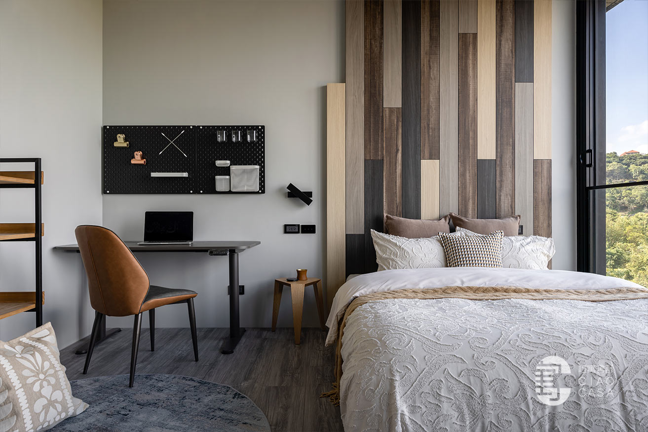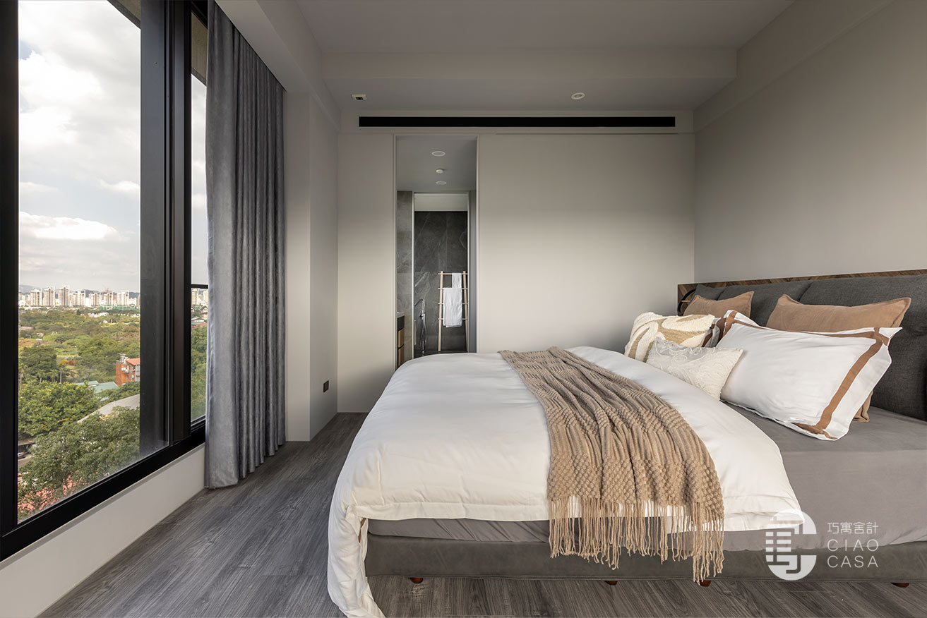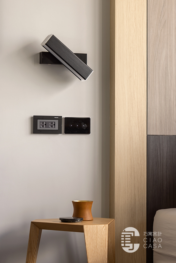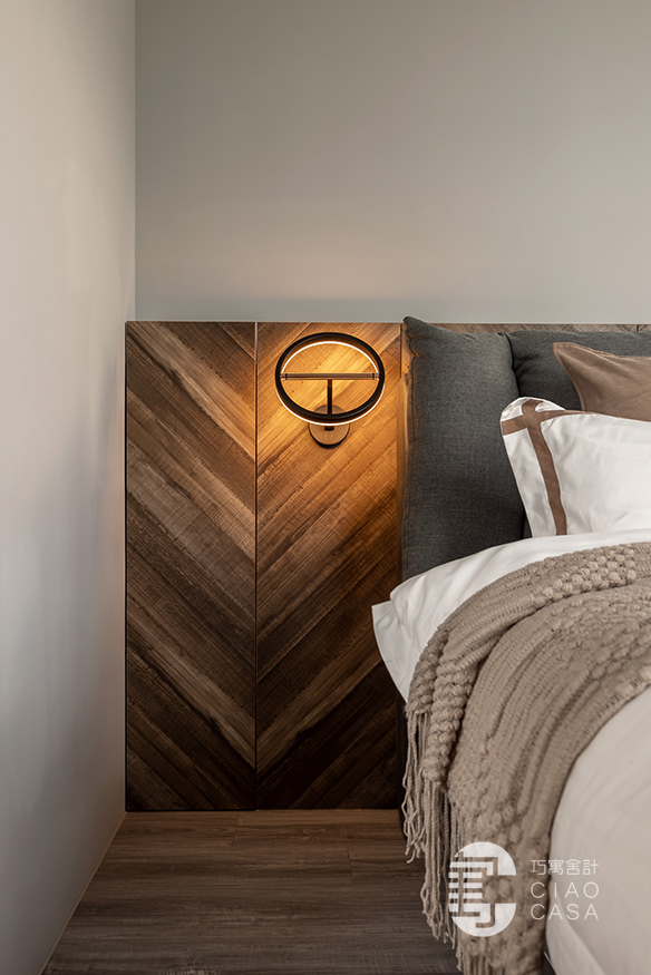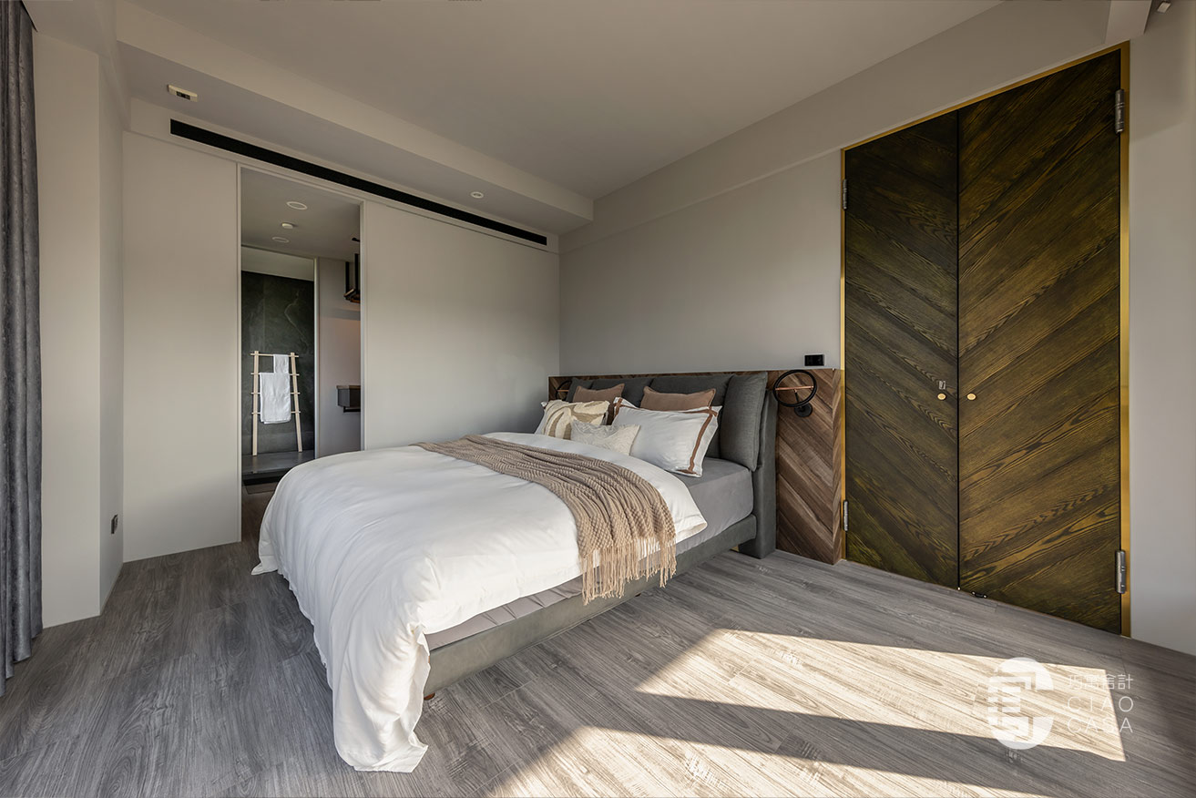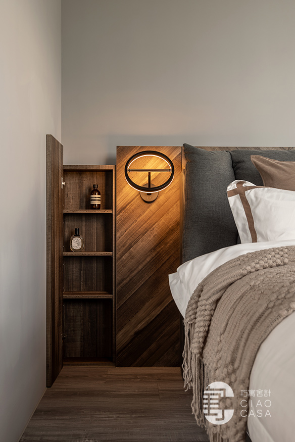 臥室內則維持乾淨、簡單就好,天花板和牆面透過淺淺的灰調鋪陳;木質半高床頭板上方有凹槽,可以放置手機充電,側邊也整合了門片式床頭櫃。