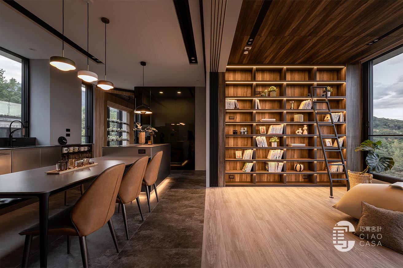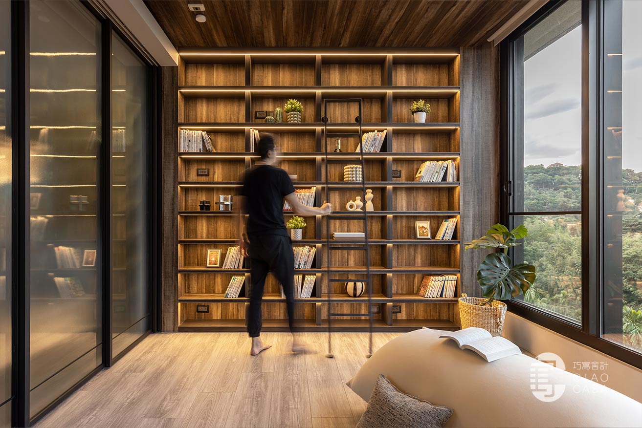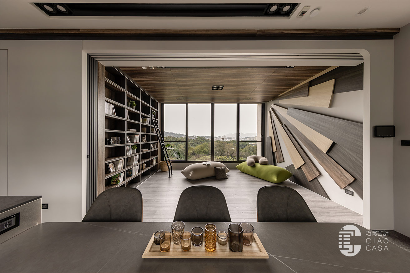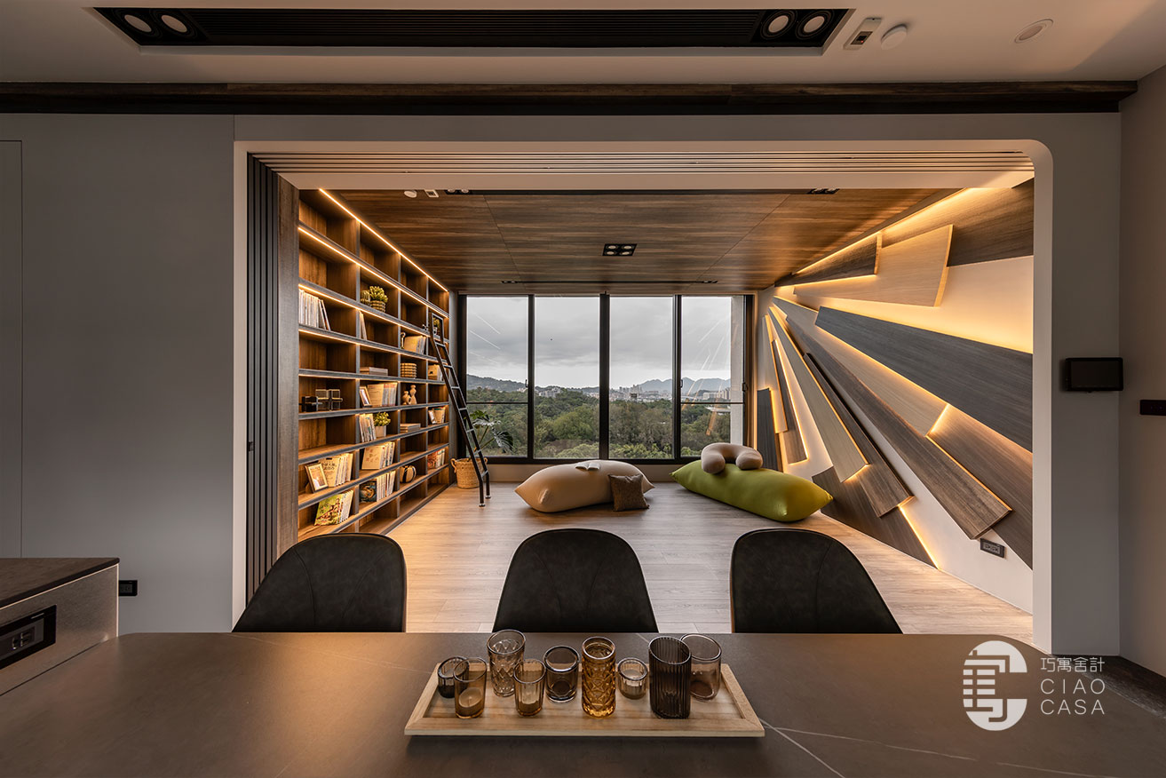 家中最吸睛之處莫過於多功能室的一大面書牆,讓人有種置身書店的錯覺,兼具展示收納功用,能夠擺放珍愛的藏書及藏品,在燈帶的照耀下,勾勒出柔美優雅的輪廓,由於屋內樓高較高,加上大面迎光開窗引入廣袤綠景,營造舒適療癒的閱讀空間,不論是一同享受讀書時光,亦或是凝望自然風光,閒適知性的人文質感油然而生,可說是家中令人記憶猶新的獨到端景。