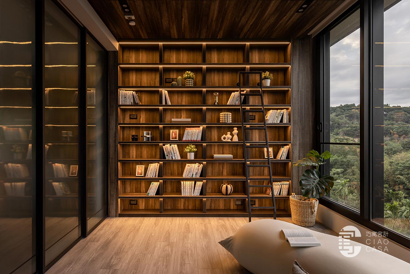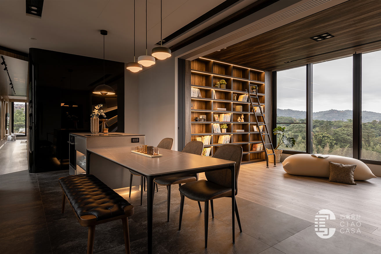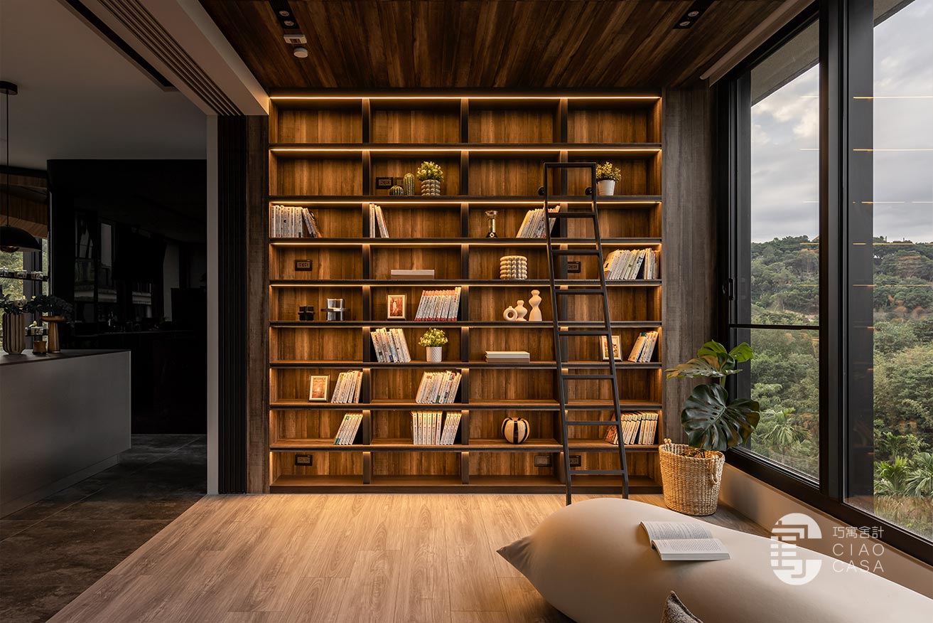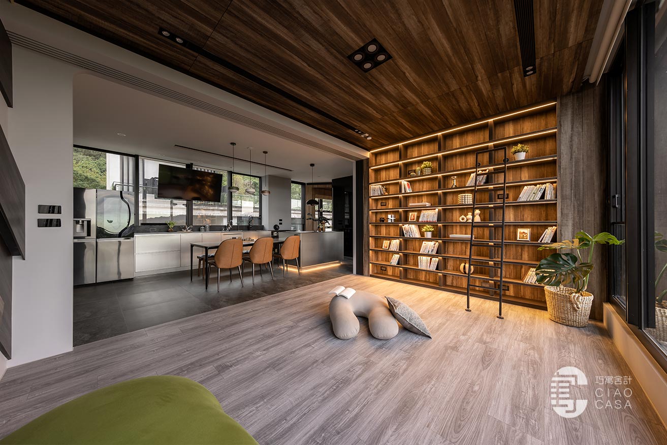 家中最吸睛之處莫過於多功能室的一大面書牆,讓人有種置身書店的錯覺,兼具展示收納功用,能夠擺放珍愛的藏書及藏品,在燈帶的照耀下,勾勒出柔美優雅的輪廓,由於屋內樓高較高,加上大面迎光開窗引入廣袤綠景,營造舒適療癒的閱讀空間,不論是一同享受讀書時光,亦或是凝望自然風光,閒適知性的人文質感油然而生,可說是家中令人記憶猶新的獨到端景。