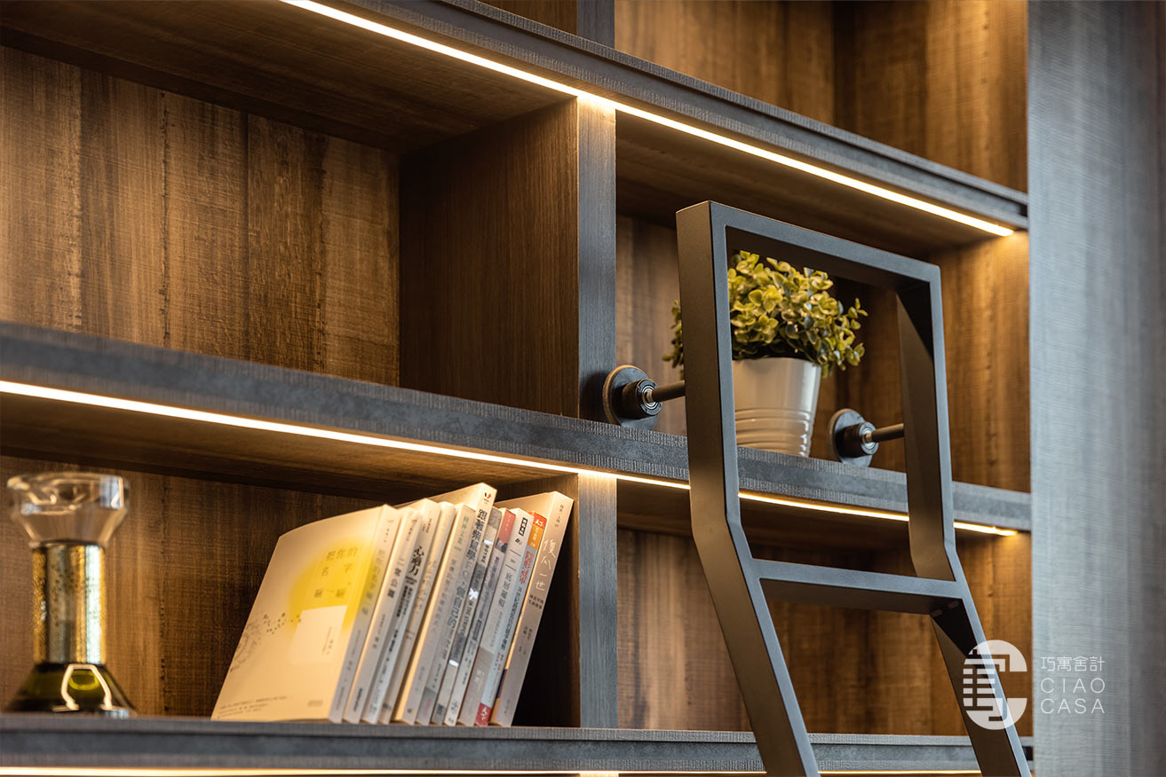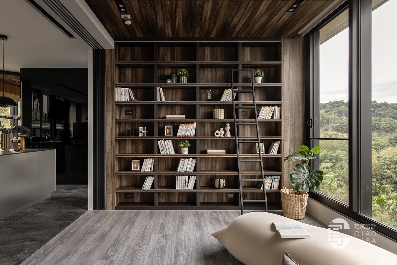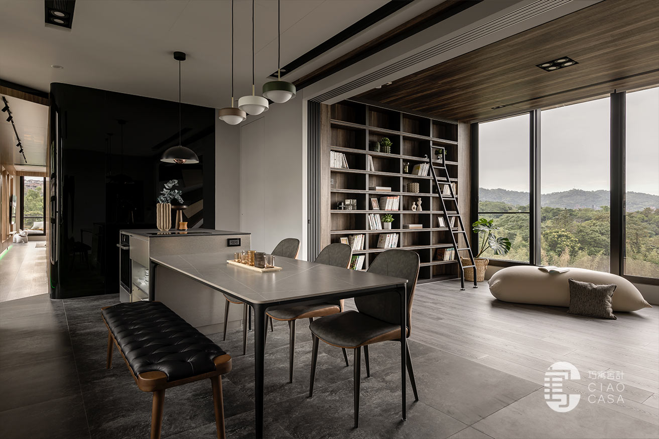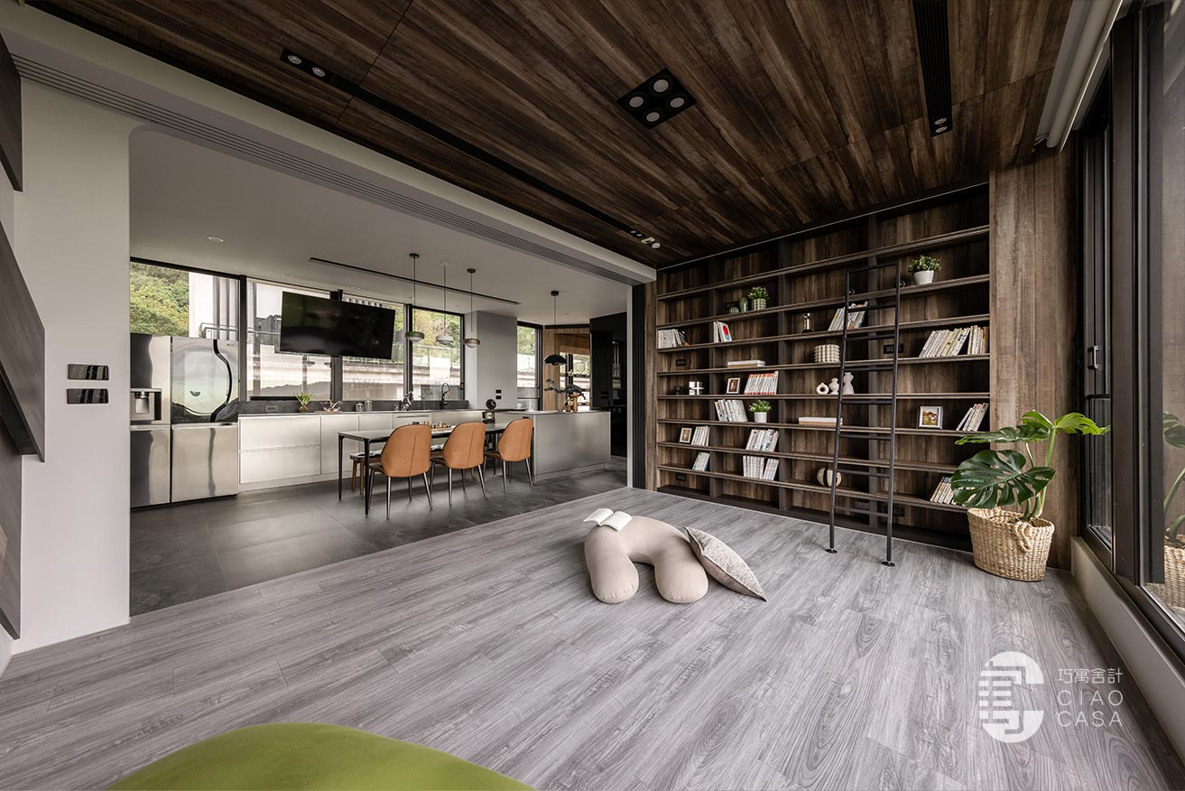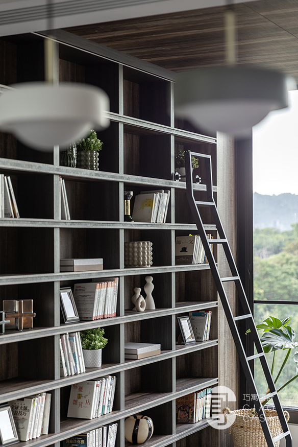 家中最吸睛之處莫過於多功能室的一大面書牆,讓人有種置身書店的錯覺,兼具展示收納功用,能夠擺放珍愛的藏書及藏品,在燈帶的照耀下,勾勒出柔美優雅的輪廓,由於屋內樓高較高,加上大面迎光開窗引入廣袤綠景,營造舒適療癒的閱讀空間,不論是一同享受讀書時光,亦或是凝望自然風光,閒適知性的人文質感油然而生,可說是家中令人記憶猶新的獨到端景。
