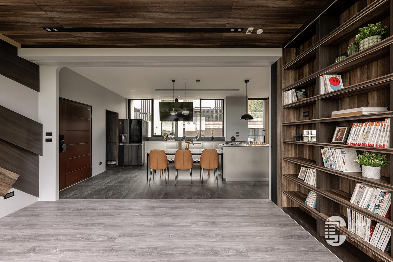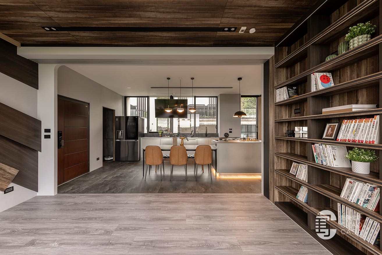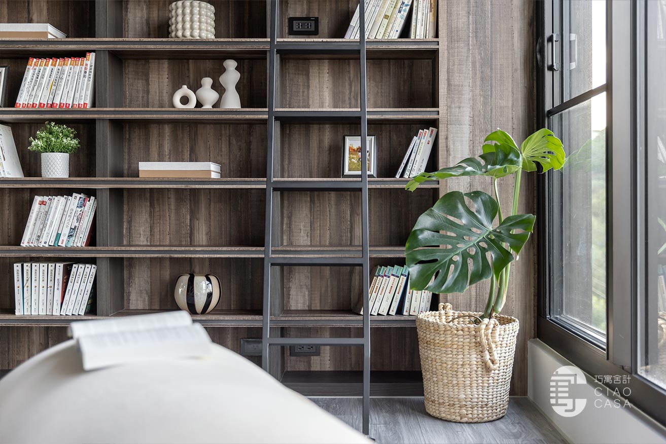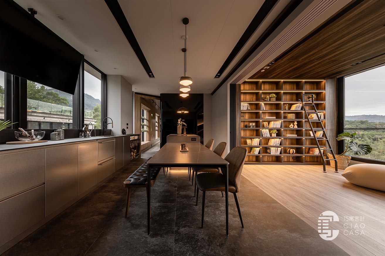 家中最吸睛之處莫過於多功能室的一大面書牆,讓人有種置身書店的錯覺,兼具展示收納功用,能夠擺放珍愛的藏書及藏品,在燈帶的照耀下,勾勒出柔美優雅的輪廓,由於屋內樓高較高,加上大面迎光開窗引入廣袤綠景,營造舒適療癒的閱讀空間,不論是一同享受讀書時光,亦或是凝望自然風光,閒適知性的人文質感油然而生,可說是家中令人記憶猶新的獨到端景。