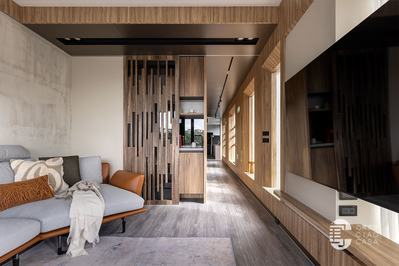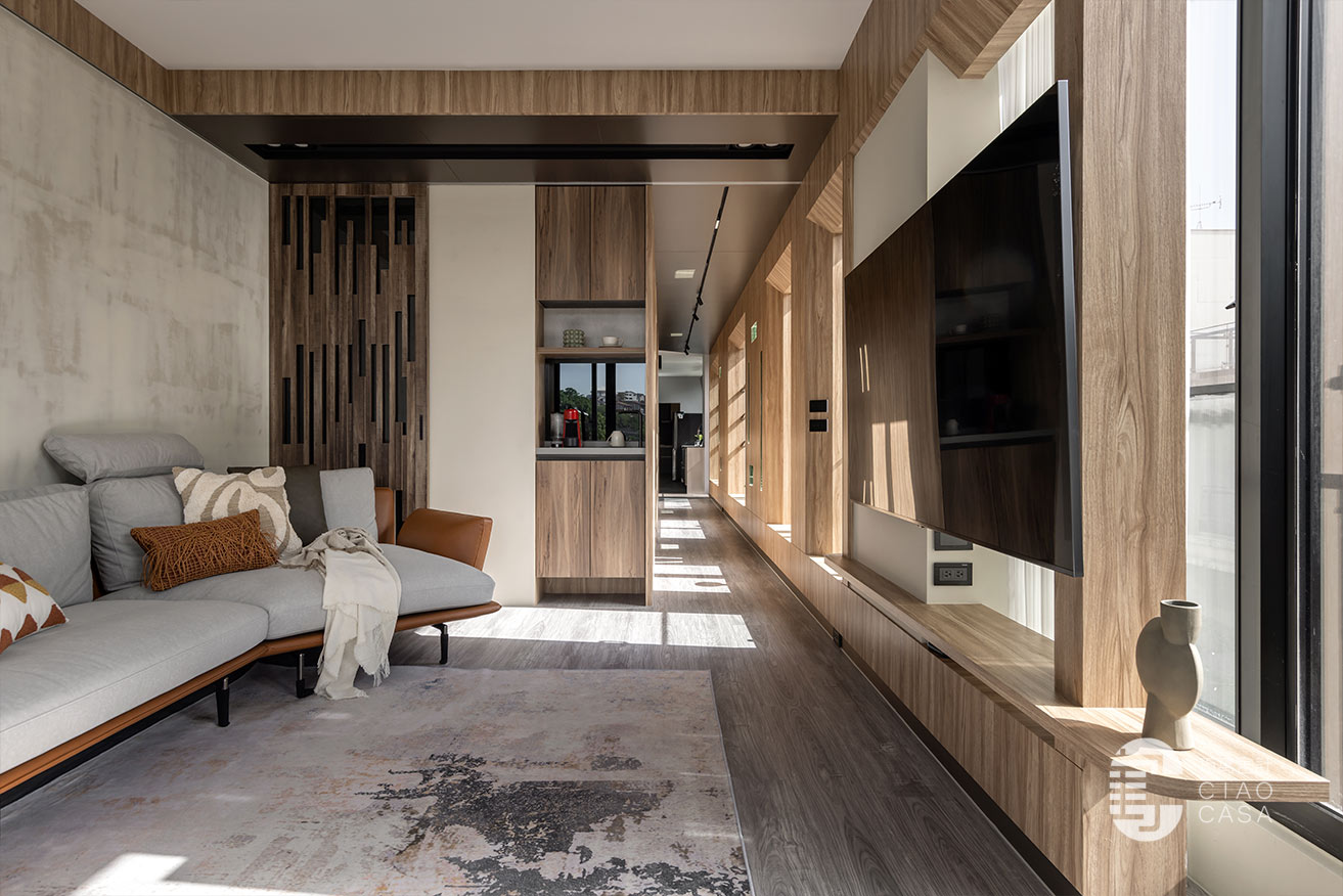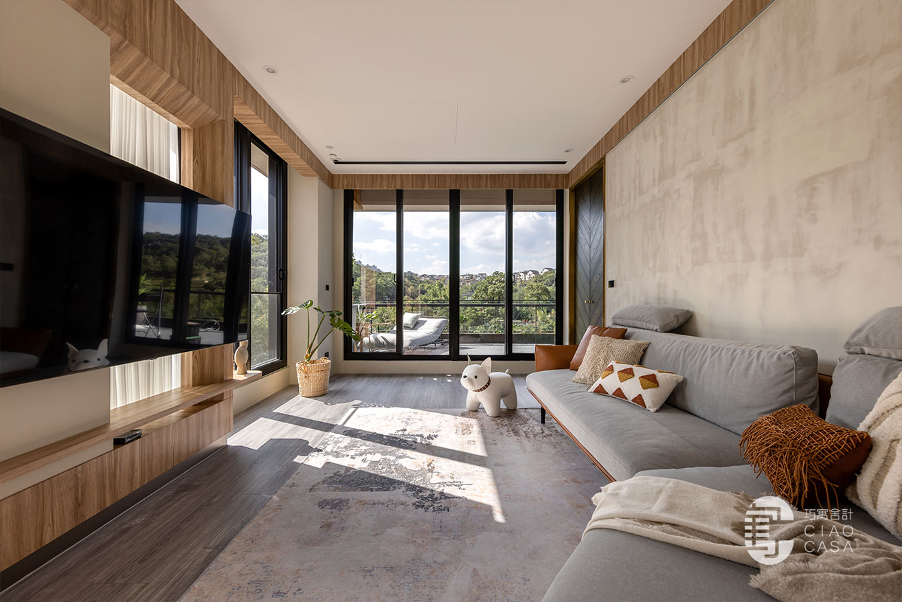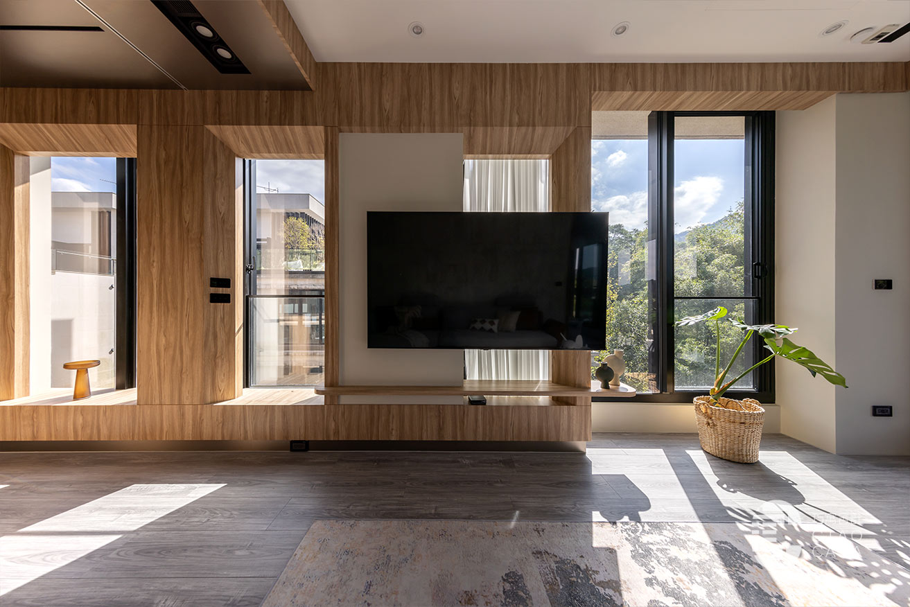 沿著廊道走到尾端、最靠近戶外露台的位置是客廳區,電視牆延續陽光走廊的設計,並巧妙的將電視設計於柱子前方,弱化了龐大的柱子,電視後方形成了一幅「框景」與電視形成有趣的對比。牆面與天花交接處也以木皮圍繞一圈,讓視覺保有一致性。