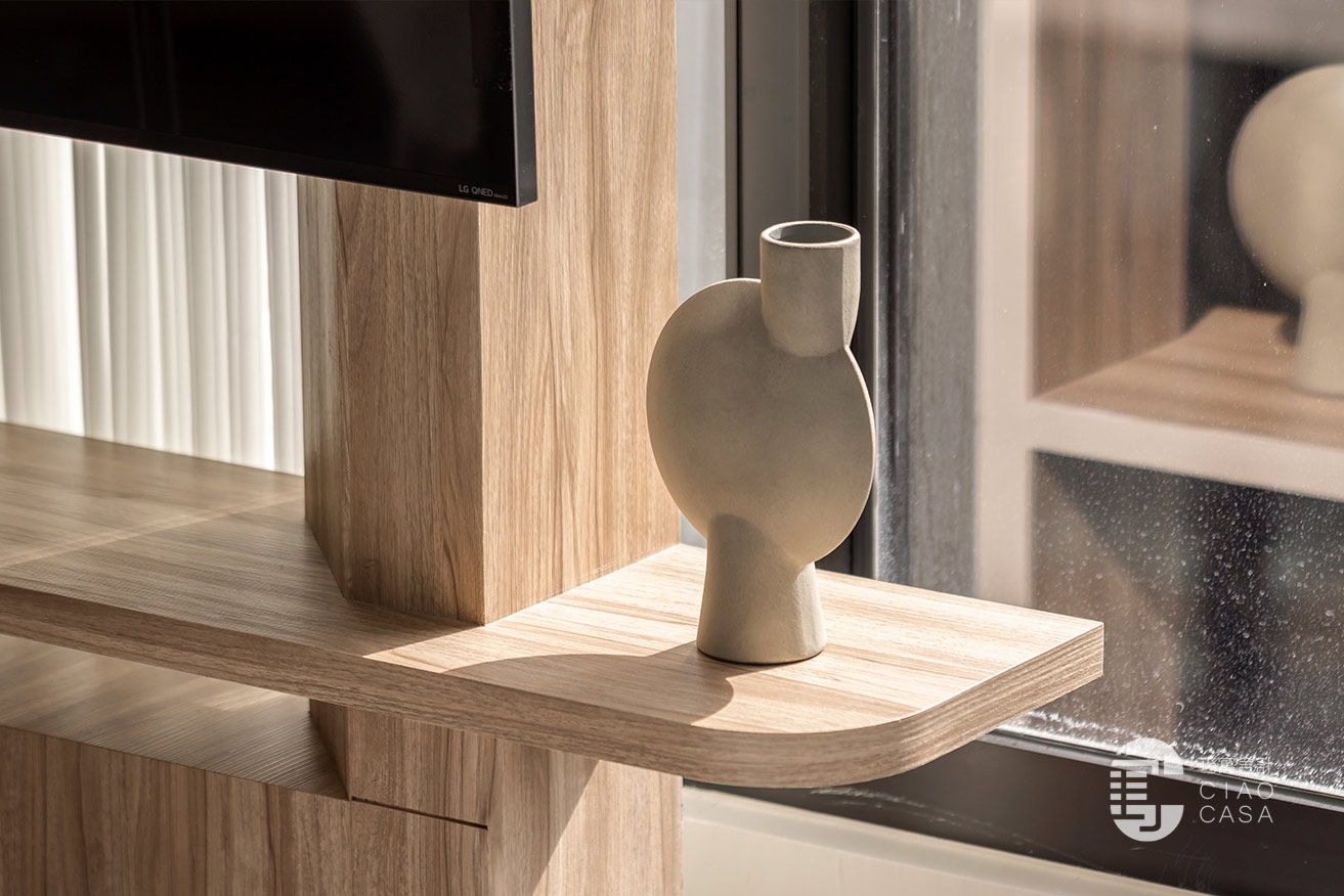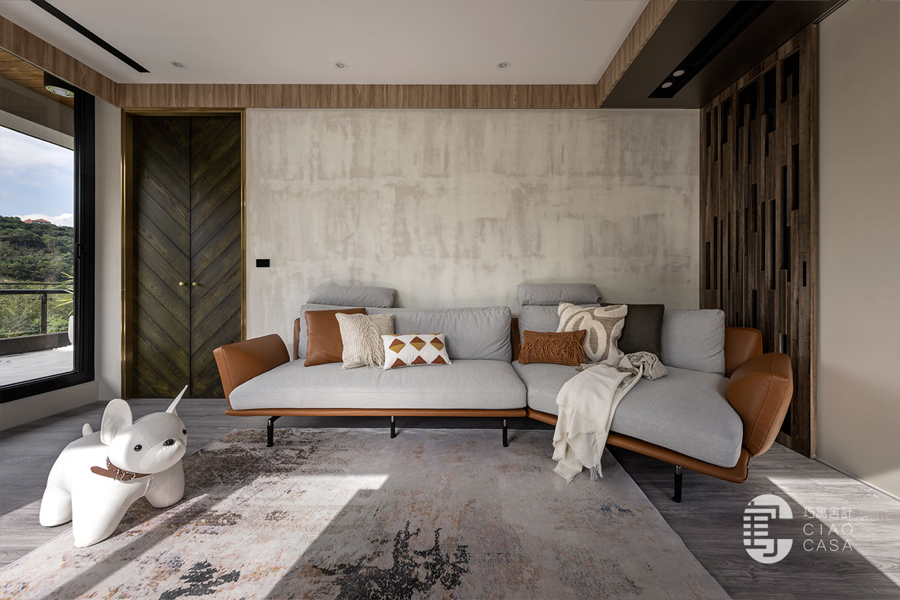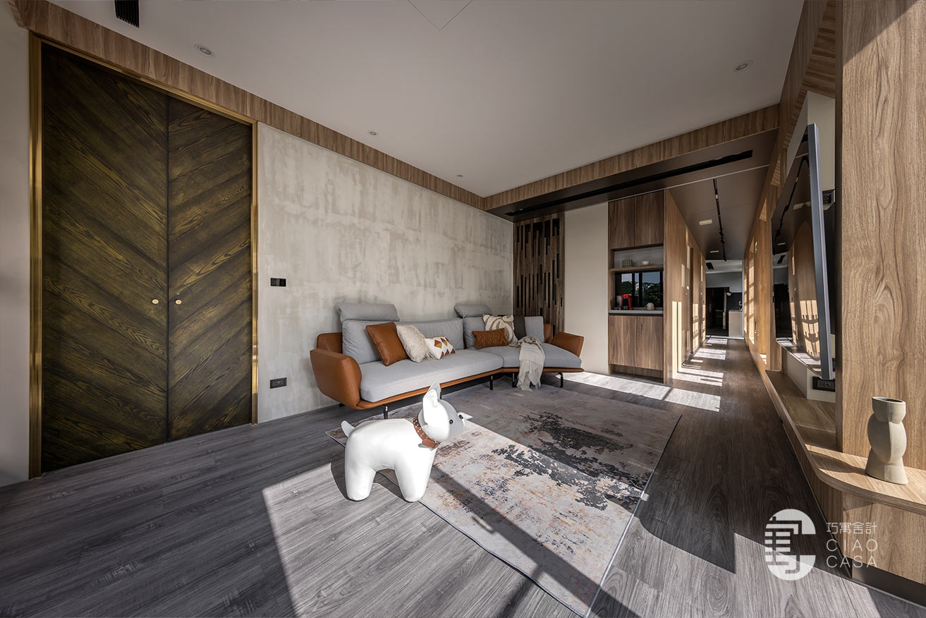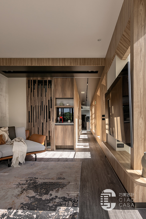 沿著廊道走到尾端、最靠近戶外露台的位置是客廳區,電視牆延續陽光走廊的設計,並巧妙的將電視設計於柱子前方,弱化了龐大的柱子,電視後方形成了一幅「框景」與電視形成有趣的對比。牆面與天花交接處也以木皮圍繞一圈,讓視覺保有一致性。