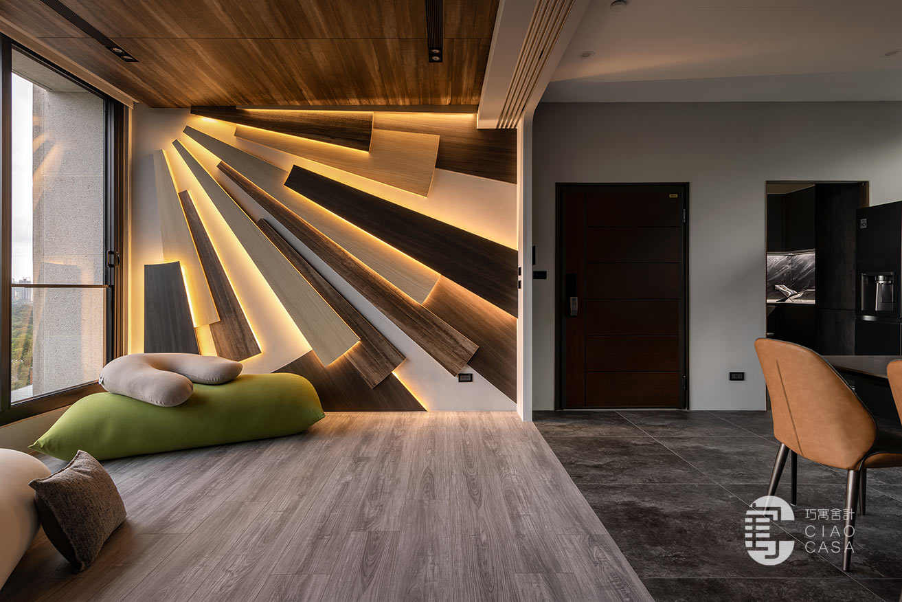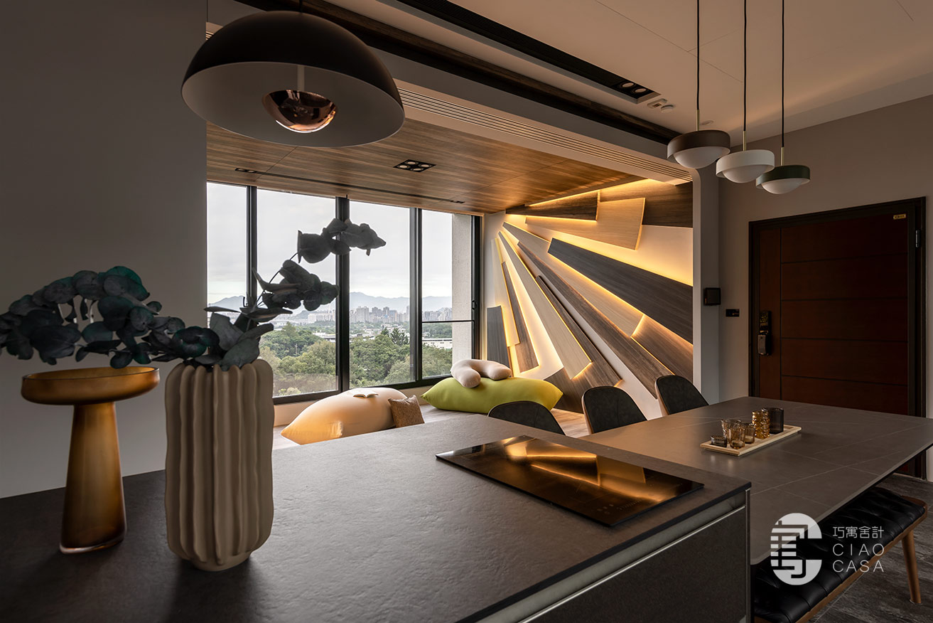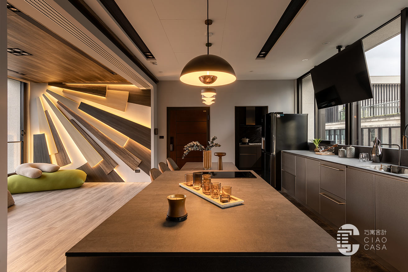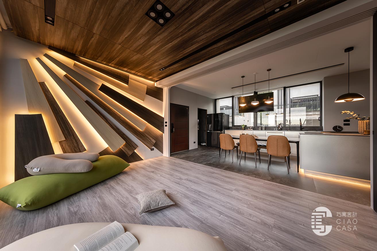 多功能與餐廳區域,最大亮點是壁面上的太陽意象設計,層層疊疊的木板堆砌出向外發散的樣貌,不僅增添視覺豐富度與層次感,還巧妙地結合了間接照明,創造出溫暖而引人入勝的光影變化。在這裡,時間似乎變得緩慢,每一刻都值得細細品味,使居住場所不僅是一種生活的藝術,更成為心靈的真正歸屬。