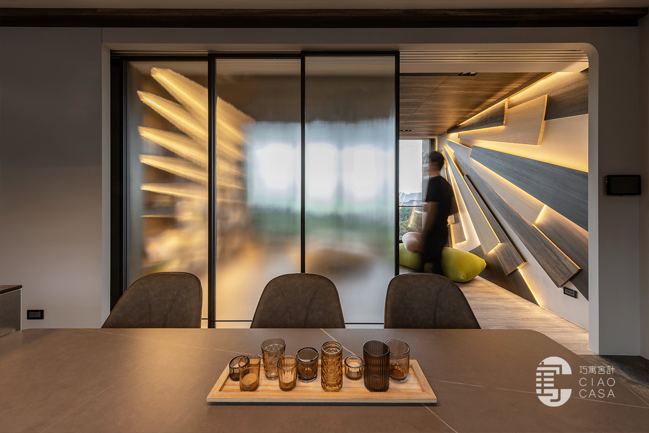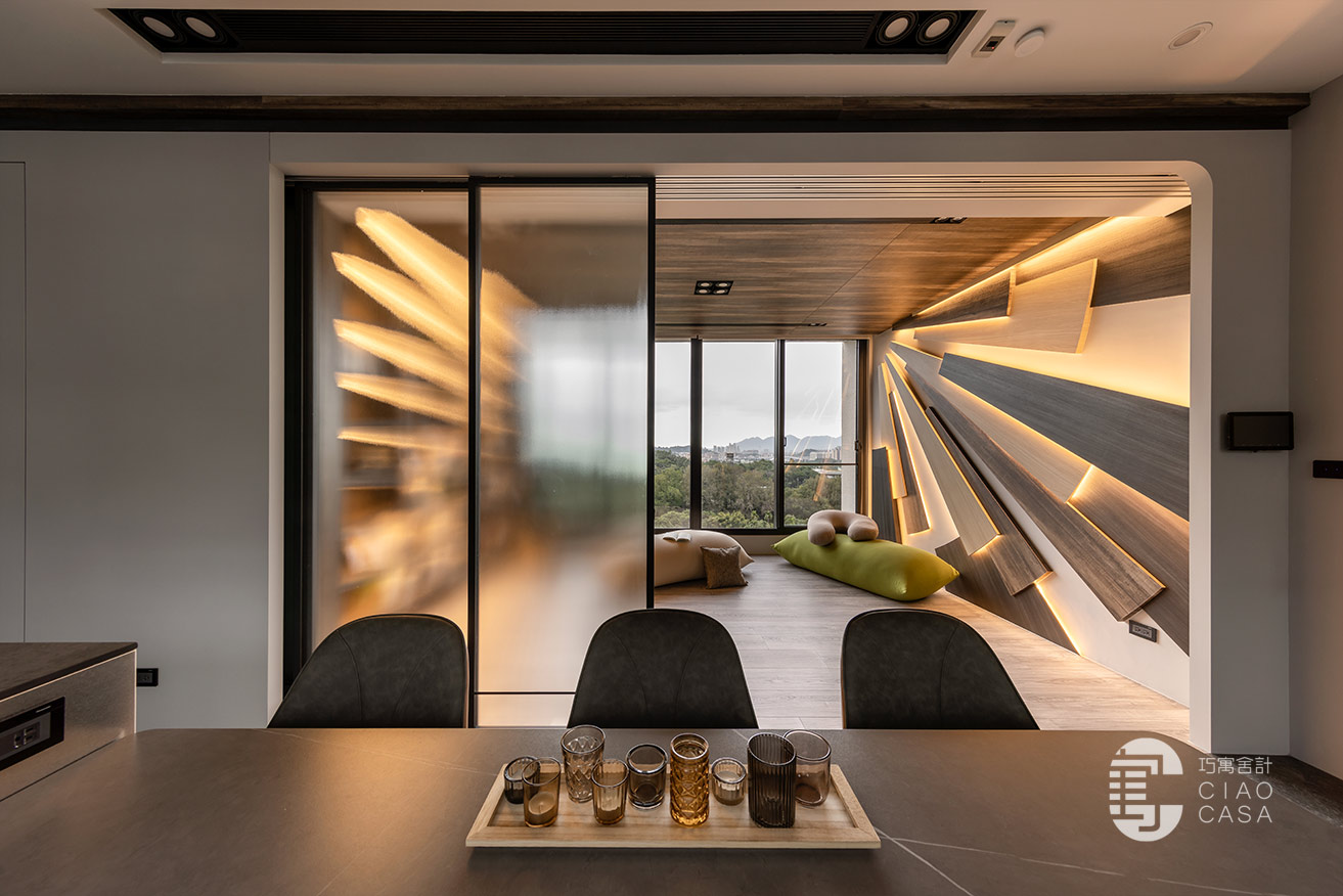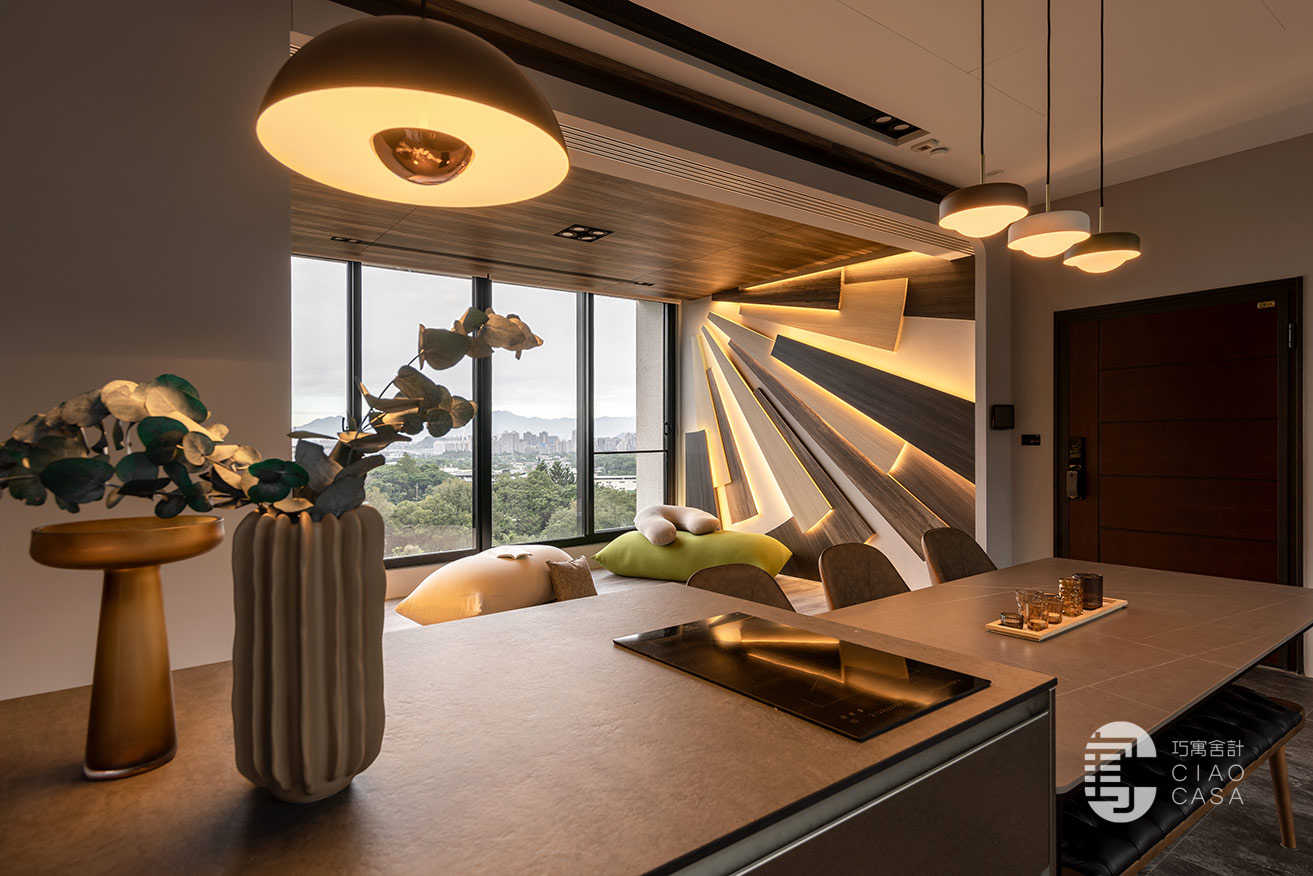 多功能與餐廳區域,最大亮點是壁面上的太陽意象設計,層層疊疊的木板堆砌出向外發散的樣貌,不僅增添視覺豐富度與層次感,還巧妙地結合了間接照明,創造出溫暖而引人入勝的光影變化。在這裡,時間似乎變得緩慢,每一刻都值得細細品味,使居住場所不僅是一種生活的藝術,更成為心靈的真正歸屬。