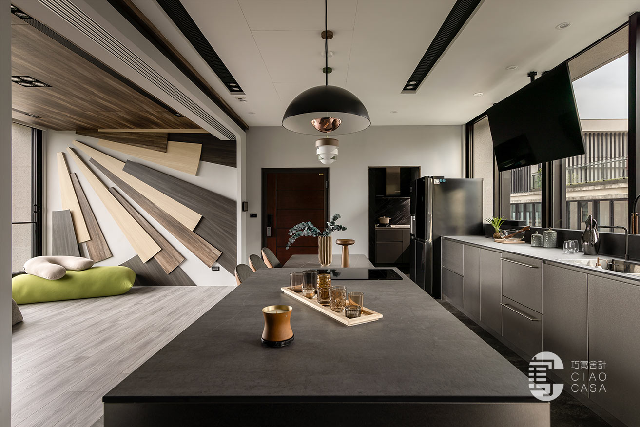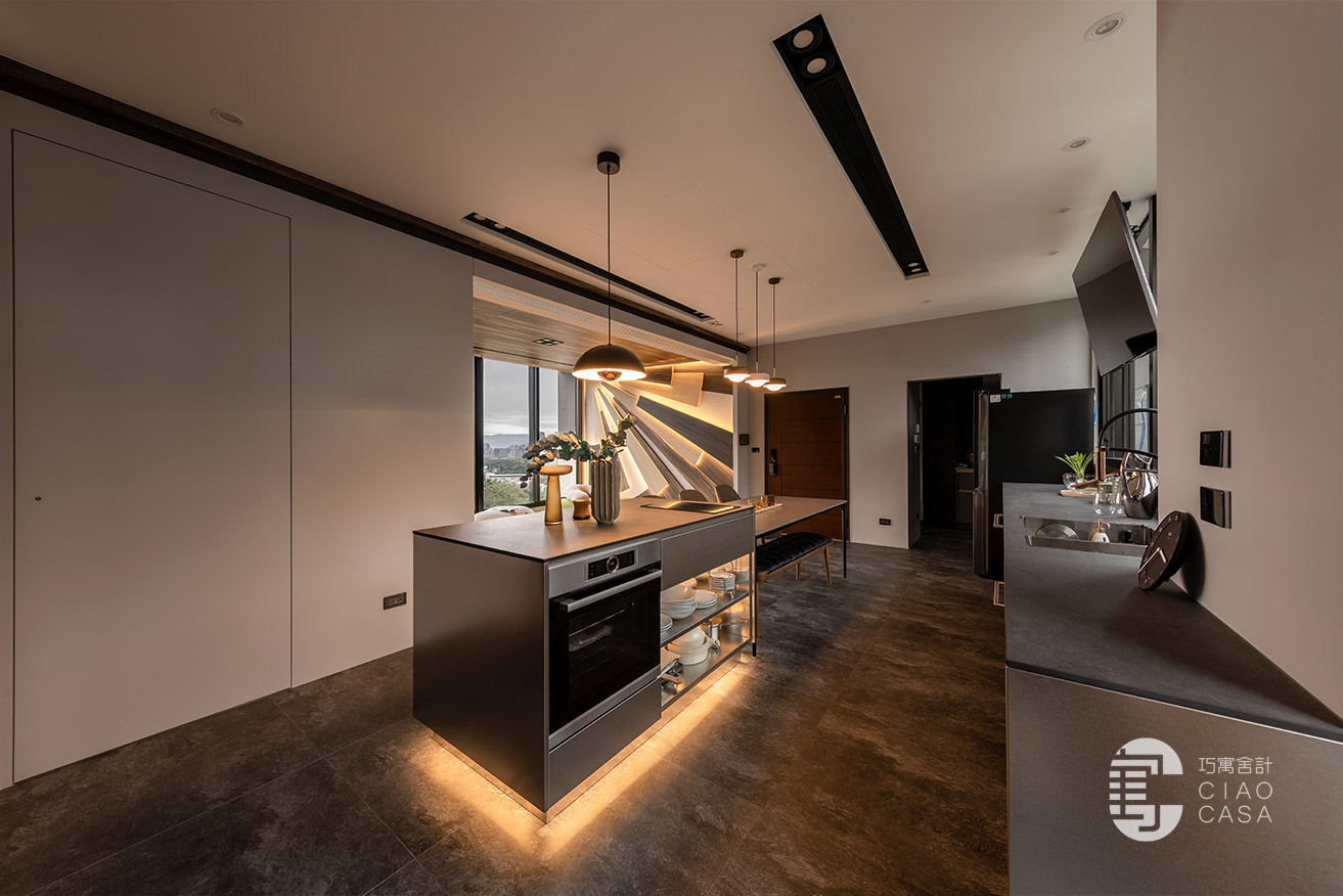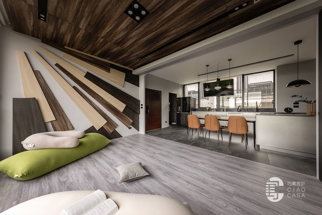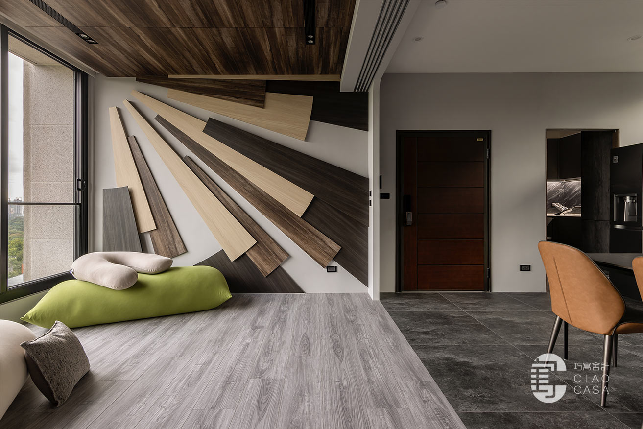 多功能與餐廳區域,最大亮點是壁面上的太陽意象設計,層層疊疊的木板堆砌出向外發散的樣貌,不僅增添視覺豐富度與層次感,還巧妙地結合了間接照明,創造出溫暖而引人入勝的光影變化。在這裡,時間似乎變得緩慢,每一刻都值得細細品味,使居住場所不僅是一種生活的藝術,更成為心靈的真正歸屬。
