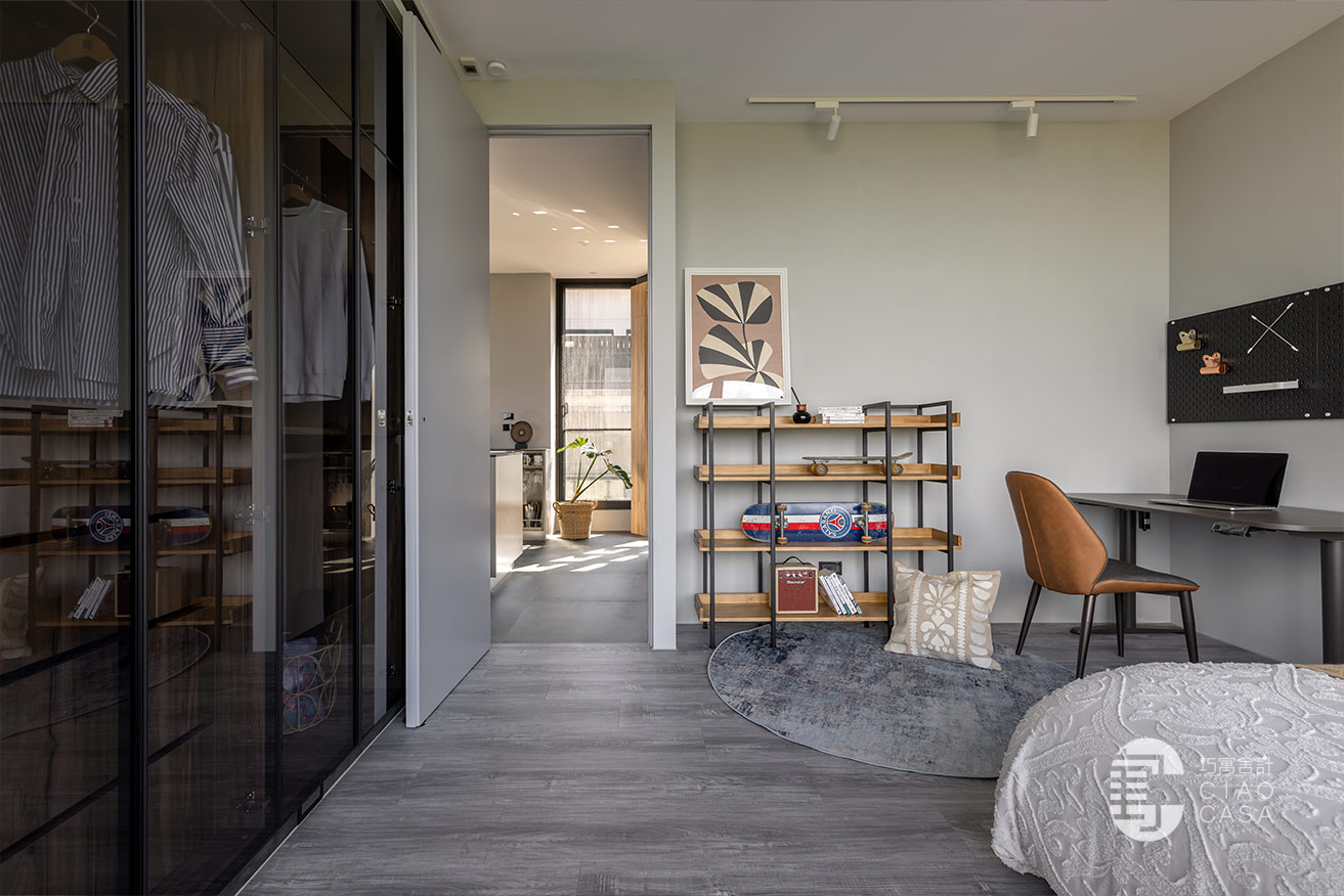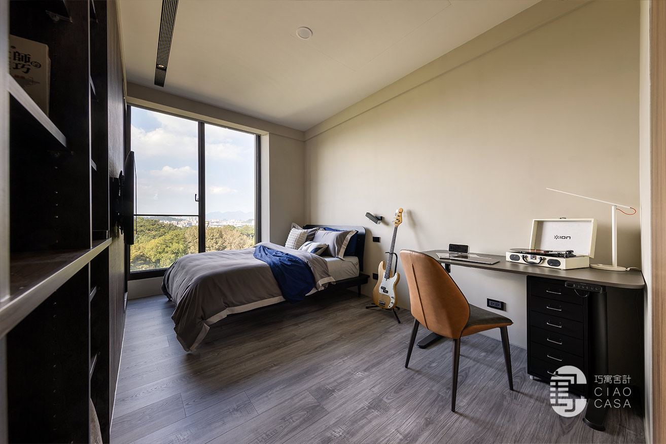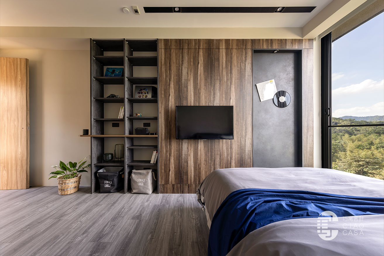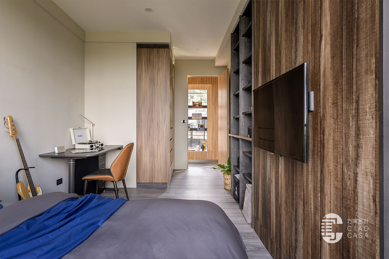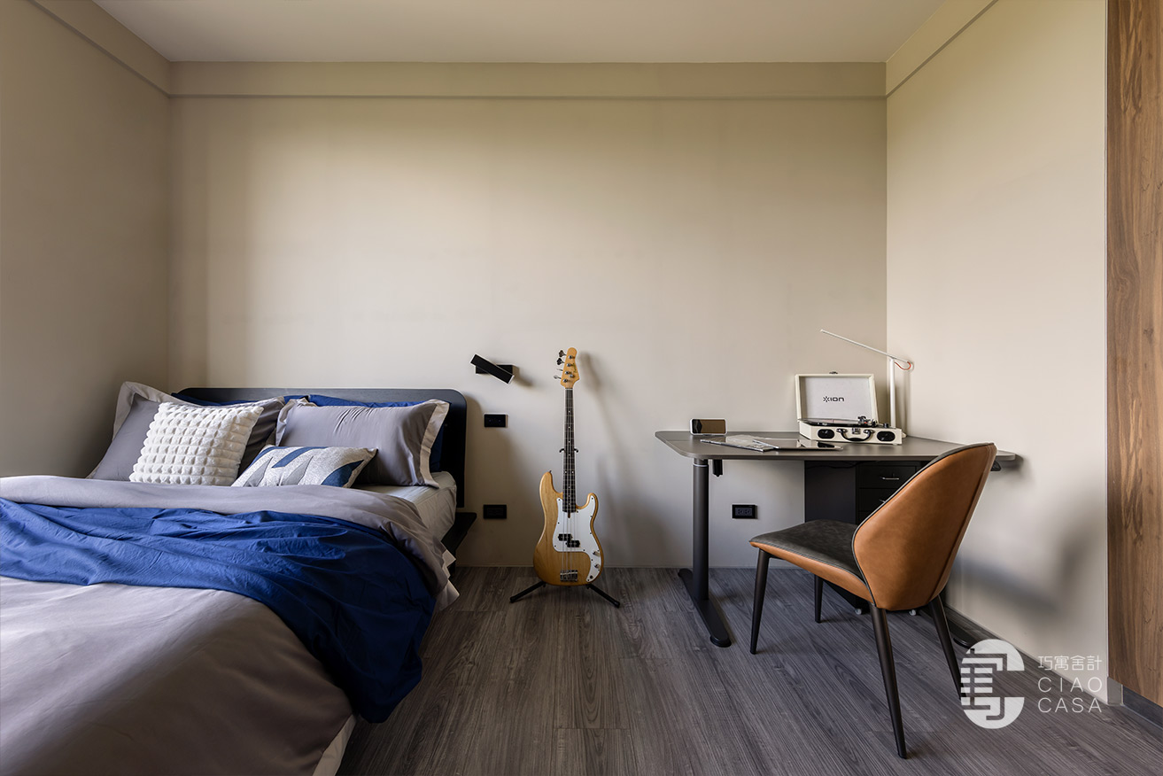 兒子臥室的床頭沒做太多造型,僅以灰調牆漆著色,設計師把焦點聚光在床尾的電視牆,因為兒子喜歡彈Bass,整間以深色系的知性、爵士風為基調,床尾右側的內凹仿鏽黑展示櫃,是兒子未來吊掛Bass的空間,設計師以金屬、木紋搭配,再度滿足了屋主對於異材質的喜愛。