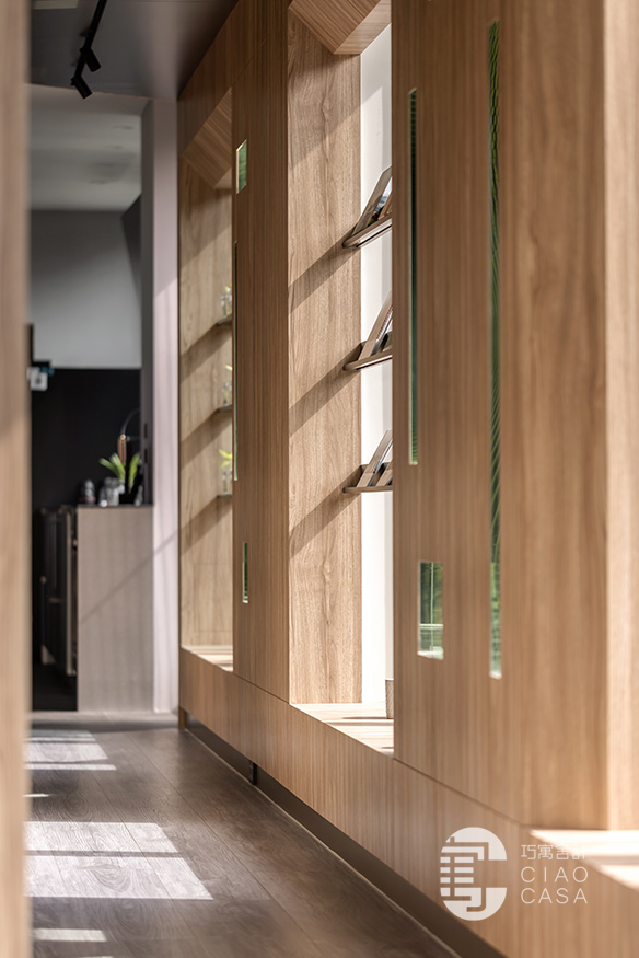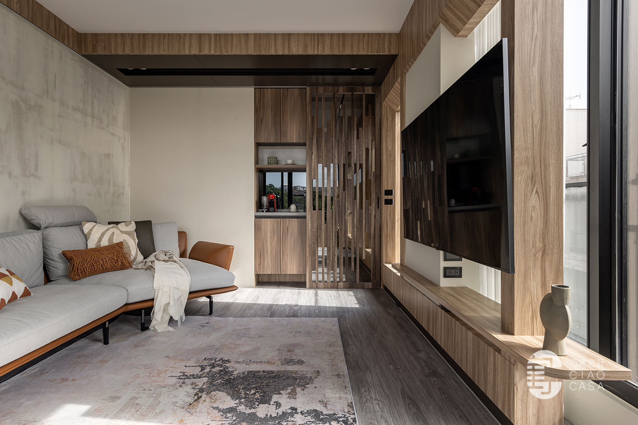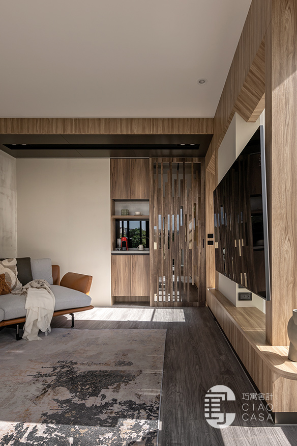 沙發旁線條錯落有致的木格柵造型牆,其實是一道滑門,當客廳需要獨立時便可推拉至走廊開口;為了方便屋主日常在客廳就能簡易清洗或喝水,一旁也規劃了一座精巧的茶水櫃。