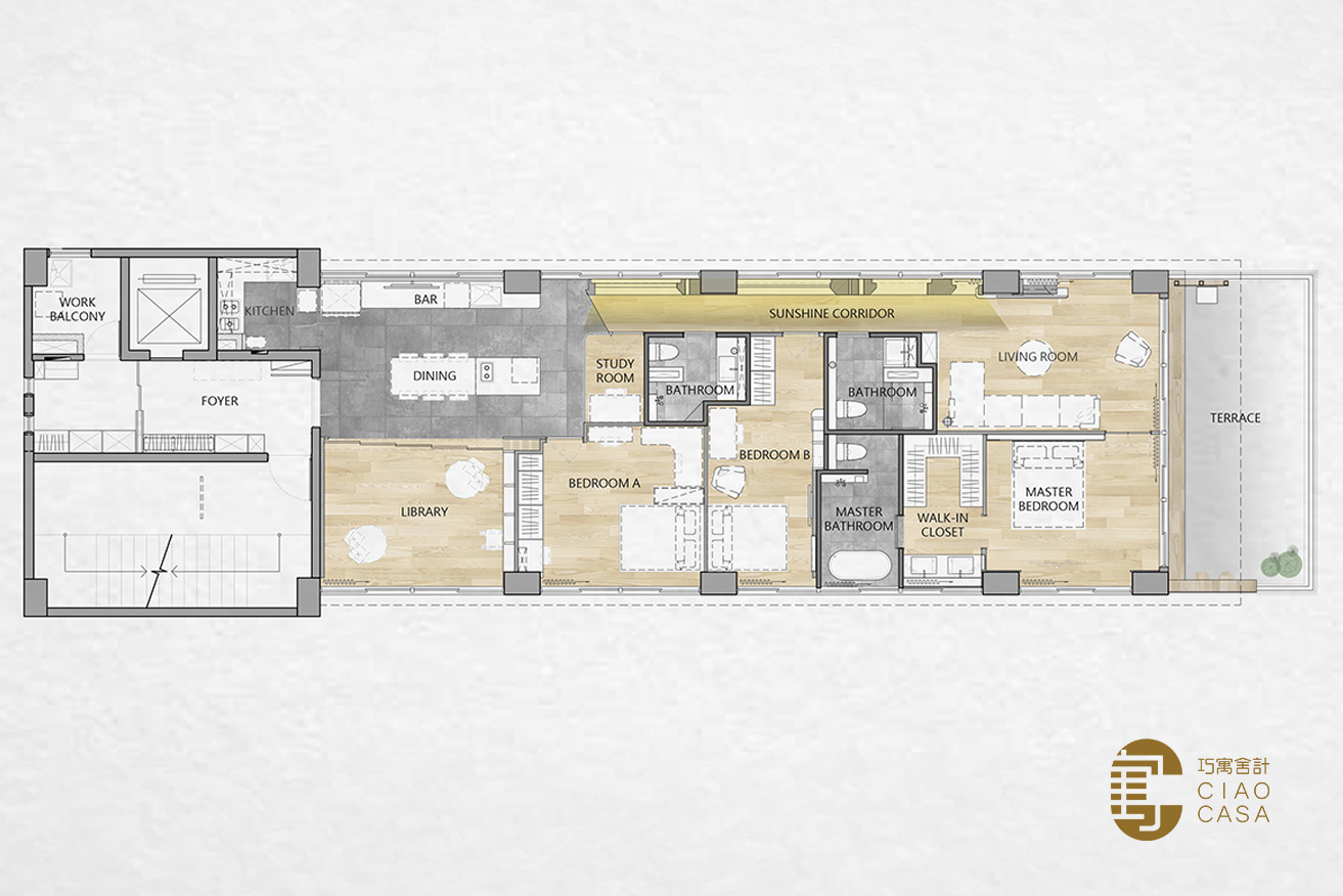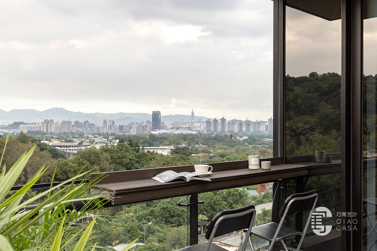 毛胚屋四面採光的絕佳格局,搭上鳥瞰台北101地標的觀景露臺,有著絕佳的地理位置,設計師以陽光走廊做為分界,將公私領域區分開,以廚房與多功能室做為家的中心,大面積落地窗外的綠景,帶入屋中,建構處處是景的森林系休閒宅,每個角落都有它的故事,每一束光線都有它的溫度。在這裡,時間似乎變得緩慢,每一刻都值得細細品味。不僅是居住的場所,更是一種生活的藝術,一次心靈的遠行。
