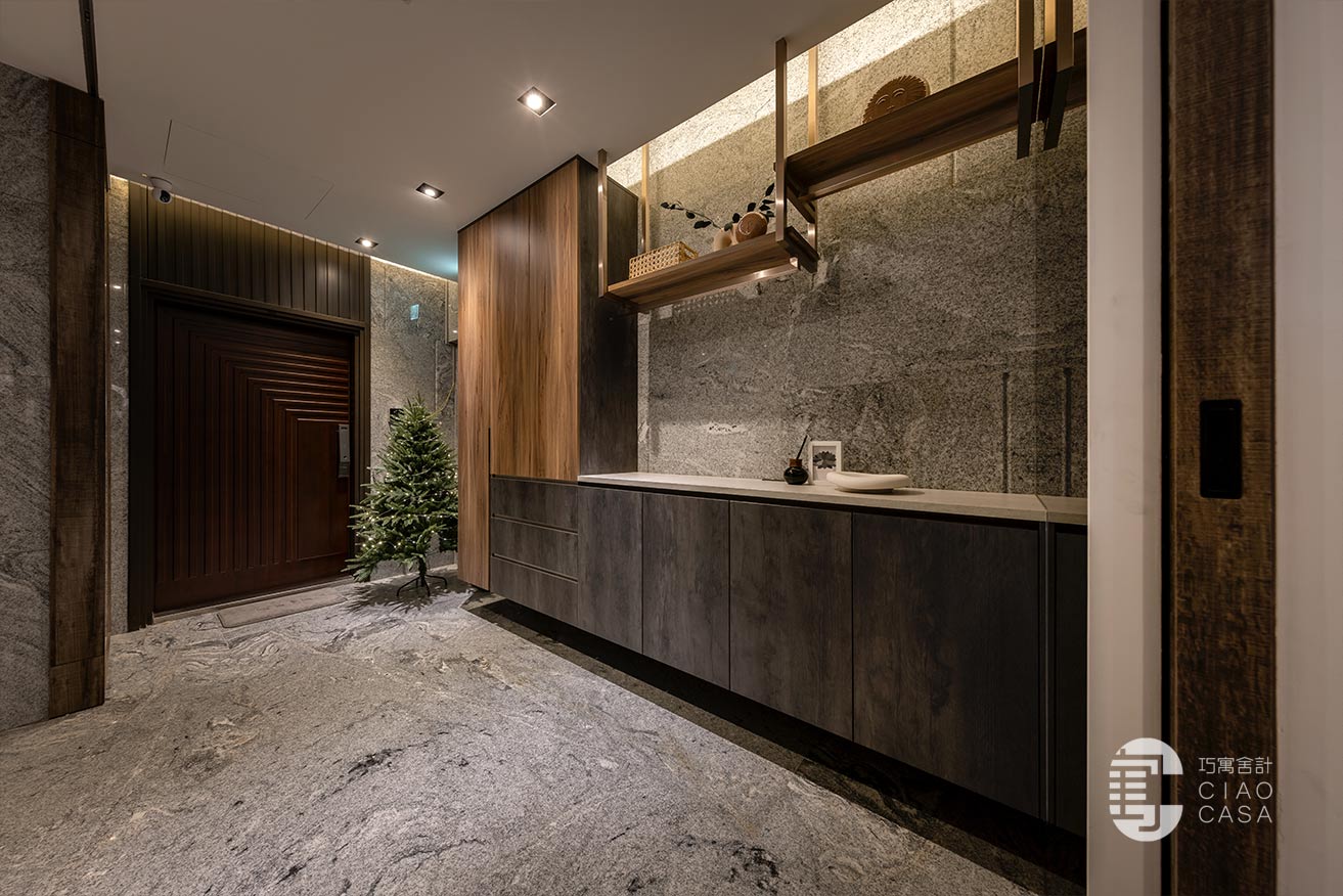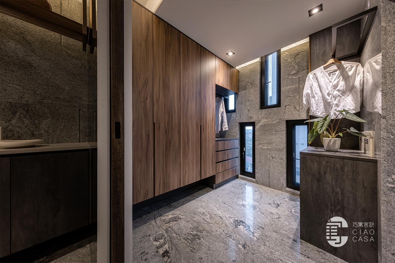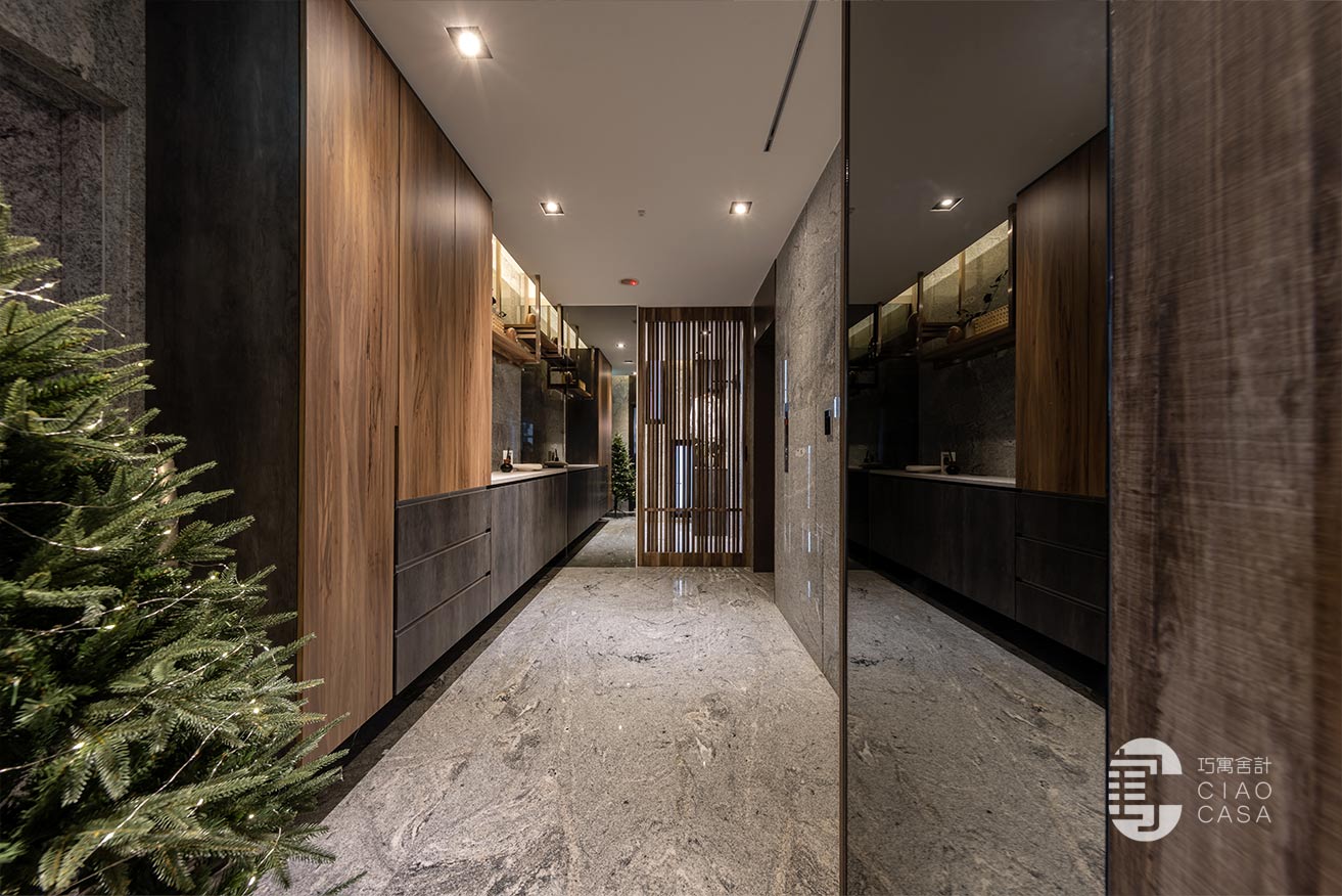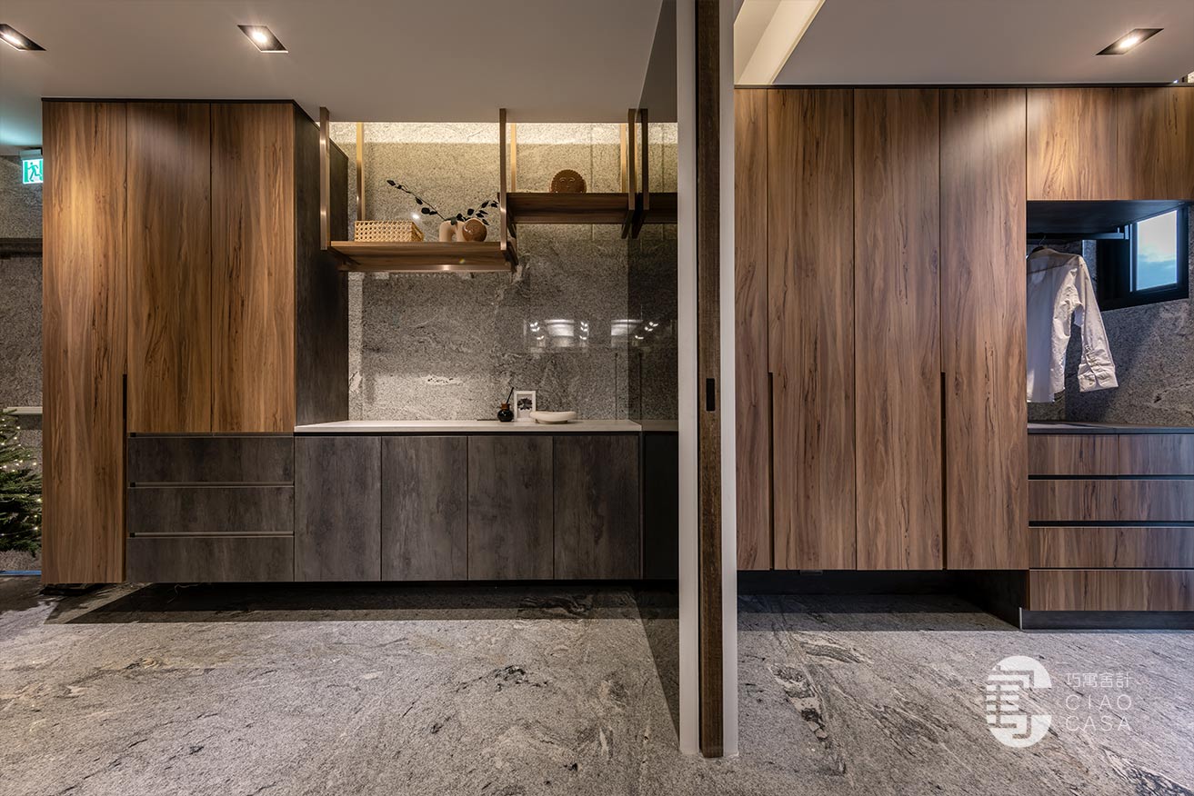 右側是洗衣間和鞋櫃、開放式衣帽櫃,藉由一道格柵門片和迎賓區做為區隔,左側靠近室內大門這邊除了有展示端景台之外,也安排了櫃體收納生活備品。屋主很喜歡異材質拼接的層次感,所以牆面維持建商原有的大理石材質,另結合了灰鏡、木格柵和鍍鈦(吊衣架)混搭。