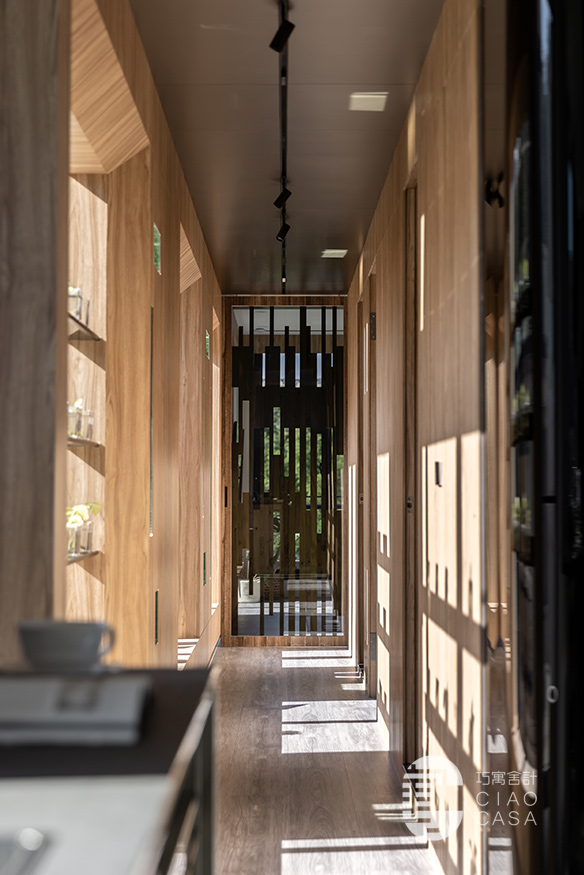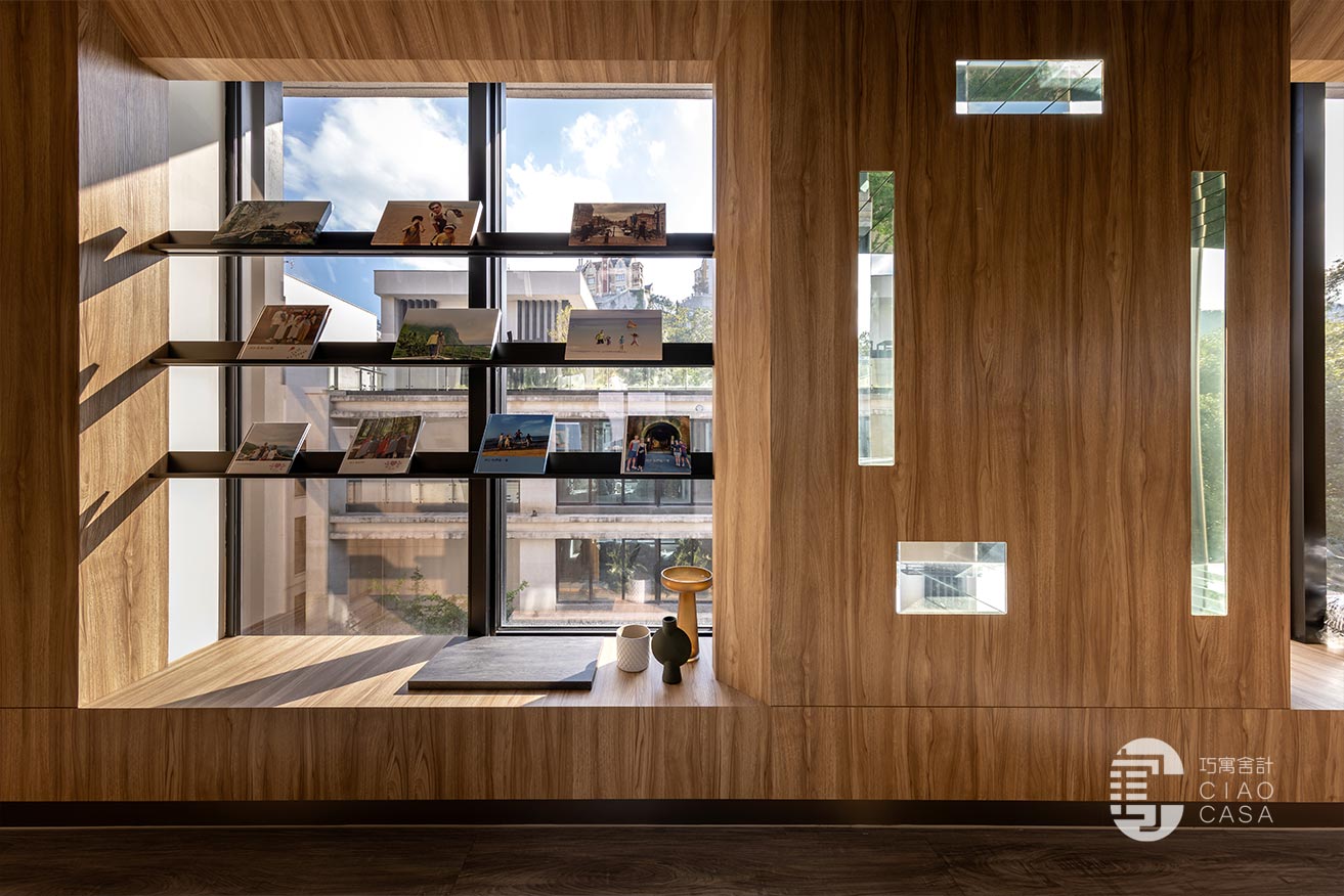 這一片木質立面還有一個設計巧思:局部刻意開了幾個小窗口,窗框內側貼覆鏡面,進一步映照出戶外綠意,呈現豐富的光影表現與觀看趣味。