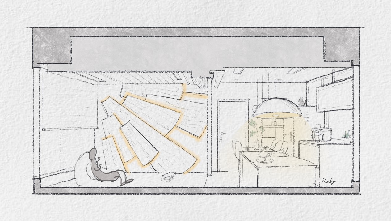 多功能區域的最大特點是其壁面上的太陽意象設計,這些多層次、有角度的木板不僅增添了視覺深度,還巧妙地結合了間接照明,創造出溫暖而引人入勝的光影效果。