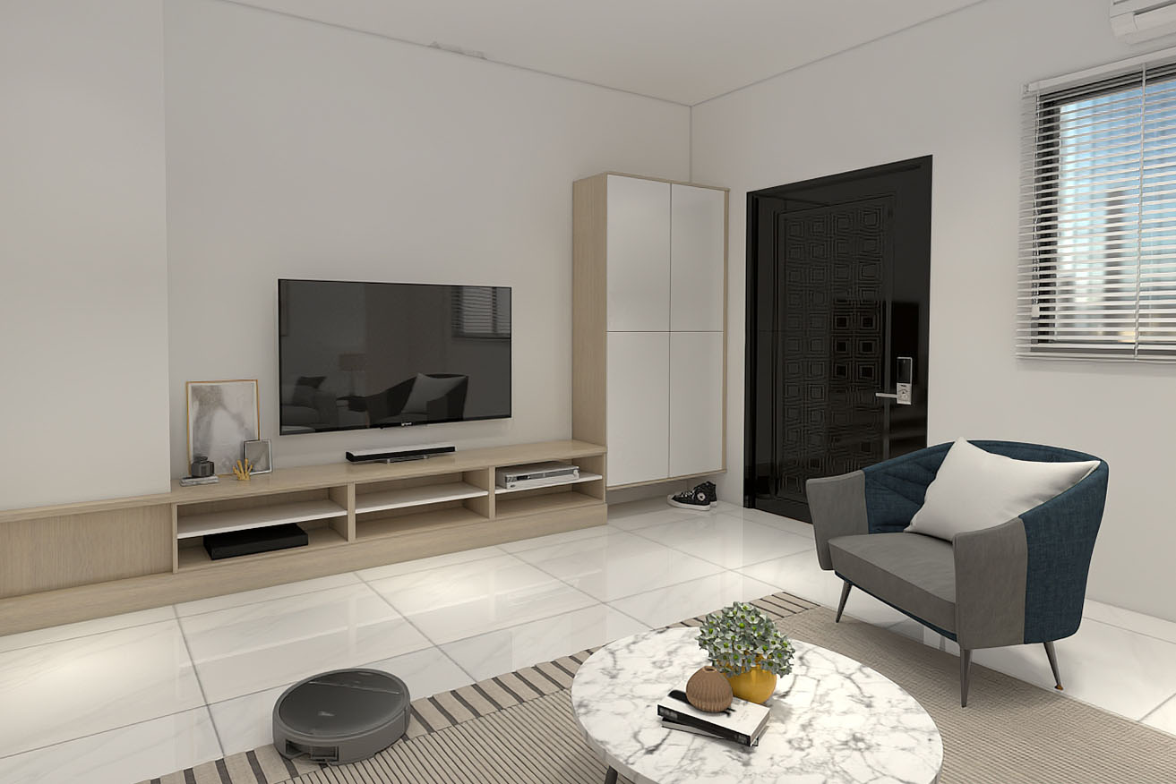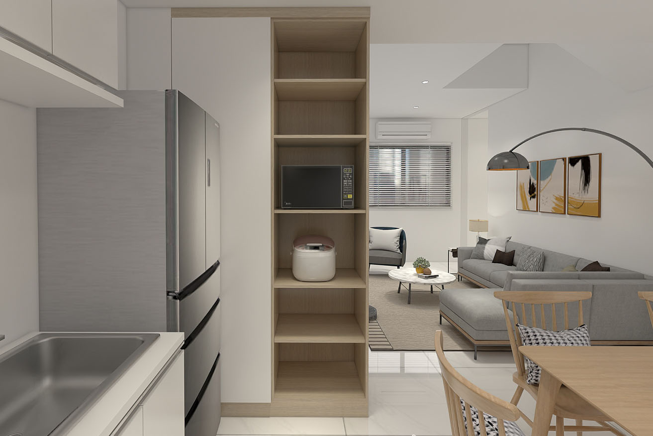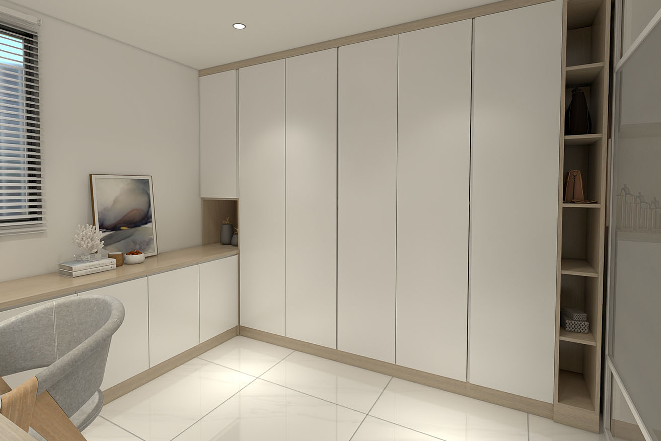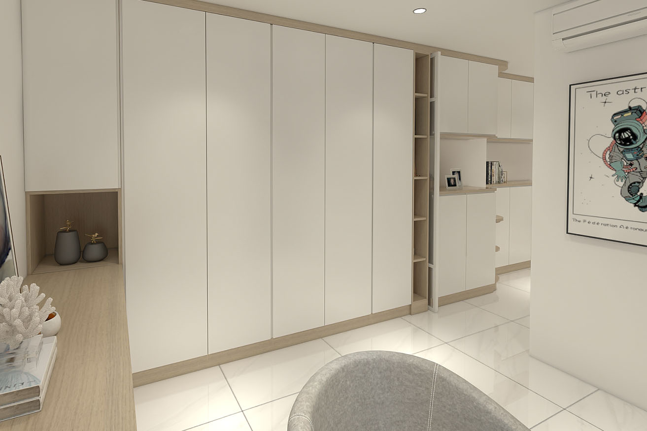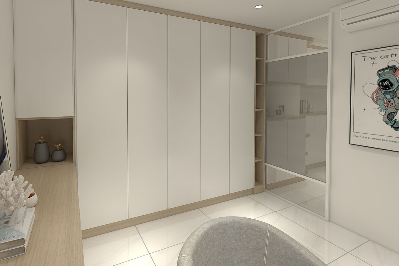 位於宜蘭市的透天新屋裝潢案例,屋主希望以白色元素、北歐風格為出發點,著重在收納機能上,楊育樺設計師透過收納櫃與電器櫃界定出客餐廳空間,以實木家具與地毯軟件營造溫潤感,二樓為臥室及更衣間功能,衣櫃結合了書桌空間的一體設計,將收納延伸。