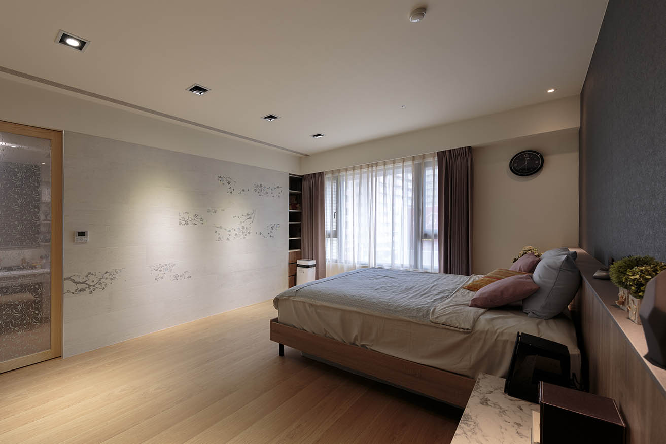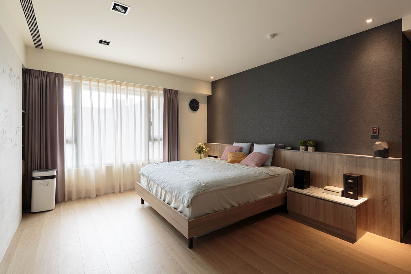 主臥以靜謐木色交織清新白色,烘托舒適放鬆的臥眠氛圍。以木紋搭配卡拉拉大理石紋的系統板材築起床頭櫃,上方採用仿板岩質感的灰黑色壁布挹注優雅品味,平衡整體視覺份量。