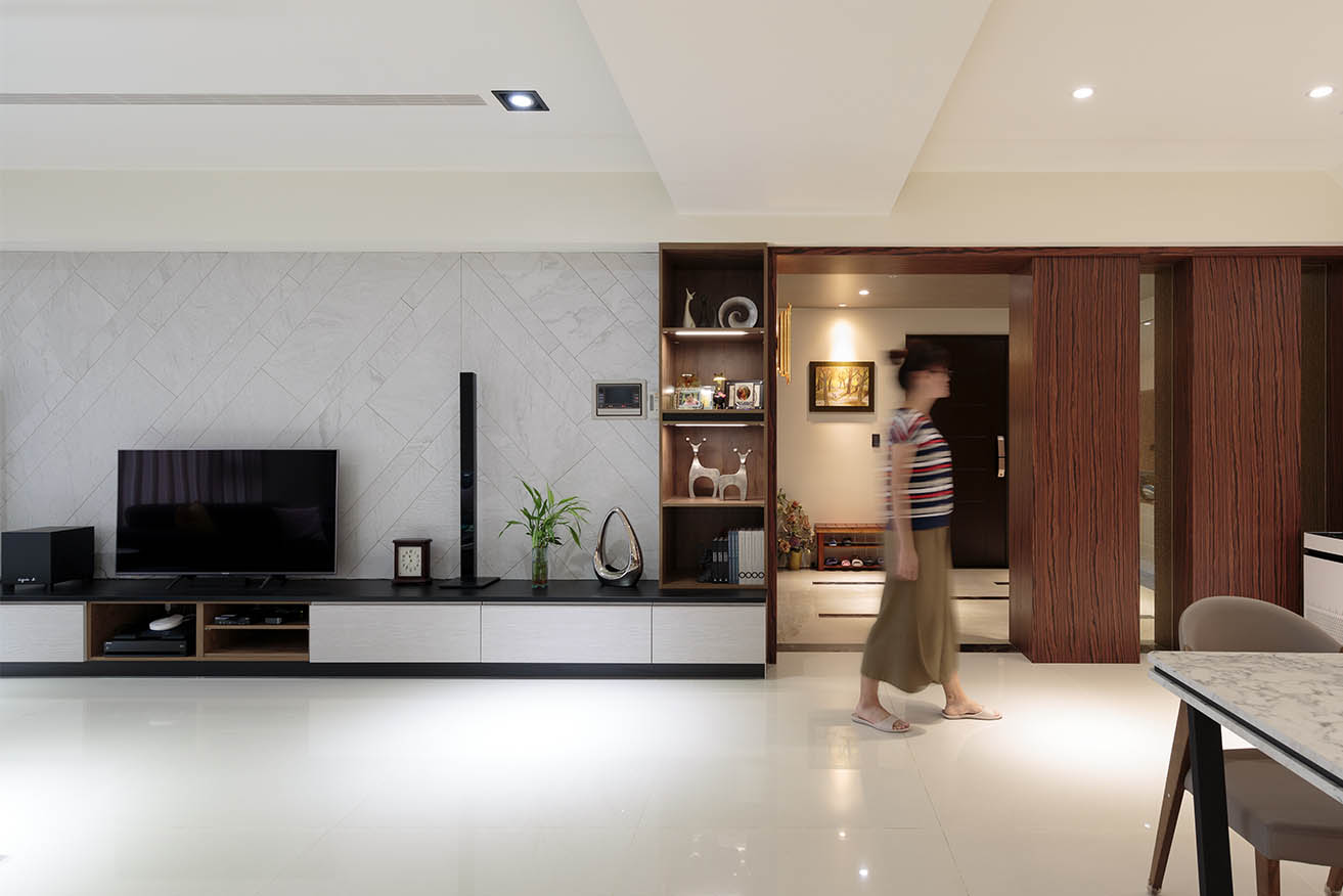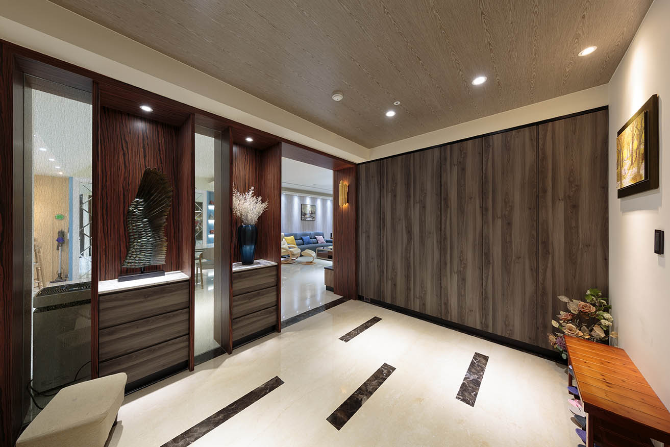 從大門敞開後,屋主希望玄關不是完全獨立的空間,又不想一眼即望見客餐廳,因此利用木工沿牆面、樑柱框出ㄇ字型框架,做為空間分野,結合卡拉拉大理石紋的系統板材與深棕色木紋系統板砌築端景櫃,下方抽屜方便置放信件等小物,並與玻璃交錯搭配,形塑兼具部分隱蔽部分通透的視覺端景效果。